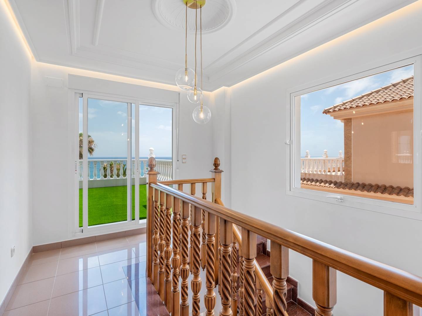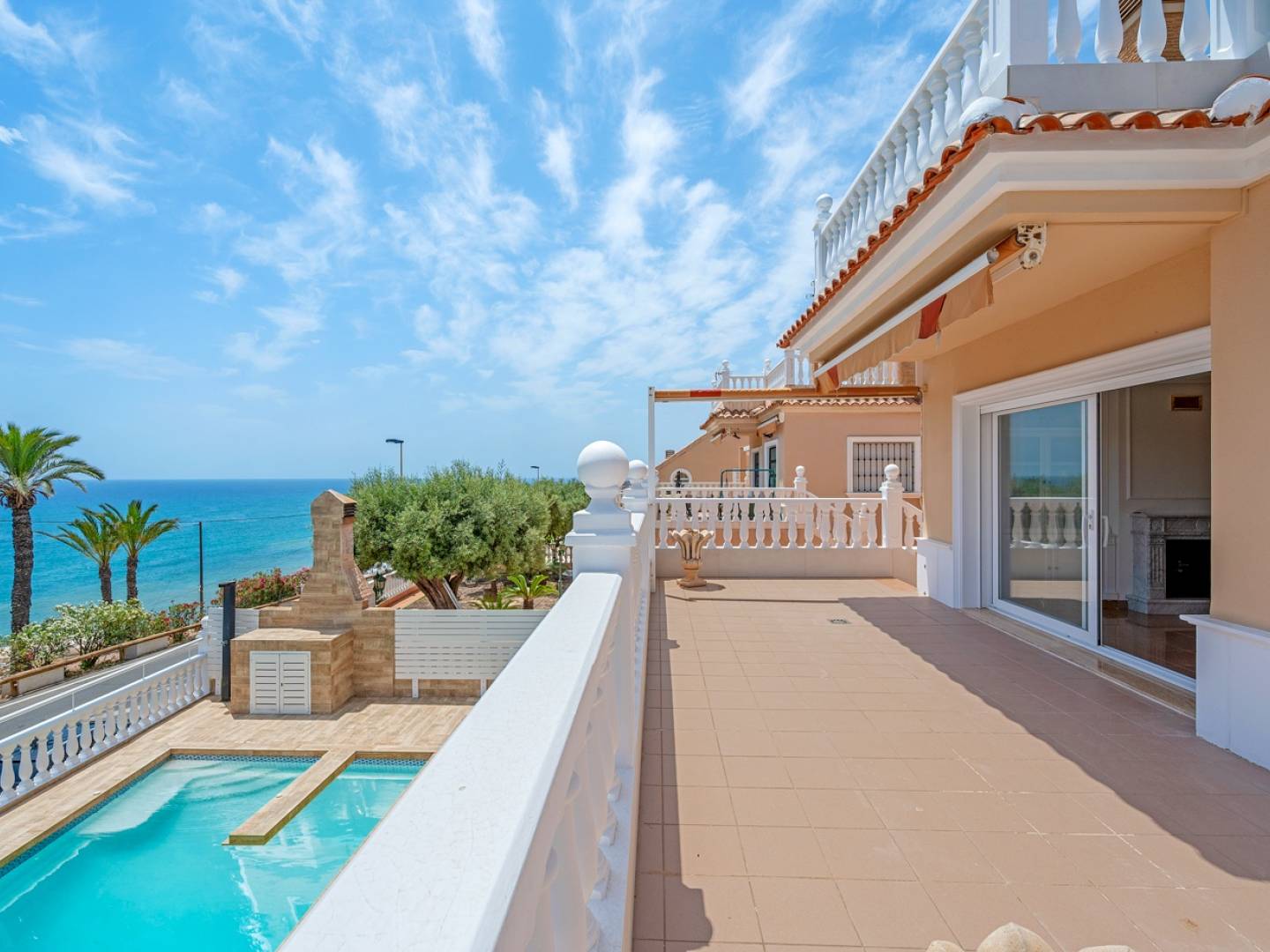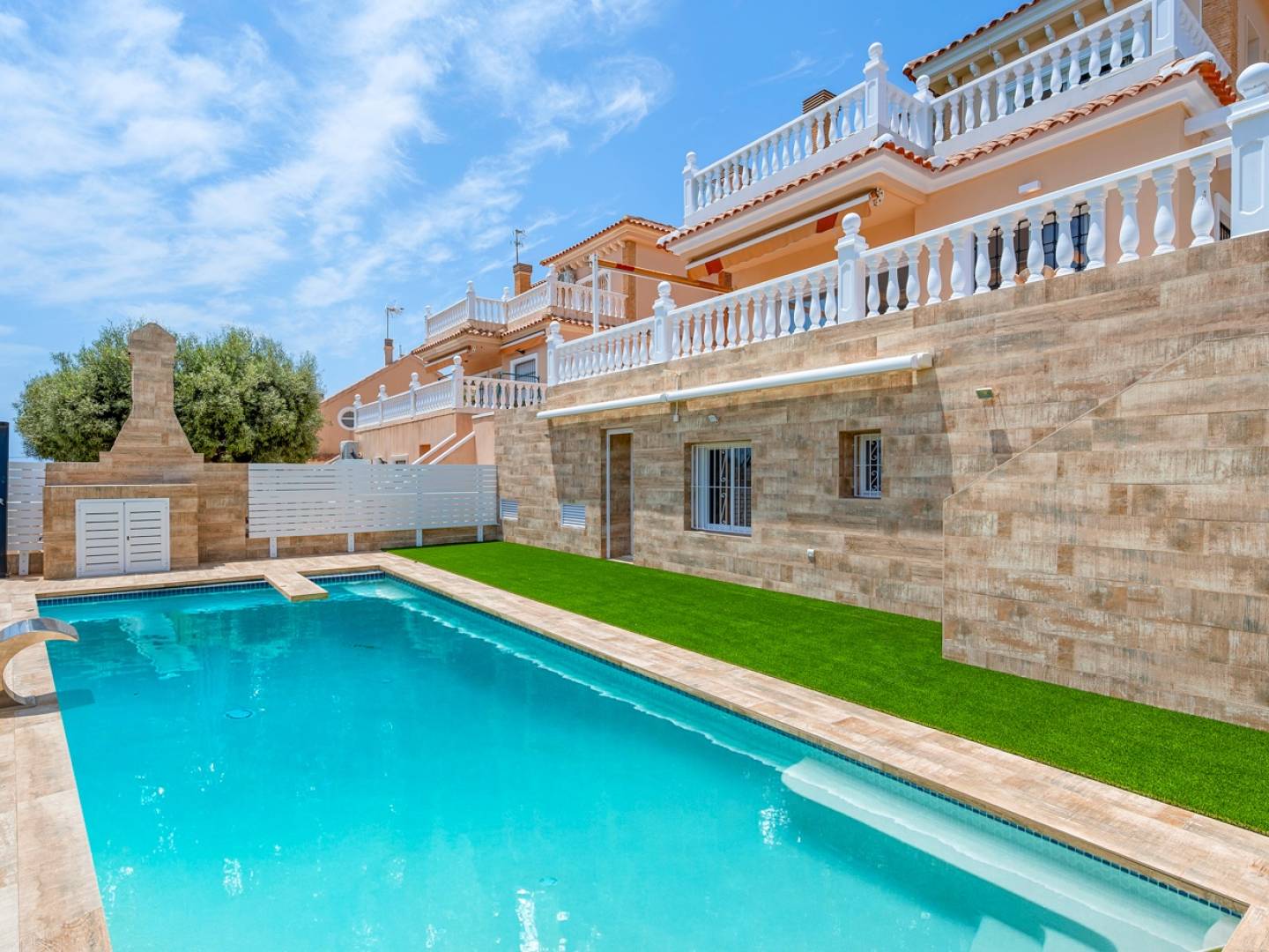 Cette élégante villa individuelle de 290 m², située dans le prestigieux complexe résidentiel El Faro à Torrevieja, a été récemment rénovée. Elle allie design moderne, fonctionnalité et emplacement privilégié avec une vue dégagée sur la mer Méditerranée. La maison est répartie sur trois niveaux. Le rez-de-chaussée comprend un double garage privé avec accès direct à la maison, une grande salle de loisirs idéale pour un home cinéma ou une salle de jeux, une cave à vin, une chambre supplémentaire, une salle de bain complète, une pièce technique avec réservoir de fioul et plusieurs espaces de rangement. L'accès direct à l'extérieur mène à une piscine privée entourée de gazon artificiel et d'une grande terrasse, parfaite pour profiter du climat méditerranéen. Le rez-de-chaussée principal dispose d'une cuisine indépendante entièrement équipée, dun salon-salle à manger lumineux avec cheminée, d'une chambre avec placard intégré et d'une salle de bain complète. Le salon donne sur une grande terrasse avec vue sur la mer, ainsi que sur plusieurs patios extérieurs propices à la détente ou aux repas en plein air. À l'étage supérieur, deux chambres supplémentaires avec accès à un large balcon offrant une vue sur la mer, ainsi qu'une salle de bain complète. Toutes les pièces sont spacieuses, lumineuses et dotées de placards intégrés. Parmi les équipements supplémentaires : climatisation, cheminée, buanderie, terrasse couverte, chauffage au fioul, débarras et parking supplémentaire sur la parcelle. La propriété est située dans une communauté fermée qui assure sécurité et tranquillité. Une opportunité rare pour ceux qui recherchent une maison rénovée avec vue sur la mer dans lun des quartiers résidentiels les plus prisés de Torrevieja.