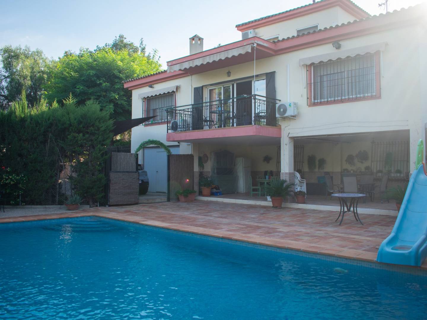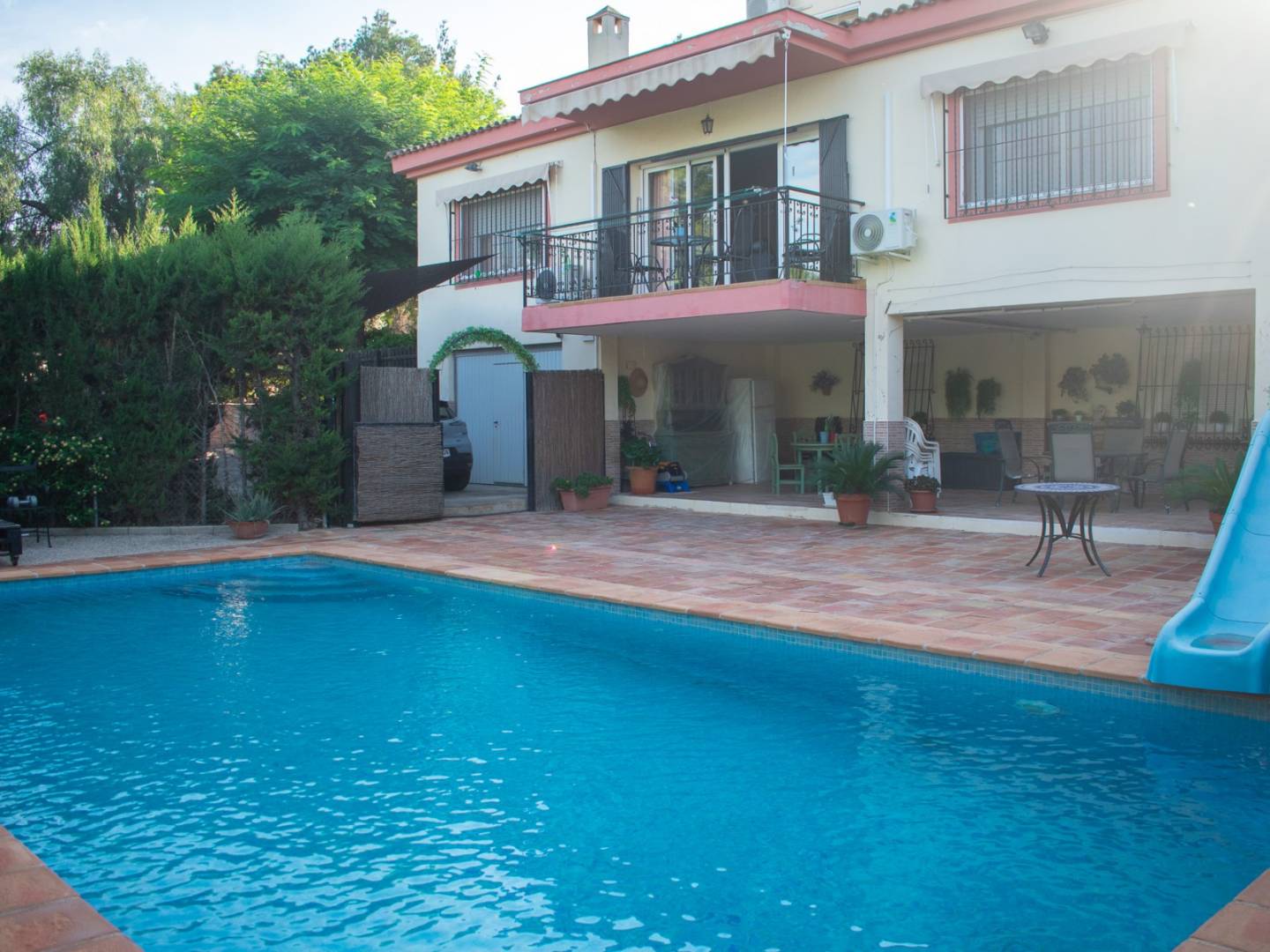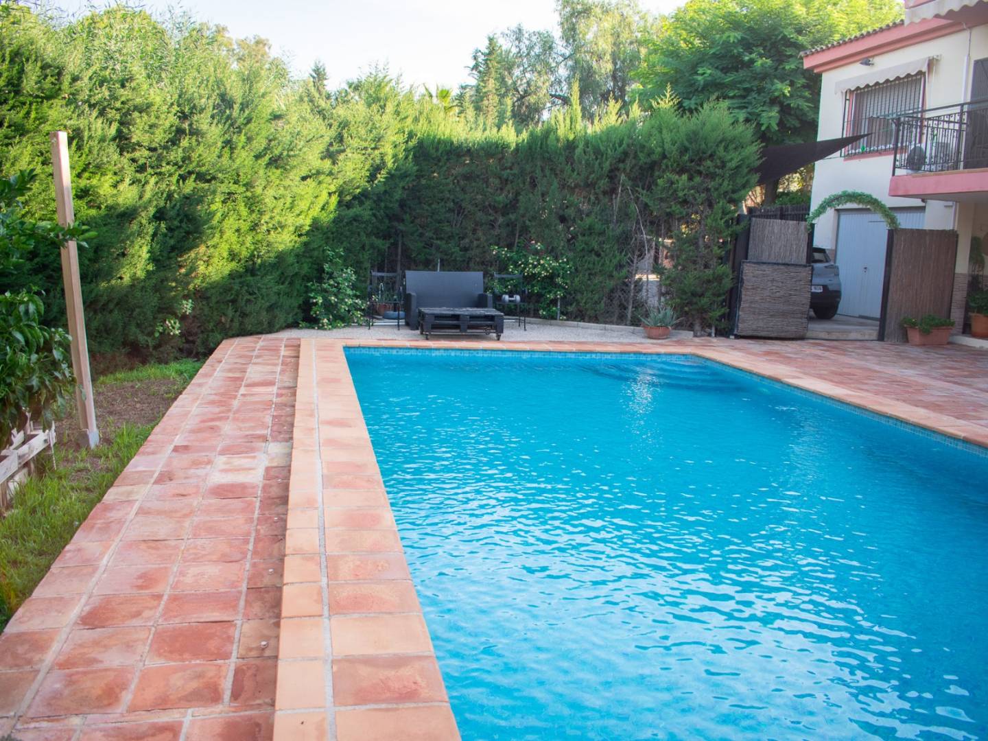 L' extérieur est une véritable oasis : il comprend une charmante piscine privée , un jardin arboré , un barbecue traditionnel en pierre , un salon extérieur , un local de rangement et un garage souterrain fermé , garantissant à la fois fonctionnalité et confort.