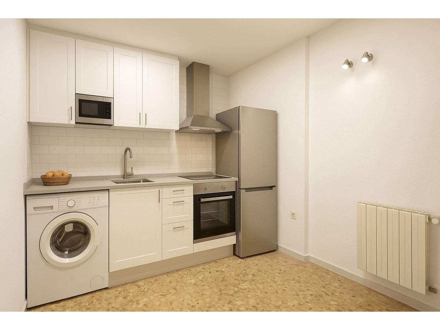 Il comprend une cuisine préinstallée , non encore assemblée, et des rendus 3D qui mettent en valeur le potentiel esthétique de l'espace, notamment de la cuisine et de la chambre secondaire.
