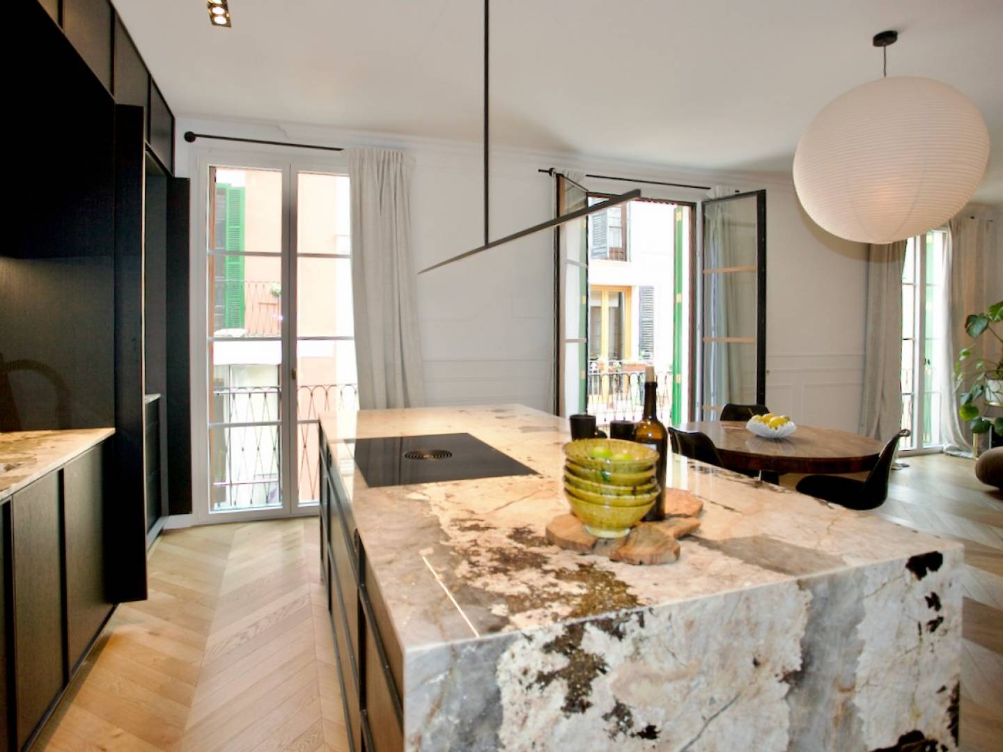 Cette propriété exceptionnelle est située dans une rue des plus charmantes et calmes, à deux pas de la très populaire rue piétonne commerçante Carrer dels Oms et de la célèbre « La Rambla », réputée pour ses nombreux fleuristes qui bordent les trottoirs du boulevard. Ce logement comprend un hall d'entrée impressionnant avec des portes vitrées entièrement recouvertes de miroirs et des placards intégrés, dont un superbe bar à cocktails. Le vaste séjour/salle à manger et la cuisine raffinée forment un espace ouvert. La cuisine est entièrement équipée d'appareils électroménagers et de meubles de rangement ultramodernes et dispose d'un grand îlot central avec un plan de travail en marbre effet cascade. Elle est également équipée d'un système d'osmose inverse fournissant de l'eau potable pure, plate, gazeuse et bouillante. Un deuxième salon/ troisième chambre est attenant au salon principal. Vestiaire/WC séparés. L'appartement comprend trois suites parentales. Les chambres 2 et 3 partagent une luxueuse salle de bains. La suite principale, très spacieuse, dispose d'une salle de bains ouverte avec douche et WC séparés, ainsi que d'un dressing entièrement aménagé. Cette chambre bénéficie également d'un bureau attenant, qui pourrait aussi servir de chambre d'enfant ou de quatrième chambre pour une jeune famille. Caractéristiques supplémentaires : Climatisation réversible intégrée dans tout lappartement. Parquet à chevrons dans tout lappartement. Parking optionnel disponible à la location. Remarque : Ce magnifique appartement se situe au 3e étage. On y accède par un escalier depuis le hall commun. Il ny a pas dascenseur.