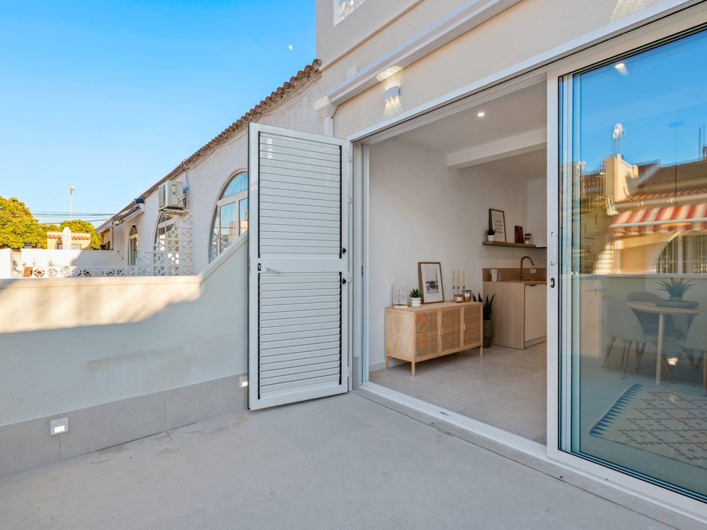 Maison moderne et lumineuse de 59 m² construits, récemment rénovée, avec un design contemporain soigné et des finitions aux tons neutres apportant chaleur et sensation despace.La distribution comprend 2 chambres, une salle de bain complète et un agréable espace salonsalle à manger ouvert avec cuisine intégrée entièrement équipée. La cuisine souvre sur le séjour, créant un espace fonctionnel et accueillant, idéal pour la vie quotidienne.Le salon donne directement accès à une terrasse privée, parfaite pour les petits-déjeuners en plein air ou les moments de détente, et bénéficie de grandes baies vitrées assurant une excellente luminosité naturelle toute la journée. Lespace nuit se compose dune chambre principale avec placards intégrés, dune seconde chambre polyvalente et dune buanderie indépendante, apportant confort et organisation. À lextérieur, la propriété se situe dans un environnement résidentiel calme, avec accès indépendant depuis la rue. Un escalier extérieur mène à un superbe solarium sur le toit, idéal pour profiter du soleil, de vues dégagées ou créer un espace chill-out.