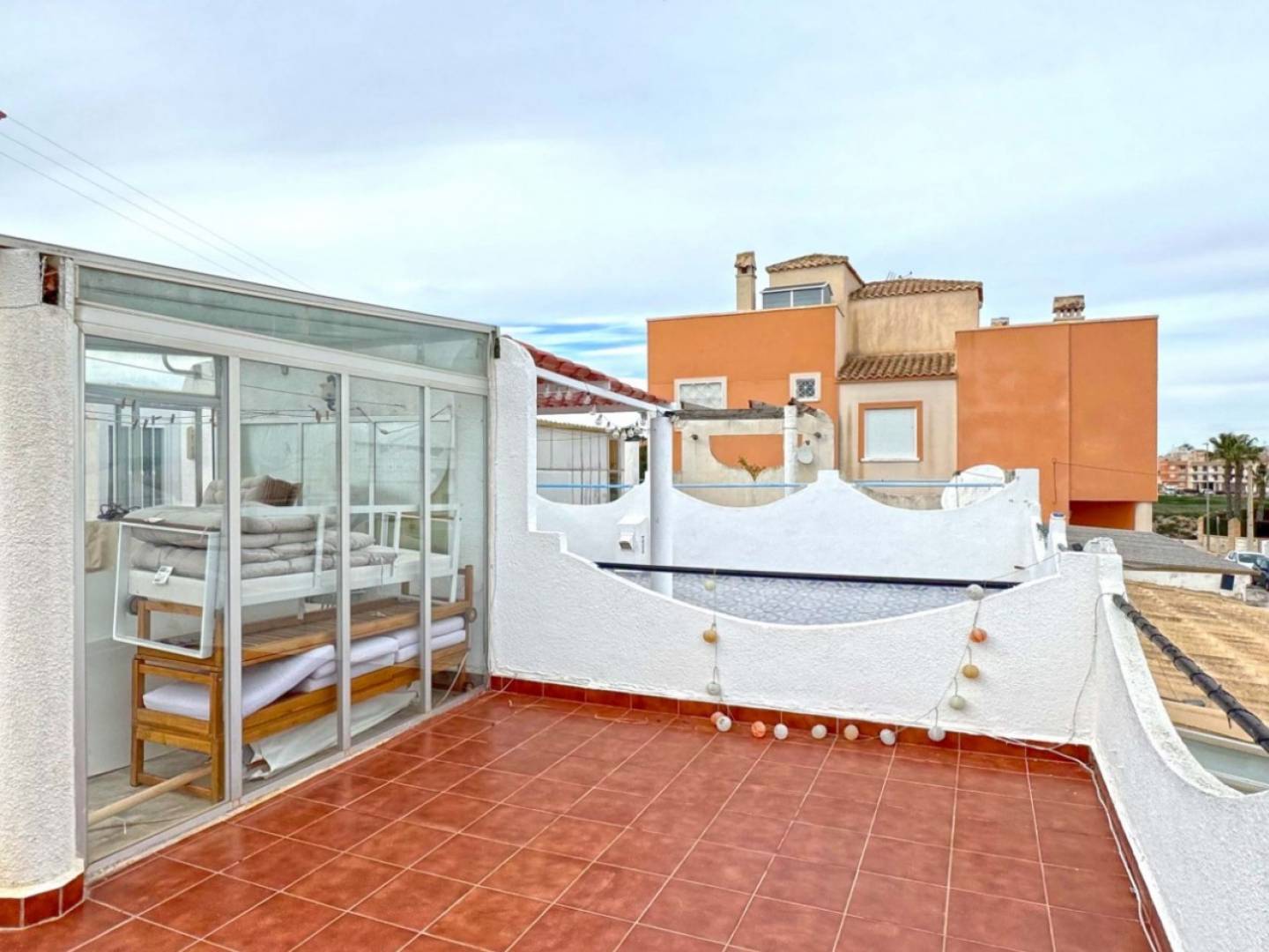 Située dans la charmante ville de San Miguel de las Salinas, cette villa jumelée, en excellent état, offre un cadre de vie confortable avec un généreux espace extérieur et une vue imprenable sur les lacs salés. La propriété comprend deux chambres, chacune dotée d'un placard intégré, et une salle de bains. Le propriétaire actuel a déjà acheté tous les matériaux nécessaires à la rénovation de la salle de bains ; vous n'aurez donc à prendre en charge que le coût de la main-d'œuvre. L'image de la salle de bains rénovée est une visualisation illustrant le rendu possible avec les matériaux choisis par le vendeur, qui seront laissés sur place. À l'intérieur, la maison propose un espace de vie ouvert comprenant salon et salle à manger, créant ainsi une pièce lumineuse et fonctionnelle. La villa est vendue entièrement meublée, prête à être habitée ou louée immédiatement. Les espaces extérieurs constituent un véritable atout, avec une terrasse, un patio et un jardin entourant la maison, idéaux pour profiter du climat espagnol. À l'étage, un solarium privé offre une vue magnifique sur les lacs salés, parfait pour bronzer ou se détendre. La propriété comprend également un sous-sol avec un espace de rangement supplémentaire, ainsi qu'une buanderie/débarras séparée avec chaudière. Orientée au nord, cette maison est idéale pour ceux qui recherchent une température intérieure agréable toute l'année. Une excellente option comme résidence secondaire, principale ou investissement locatif dans un secteur prisé de la Costa Blanca.