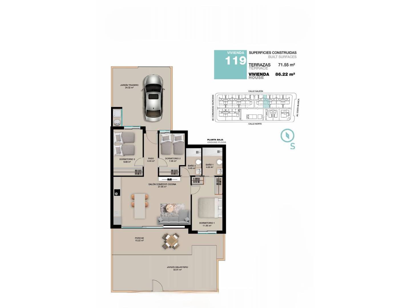 Bungalow au rez-de-chaussée avec une grande terrasse de 71,55m², avec de beaux espaces verts paysagers, une place de parking non couverte et une grande piscine commune. Intérieur de la maison de 86,22m² qui sont répartis dans un salon spacieux attaché à une grande cuisine américaine avec bar à petit-déjeuner à ISLA, trois chambres doubles, dont une en suite avec salle de bain attenante, deux chambres simples et une salle de bain séparée.