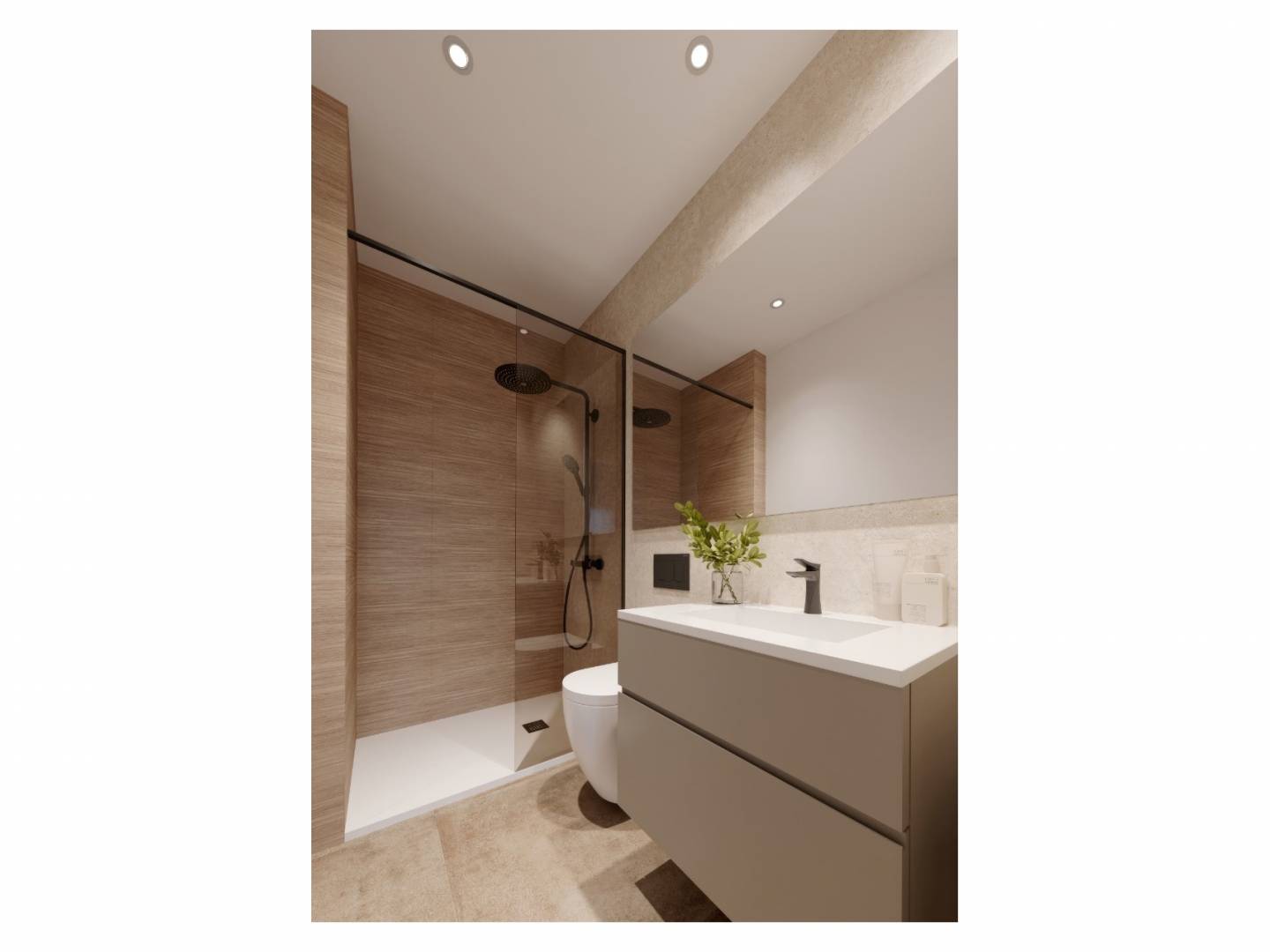 À l'intérieur, les logements sont conçus pour un confort et une fonctionnalité optimaux. Avec une configuration comprenant deux chambres et deux salles de bains, chaque espace est pensé pour offrir confort et intimité. Les appartements et les logements en rez-de-chaussée sont climatisés, garantissant un environnement agréable toute l'année. Des placards intégrés offrent un rangement efficace, pour des espaces toujours bien rangés. Le carrelage en porcelaine est non seulement esthétique, mais aussi facile d'entretien, idéal pour un mode de vie moderne et pratique.