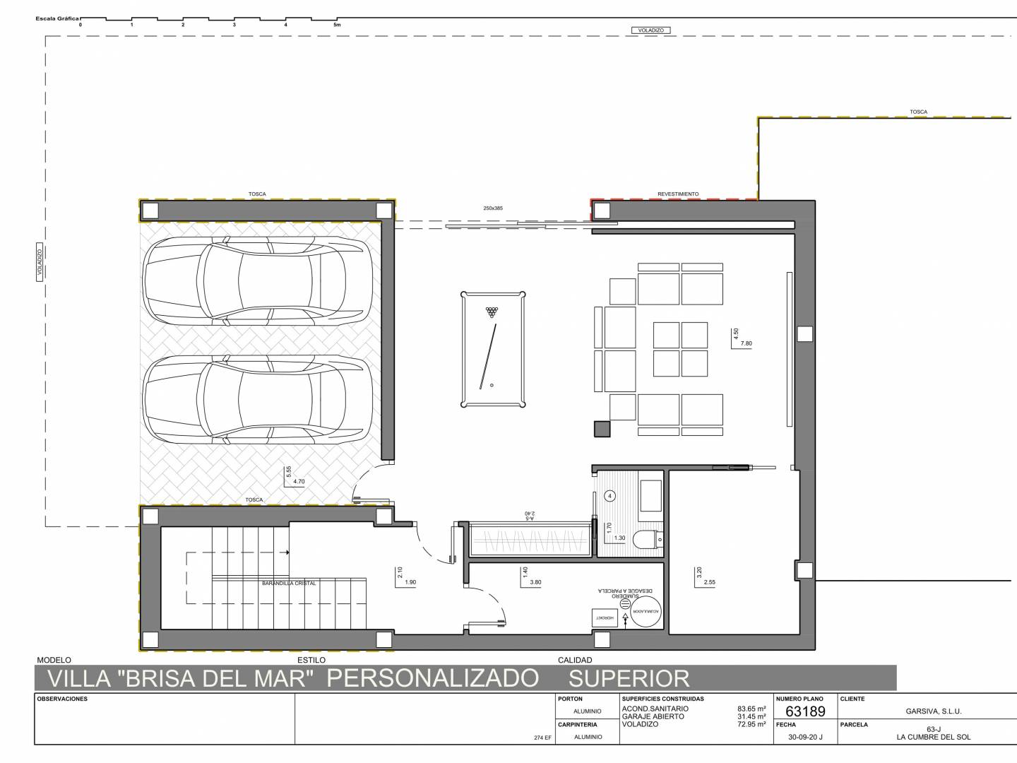 Le rez-de-chaussée de cette villa est entièrement dédié aux loisirs et au bien-être, tant à l'intérieur qu'à l'extérieur. On y trouve un garage double, une salle de bains, un cellier et un vaste séjour/salle à manger donnant directement sur la terrasse, la piscine et les différents espaces verts du jardin : un lieu luxueux pour se détendre, bronzer, regarder un film, nager ou simplement contempler la mer.
