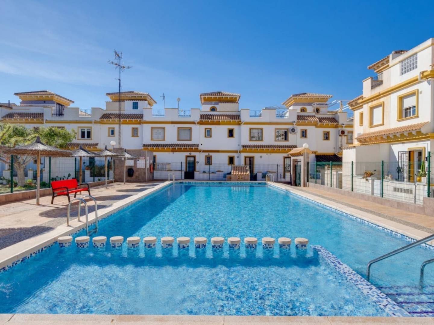 Située dans le quartier prisé d'Aguas Nuevas à Torrevieja, cette maison lumineuse et bien entretenue de 3 chambres et 2 salles de bain offre une surface habitable d'environ 90 m² et un agencement confortable en bon état. Bénéficiant d'une orientation nord-sud, elle profite d'une luminosité naturelle et d'une ventilation optimales tout au long de la journée. La propriété a été rénovée et comprend notamment de nouvelles fenêtres, la climatisation et un système de panneaux solaires, idéal pour un confort accru et des charges réduites. Ses deux sorties indépendantes constituent un atout pratique, offrant une grande flexibilité au quotidien. Charges approximatives (à titre indicatif) : taxe foncière (IBI) d'environ 235 € et charges de copropriété d'environ 90 € par trimestre. Une excellente opportunité pour une famille, une résidence secondaire ou un investissement locatif dans l'un des quartiers résidentiels les plus établis de Torrevieja.