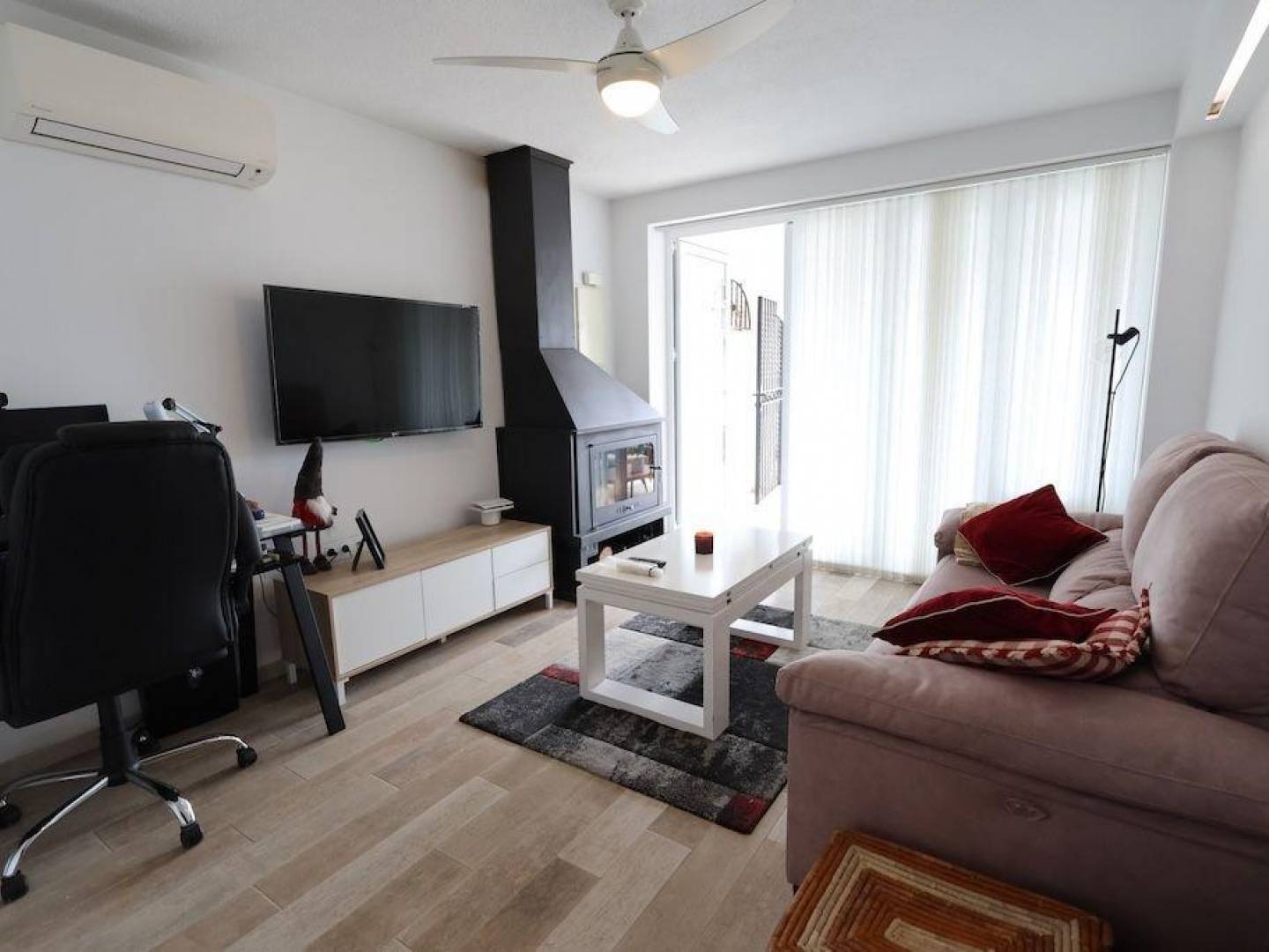 Magnifique maison mitoyenne duplex rénovée, orientée sud, située dans une impasse résidentielle à Cabo Roig, à quelques pas de la mer.. . Cette propriété spacieuse a une superficie d'environ 100 m2 et dispose d'un jardin privé d'environ 50 m2 avec barbecue et four, idéal pour profiter du plein air toute l'année. Elle fait partie d'une communauté fermée avec places de parking et espaces verts.. . L'une de ses caractéristiques les plus intéressantes est son agencement sur deux étages avec des entrées et des espaces séparés qui permettent de les utiliser indépendamment. En ajoutant une cuisine à l'étage supérieur, elle pourrait facilement être convertie en deux maisons séparées, ce qui en fait une option d'investissement très intéressante : louer une partie et utiliser l'autre pour y vivre ou passer des vacances. . . Elle dispose au total de 4 chambres et 3 salles de bains. Disposition :. . Rez-de-chaussée : cuisine ouverte sur un spacieux salon-salle à manger avec placard intégré et débarras, 1 chambre et 1 salle de bain complète avec douche.. . Étage supérieur : terrasse vitrée avec rideaux en verre et vue dégagée, salon-salle à manger avec cheminée et climatisation, 3 chambres doubles avec placards et 2 salles de bain complètes avec douche.. . Bien que la communauté ne dispose pas de piscine, il y en a une à quelques mètres, accessible sur abonnement.. . Une propriété polyvalente, lumineuse, spacieuse et bien située, idéale comme investissement, résidence permanente ou pour profiter de vos vacances à la mer.