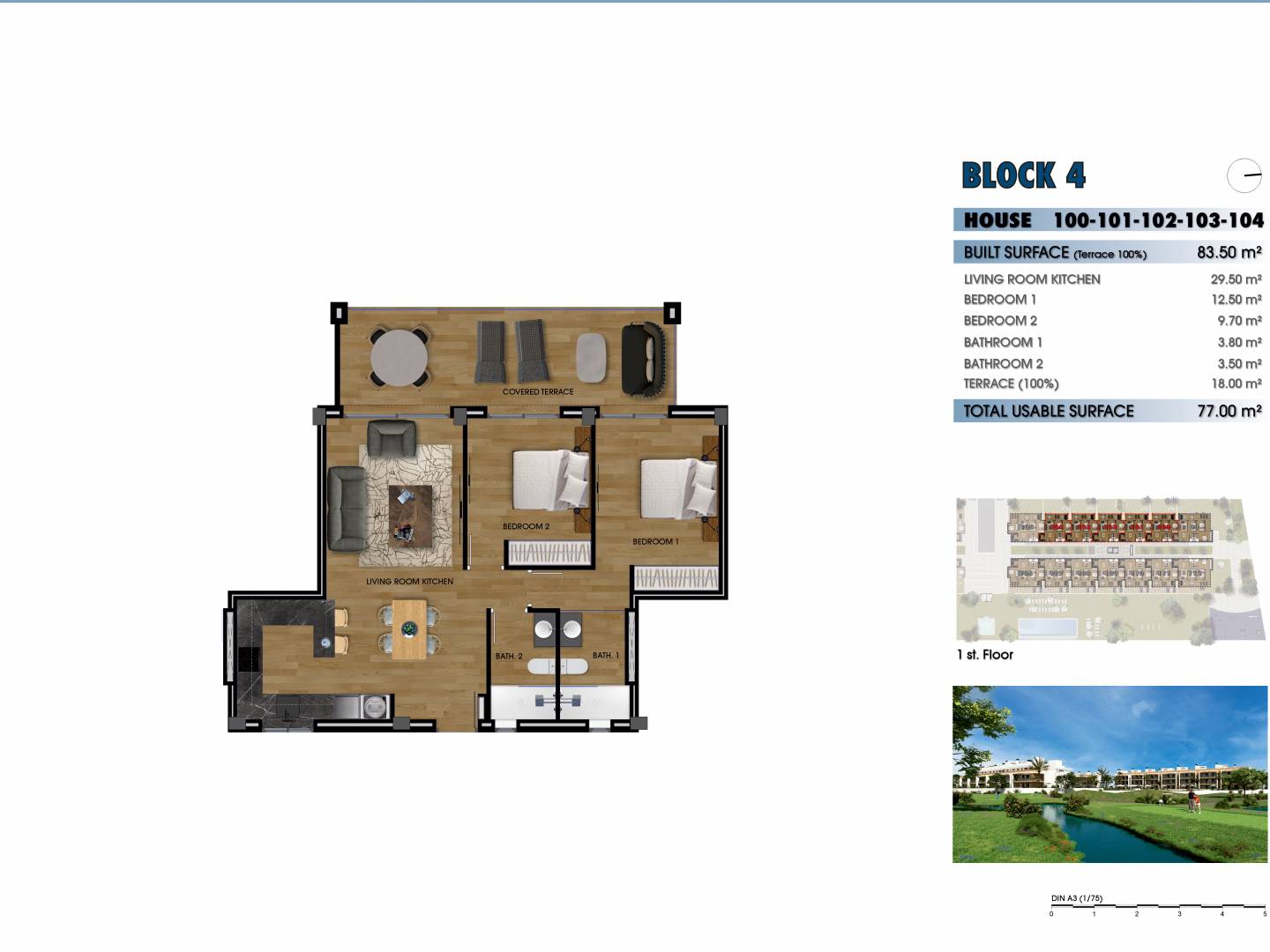 Chaque appartement dispose de deux ou trois chambres et de deux salles de bains, garantissant un espace suffisant pour votre confort. Les propriétés sont agrémentées de jardins et de terrasses privés, offrant un cadre idéal pour les loisirs en plein air et les divertissements. Les intérieurs présentent un élégant carrelage en porcelaine, alliant style et entretien facile pour créer un environnement de vie sophistiqué mais pratique.