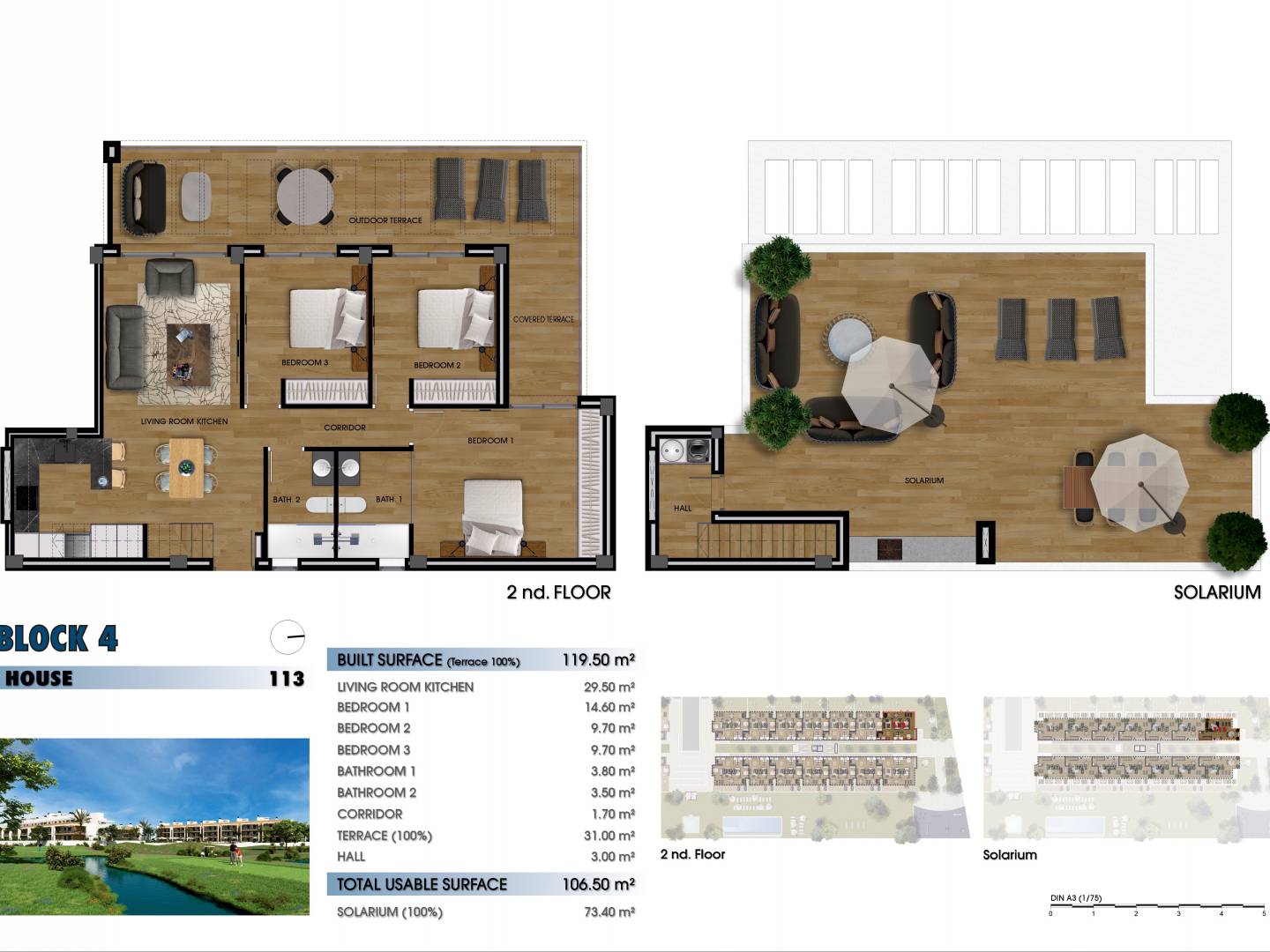 Chaque appartement dispose de deux ou trois chambres et de deux salles de bains, garantissant un espace suffisant pour votre confort. Les propriétés sont agrémentées de jardins et de terrasses privés, offrant un cadre idéal pour les loisirs en plein air et les divertissements. Les intérieurs présentent un élégant carrelage en porcelaine, alliant style et entretien facile pour créer un environnement de vie sophistiqué mais pratique.