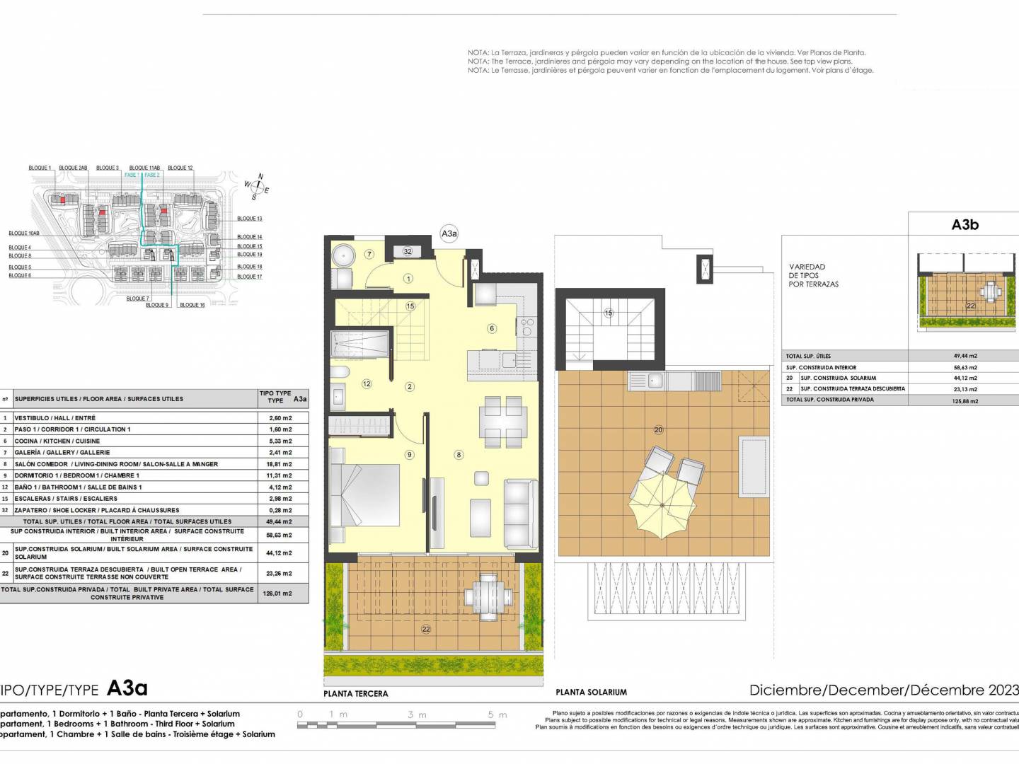 Les extérieurs de ces propriétés sont conçus pour maximiser le confort et le plaisir du climat méditerranéen. De nombreuses propriétés disposent de terrasses et de jardins privés, idéaux pour se détendre ou profiter de repas en plein air. De plus, certaines propriétés offrent des solariums, parfaits pour bronzer en toute intimité. La présence de piscines privées dans certaines typologies ajoute une touche de luxe et d'exclusivité. Les propriétés sont également équipées de pergolas, qui apportent ombre et style aux espaces extérieurs. La possibilité de recharger des véhicules électriques est un ajout moderne qui reflète un engagement envers la durabilité.