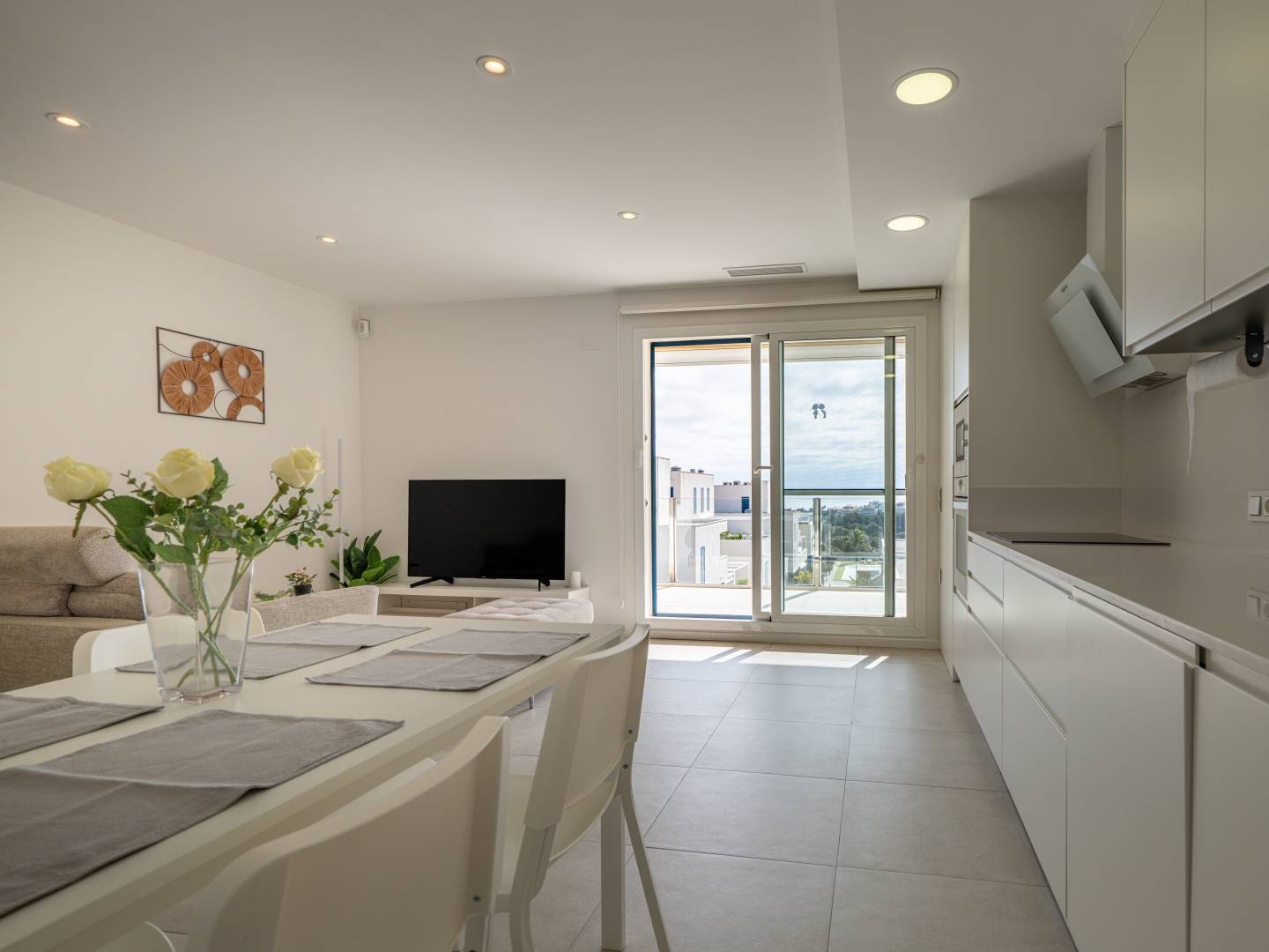 Situé dans un emplacement exceptionnel en bord de mer à Playa Flamenca, ce superbe penthouse offre une vue imprenable sur la mer Méditerranée. Une propriété unique pour ceux qui recherchent calme, confort et un cadre privilégié face à la mer. Le bien est lumineux, moderne et entièrement prêt à emménager. Lespace de vie est ouvert et spacieux et donne directement accès à la terrasse ensoleillée. La cuisine entièrement équipée ainsi que la chambre confortable avec placards intégrés assurent un excellent niveau de confort, aussi bien pour un usage personnel que pour la location. La terrasse est sans aucun doute lun des principaux atouts de ce penthouse. Grâce à son orientation idéale, vous profitez à la fois dune vue sur la mer et sur la piscine commune. Un endroit parfait pour prendre le petit déjeuner au soleil ou se détendre lors des longues soirées dété. Un avantage supplémentaire est la possibilité dacheter séparément deux grandes places de parking souterrain dans le garage sécurisé de la résidence, un atout rare dans la région. Lemplacement est excellent. À distance de marche se trouvent les plages de Playa Flamenca, divers commerces, supermarchés et restaurants, ainsi que le centre commercial populaire La Zenia Boulevard. Les installations sportives et les terrains de golf sont également à proximité. Ce penthouse constitue un choix idéal comme résidence secondaire, investissement locatif ou résidence permanente sur la Costa Blanca. Une propriété qui combine parfaitement vue, confort et emplacement.