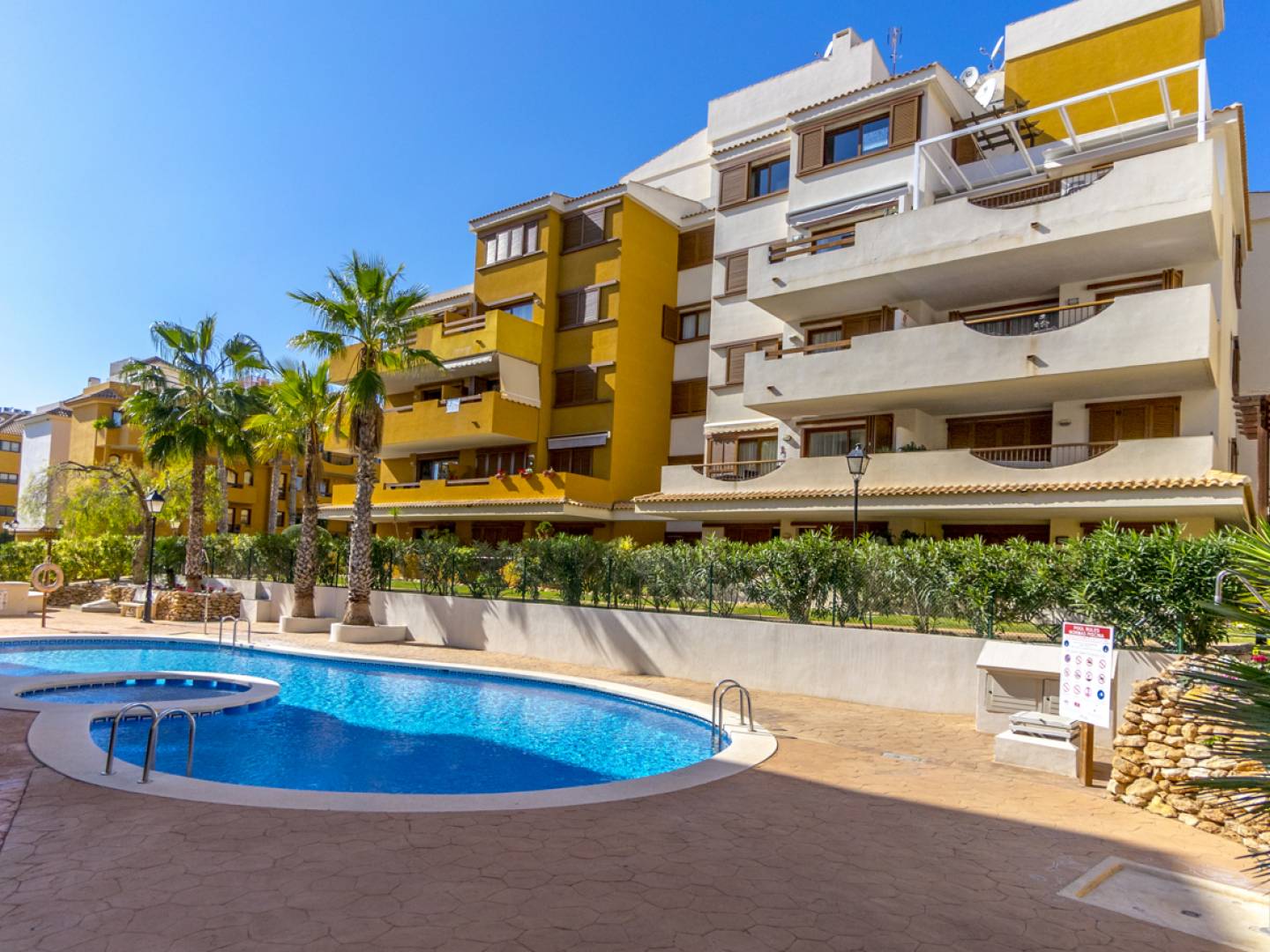 Découvrez ce charmant appartement de plain-pied à Punta Prima , au sein de la prestigieuse résidence La Entrada . Ce bien allie à la perfection intimité, espace et art de vivre méditerranéen . D'une superficie de 128 m² , l'appartement comprend deux chambres , deux salles de bains complètes , une cuisine indépendante entièrement équipée et un séjour lumineux avec accès direct à l'extérieur. Son atout majeur est sa spectaculaire terrasse privative de 40 m² , idéale pour profiter du climat privilégié de la Costa Blanca , recevoir des invités ou se détendre dans un cadre intime et élégant. La résidence offre des espaces communs de grande qualité , incluant une sécurité 24h/24 , des pelouses naturelles et trois piscines communes , dont une chauffée ouverte toute l'année . Son emplacement est tout simplement exceptionnel : à seulement 300 mètres de la mer , avec un accès facile à pied au centre commercial Punta Marina et à une grande variété de restaurants et de services . De plus, en moins de 10 minutes, vous trouverez le centre commercial Zenia Boulevard , l' hôpital de Torrevieja et des terrains de golf renommés tels que Villamartín , faisant de cette propriété un investissement immobilier idéal , à la fois comme résidence principale et pour des locations de vacances à haut rendement .