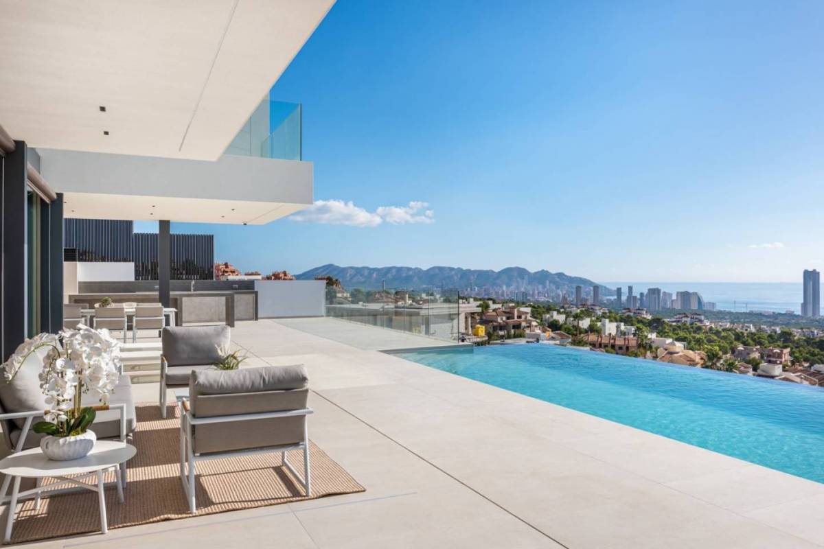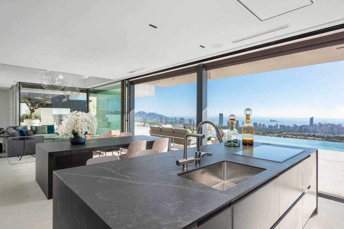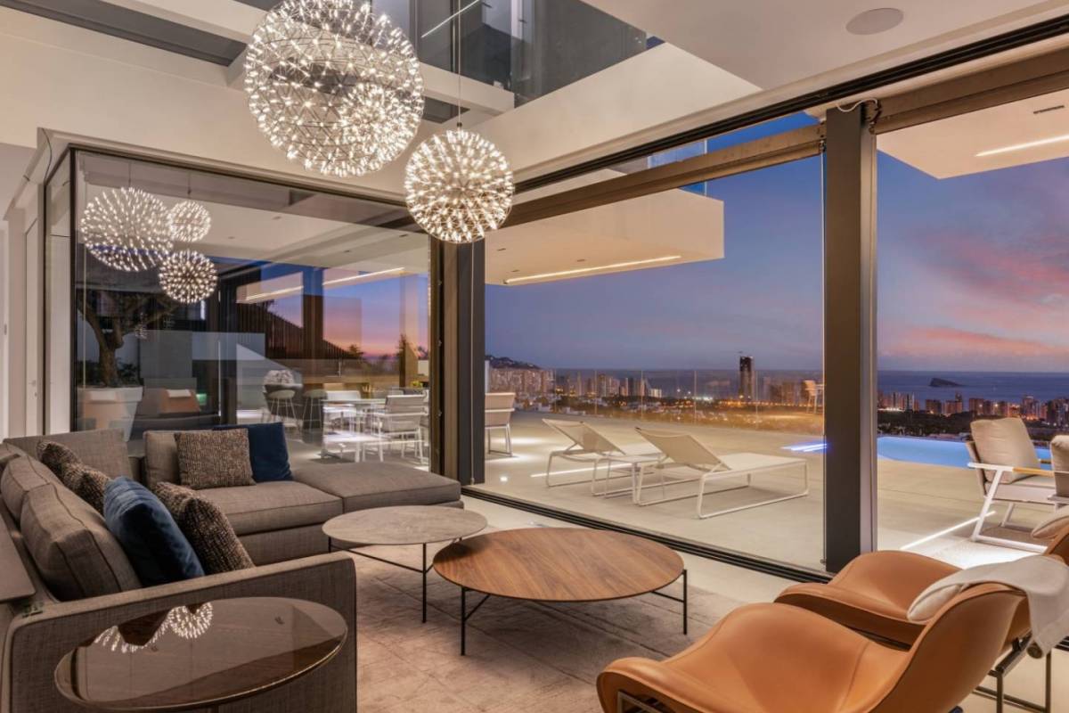 Geniet van een prachtig uitzicht op de skyline van Benidorm vanuit deze luxe villa te koop in Finestrat