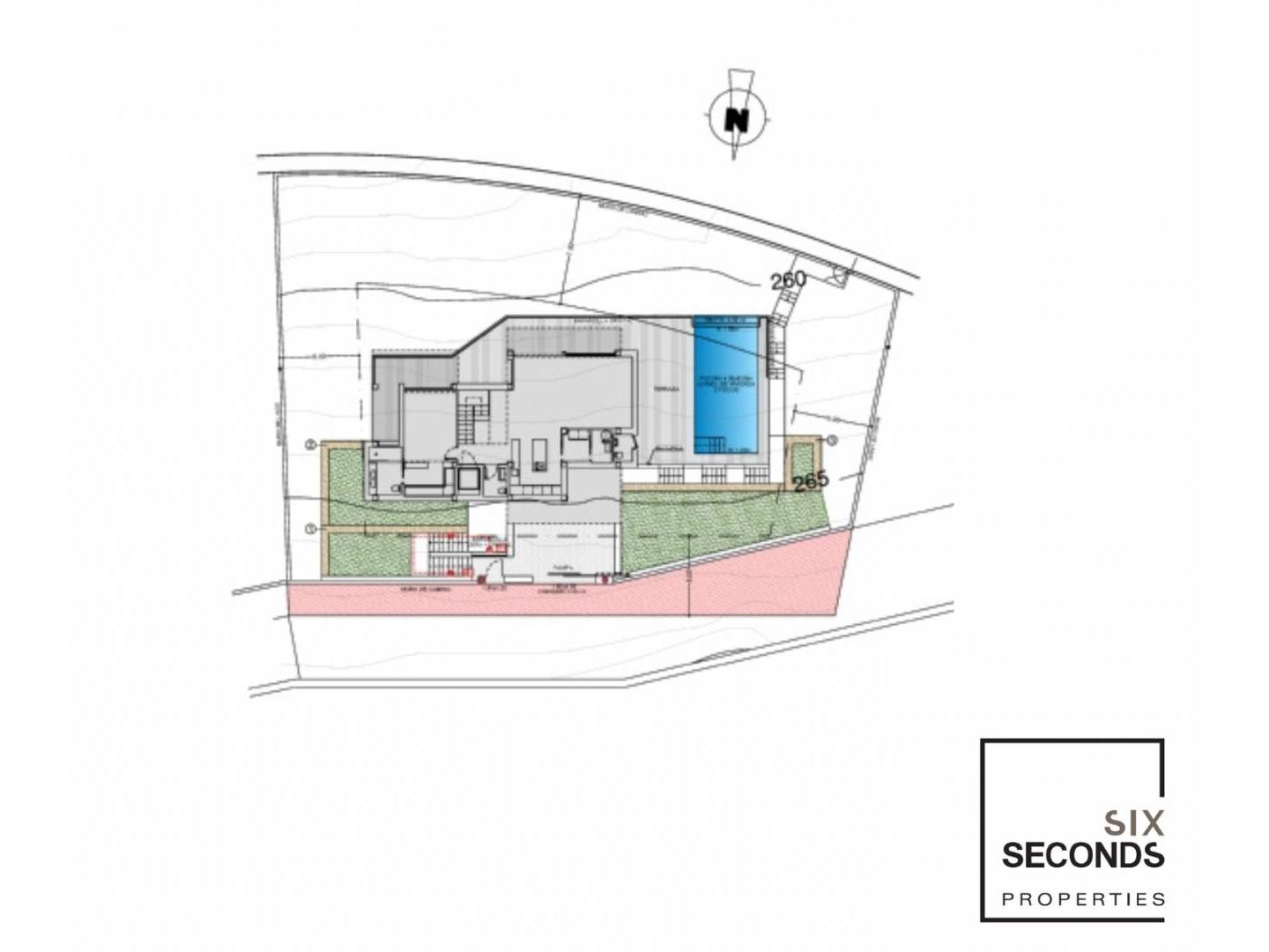 Het is gebouwd op drie niveaus, de toegang is via het hoogste niveau, waar de garage en de hal van het huis zich bevinden, uitgerust met een lift, zodat het verplaatsen tussen de niveaus comfortabel is. Op de tussenverdieping bevinden zich drie slaapkamers, allemaal met en-suite badkamers en toegang tot een terras om vanuit alle kamers van het huis van de zee te genieten. Op de begane grond bevindt zich de vierde slaapkamer van deze villa, eveneens met directe toegang tot het terras en het gehele daggedeelte, een grote open woonkamer verbonden met de keuken, het terras en het zwembad.