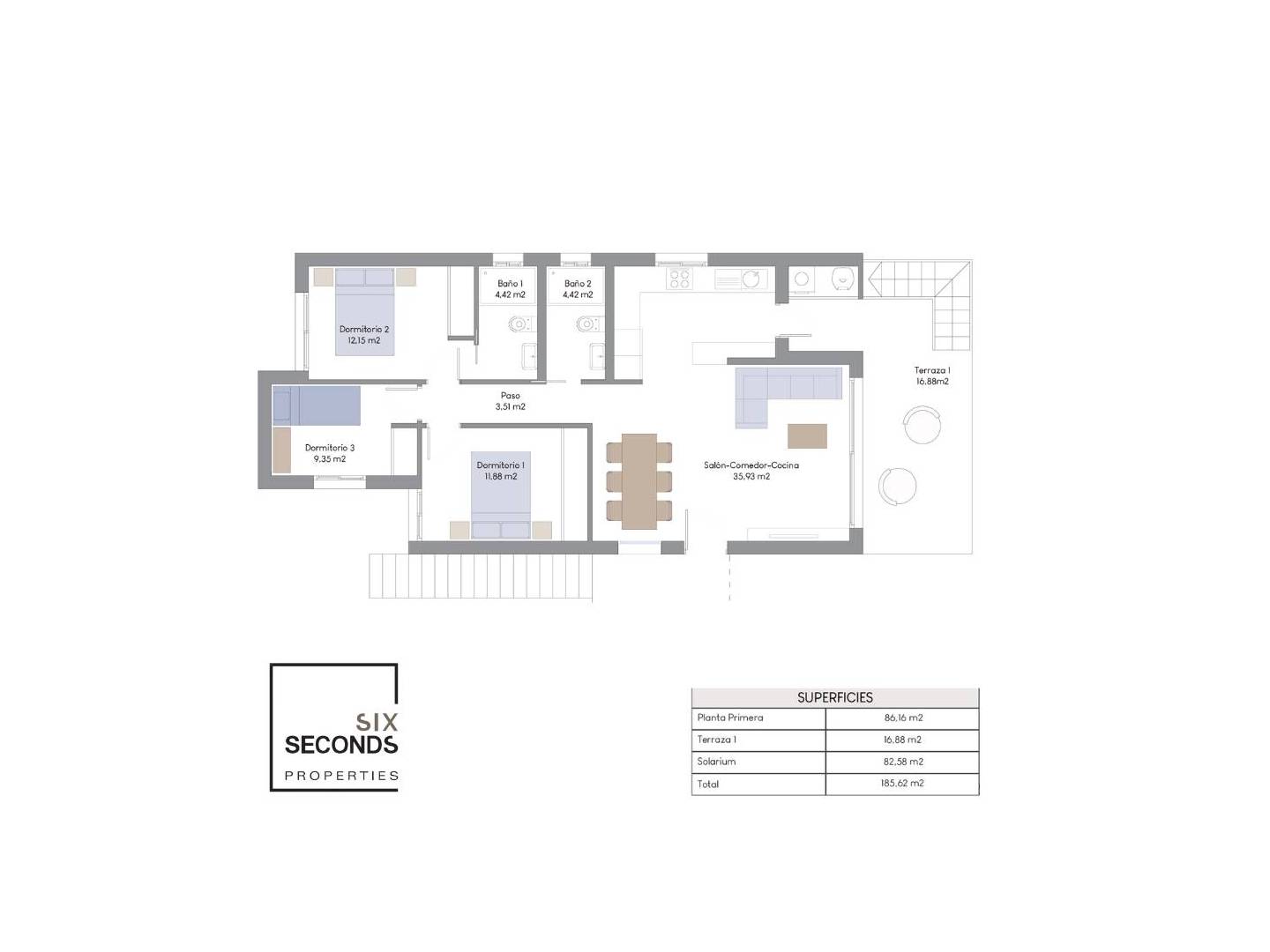 Deze bungalow heeft met name 3 slaapkamers en 2 badkamers verdeeld over bijna 210 m2 woonoppervlak op de bovenste verdieping plus solarium. Het heeft ook een eigen terras en solarium waar u kunt genieten van het fantastische mediterrane klimaat.
