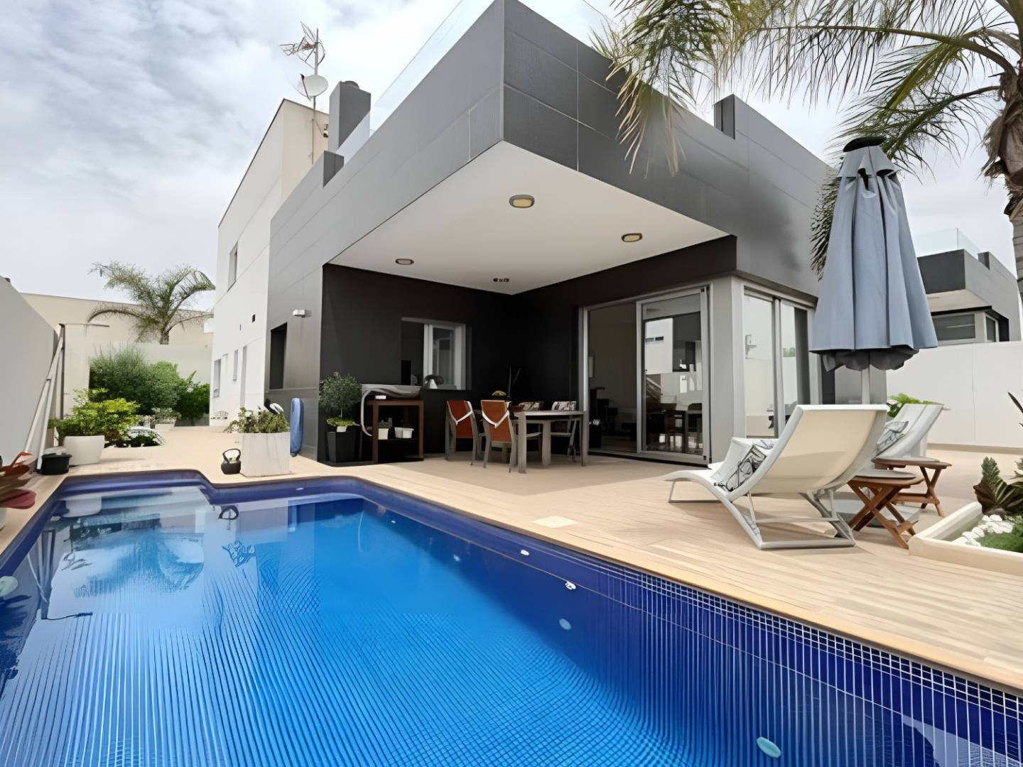 Villa in Pilar de la Horadada (Alicante), met privétuin, zwembad en jacuzzi. Dit huis van 170 m² biedt 3 slaapkamers en 2 badkamers in de buurt van het strand, een solarium, een kitchenette en volledig ingerichte slaapkamers.