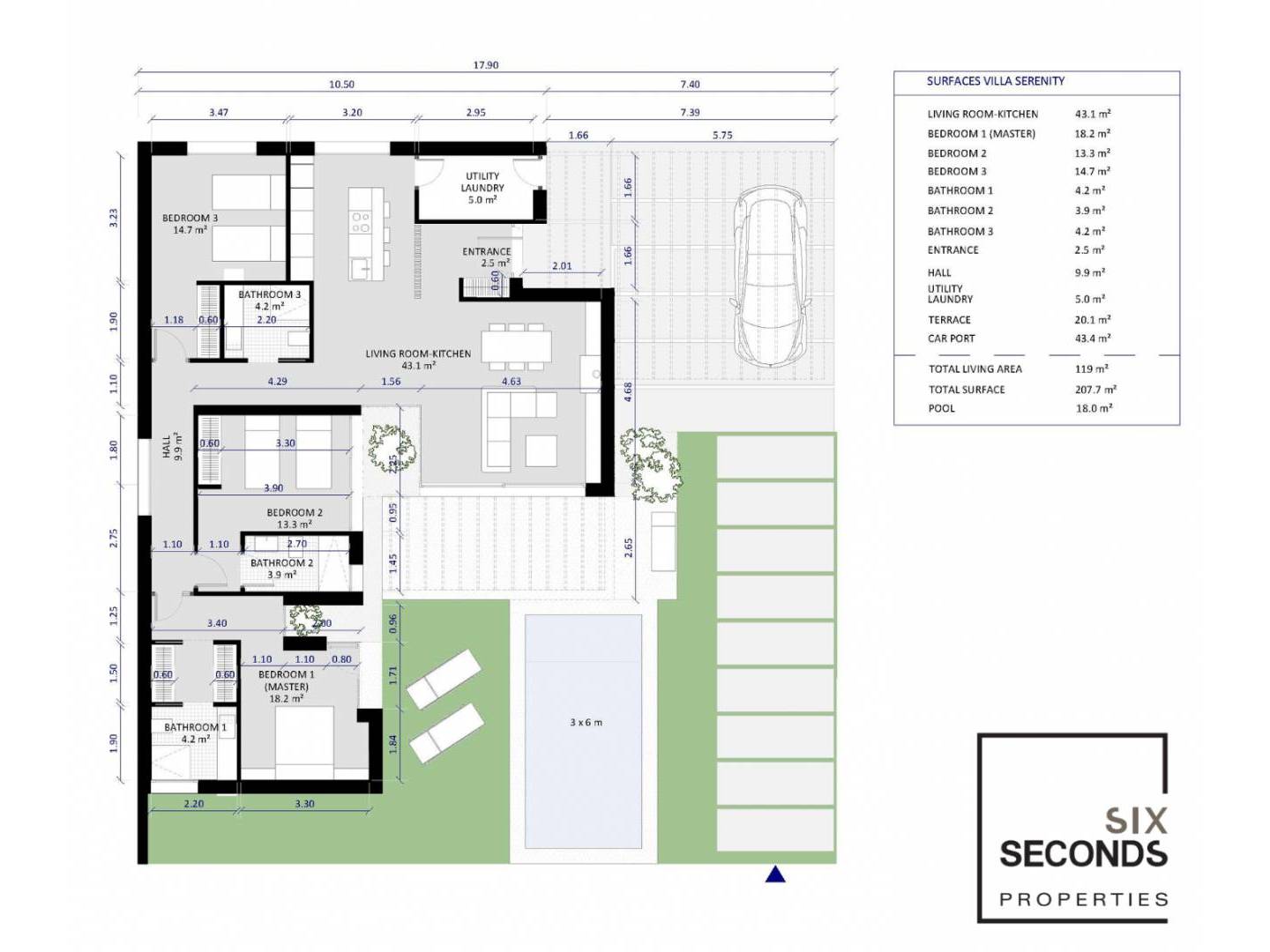 De woonoppervlakte bedraagt 119 m² en is ontworpen met elegantie en stijl in gedachten. De villa heeft een volledig uitgeruste moderne keuken, die perfect past in de ruime open woon- en eetkamer. Met grote ramen en glazen schuifdeuren wordt de villa overspoeld met natuurlijk licht en biedt een prachtig uitzicht op de tuin en het rustige privézwembad van 3 x 6 m.