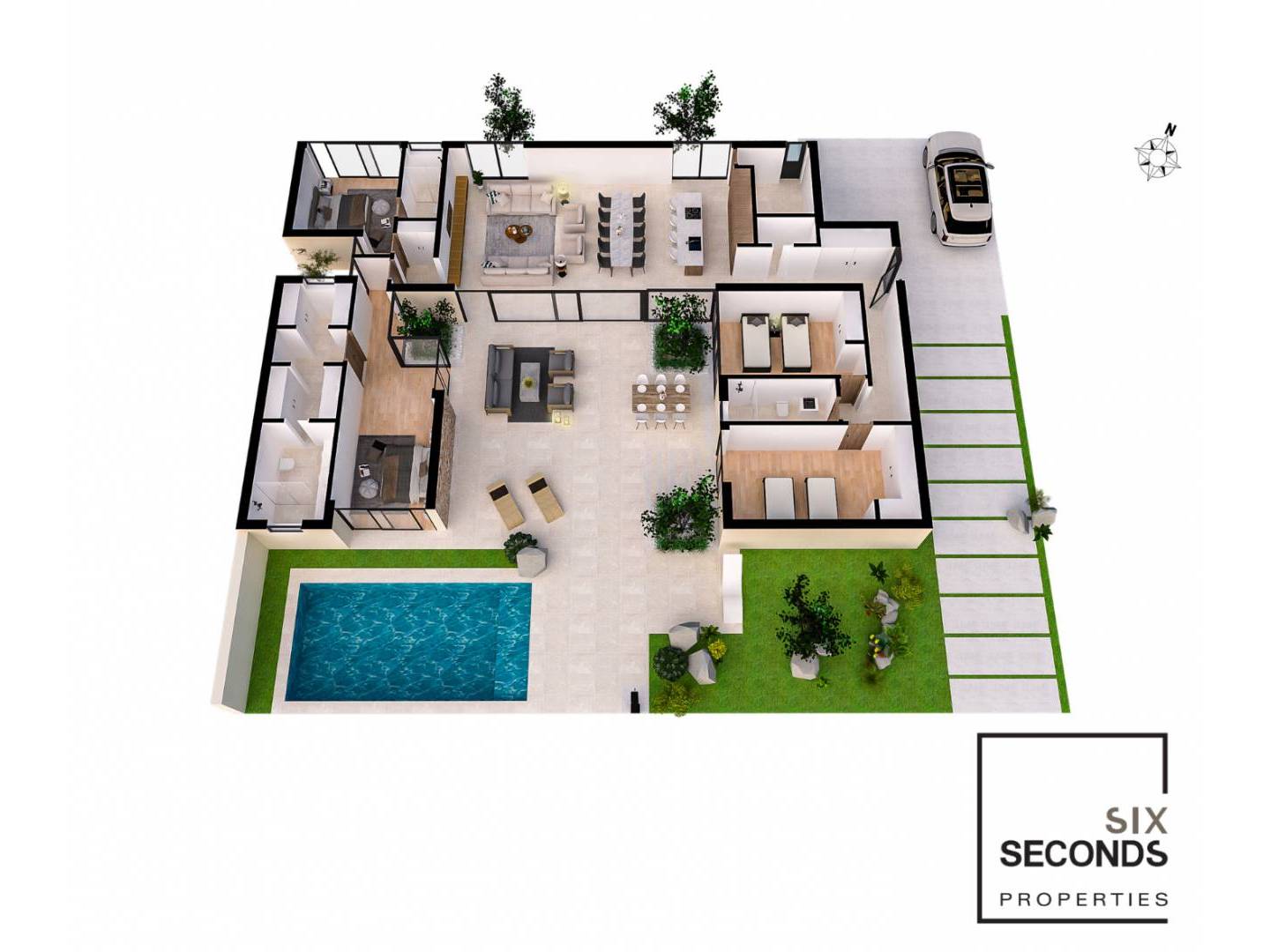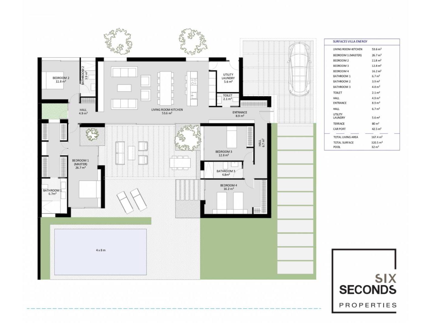 De woonoppervlakte bedraagt 164,7 m² en is ontworpen met elegantie en stijl in gedachten. De villa heeft een volledig uitgeruste moderne keuken, die perfect past in de ruime open woon- en eetkamer. Met grote ramen en glazen schuifdeuren wordt de villa overspoeld met natuurlijk licht en biedt een prachtig uitzicht op de tuin en het fantastische privézwembad van 4 x 8 m .