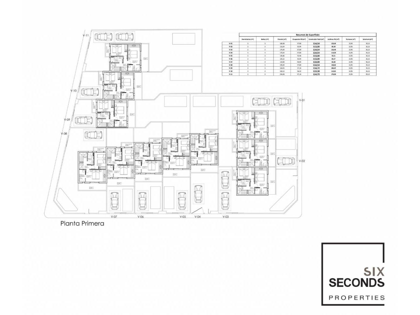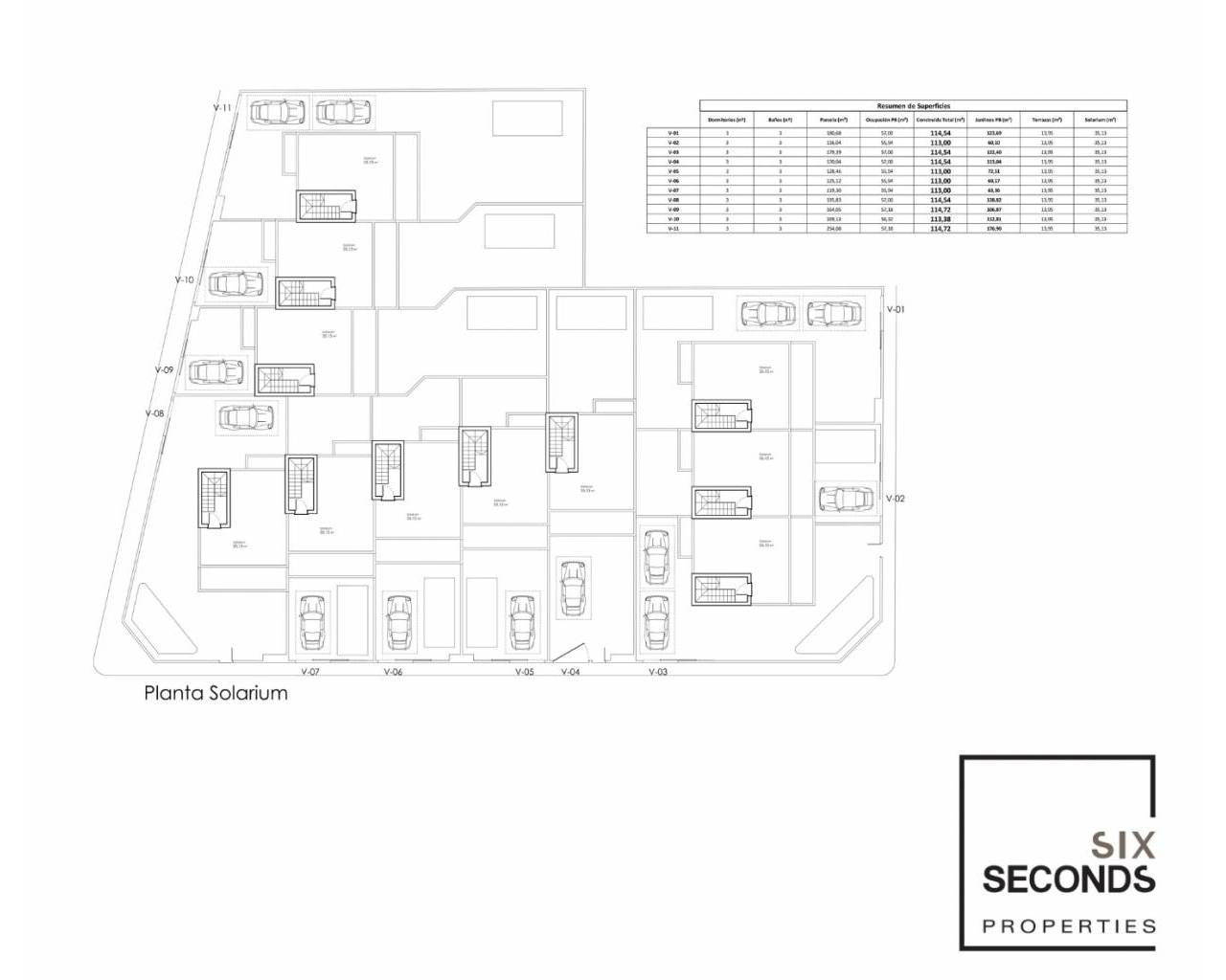 De woningen zijn verdeeld over twee verdiepingen plus solarium, met zowel voor- als achtertuin. De eerste verdieping bestaat uit een ruime en lichte woon-eetkamer met open keuken volledig ingericht en uitgerust om ervan te genieten. Aan de achterkant is er een grote slaapkamer en een gastenbadkamer. Boven zijn er nog twee slaapkamers, waarvan een met en-suite badkamer, en een extra badkamer. Beide slaapkamers hebben een buitenbalkon. De derde verdieping is gereserveerd voor het dakterras, waar zich het solarium bevindt.
