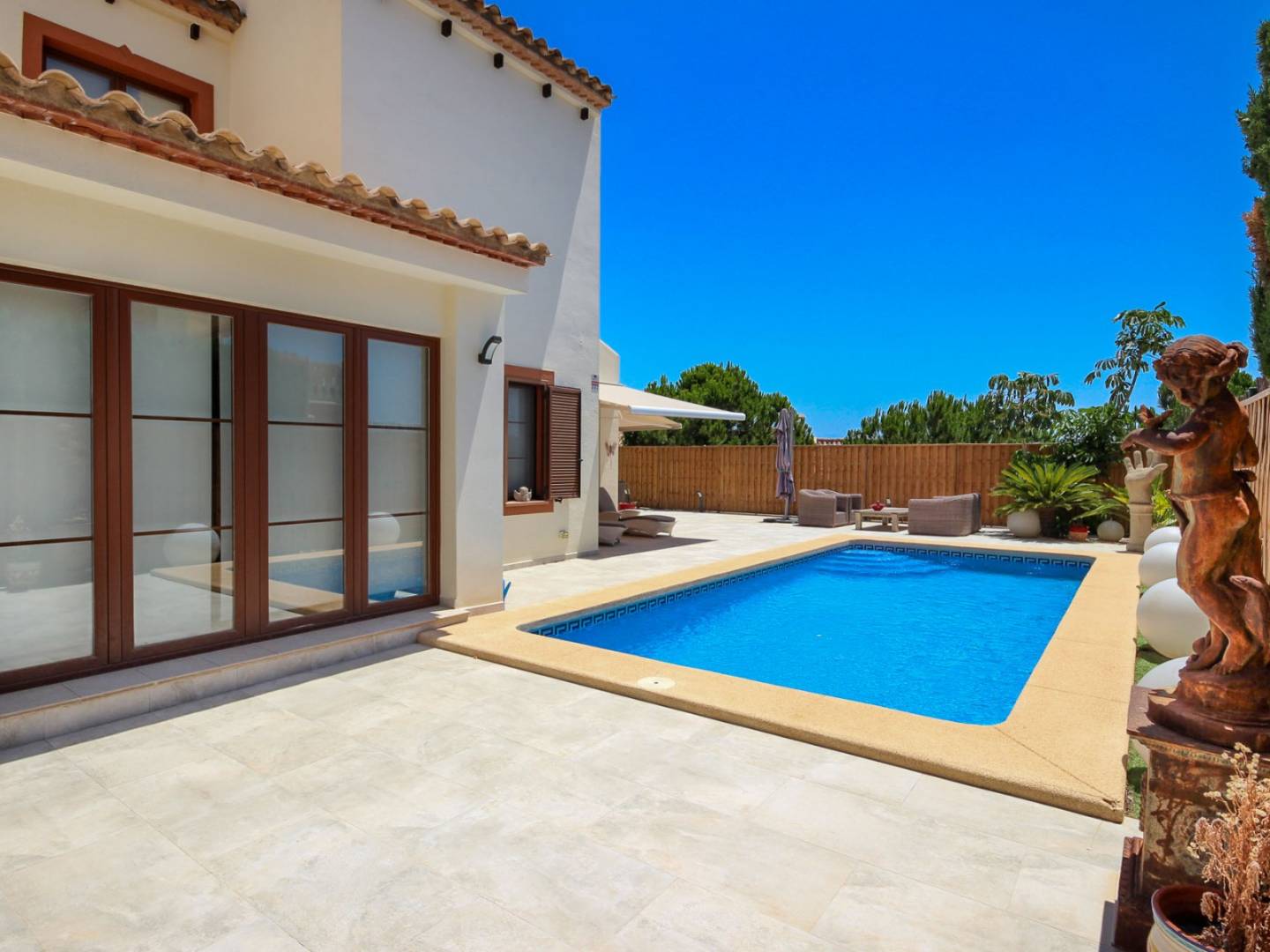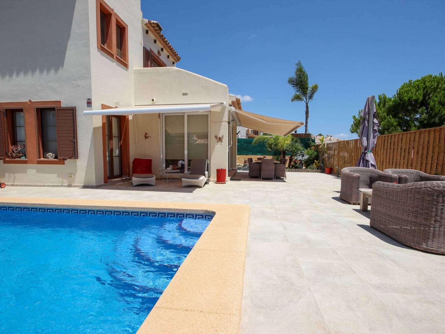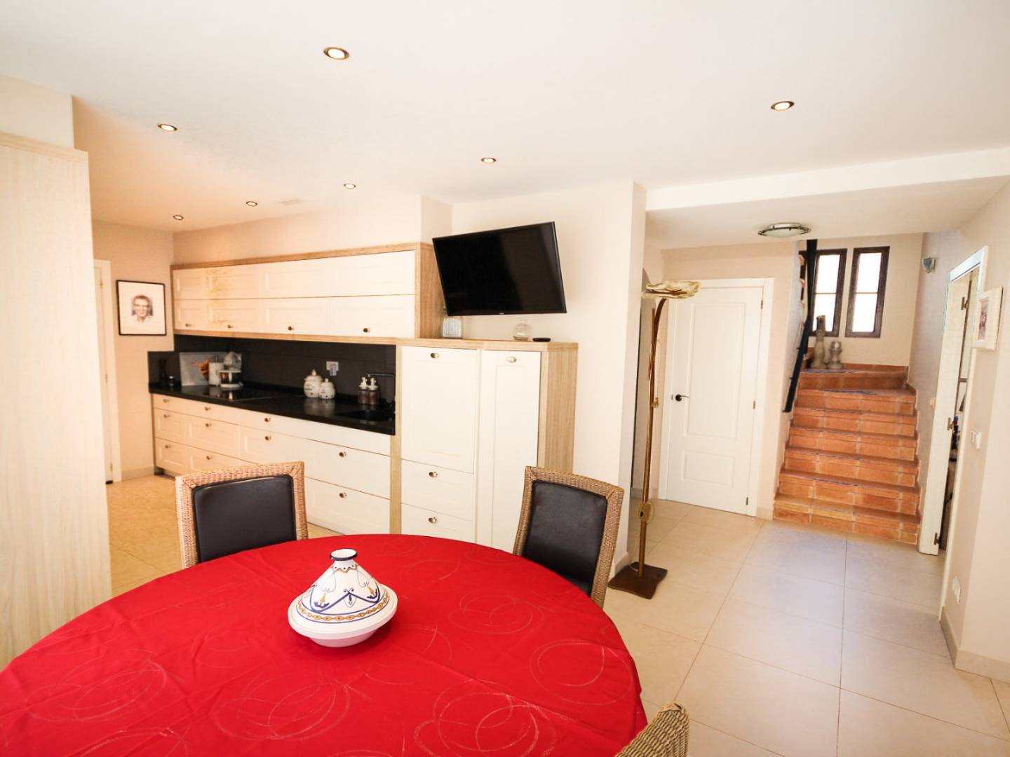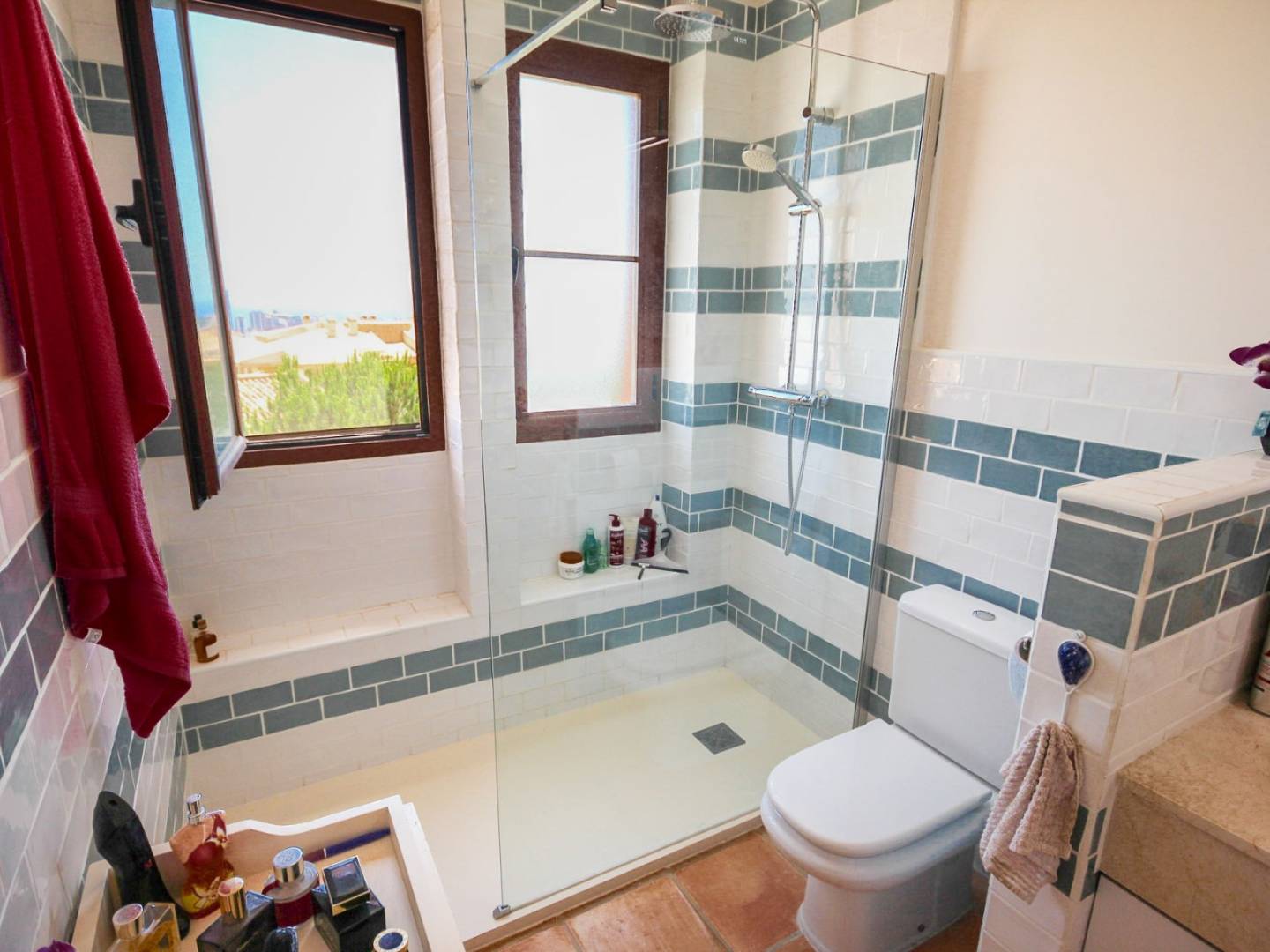 Op de begane grond is er een ruime woonkamer met moderne vloeren en grote ramen die uitkomen op het buitenterras en het zwembad. Er is een woonkamer met gashaard, een volledig ingerichte moderne keuken met bijkeuken, een ruime slaapkamer en een aparte badkamer met douche. Via de open trap komt u op de eerste verdieping met drie slaapkamers en twee badkamers. De ruime hoofdslaapkamer heeft een eigen terras met panoramisch uitzicht op zee en een en-suite badkamer. Daarnaast zijn er nog twee slaapkamers met aparte badkamers. Een van deze twee slaapkamers is omgebouwd tot kleedkamer.