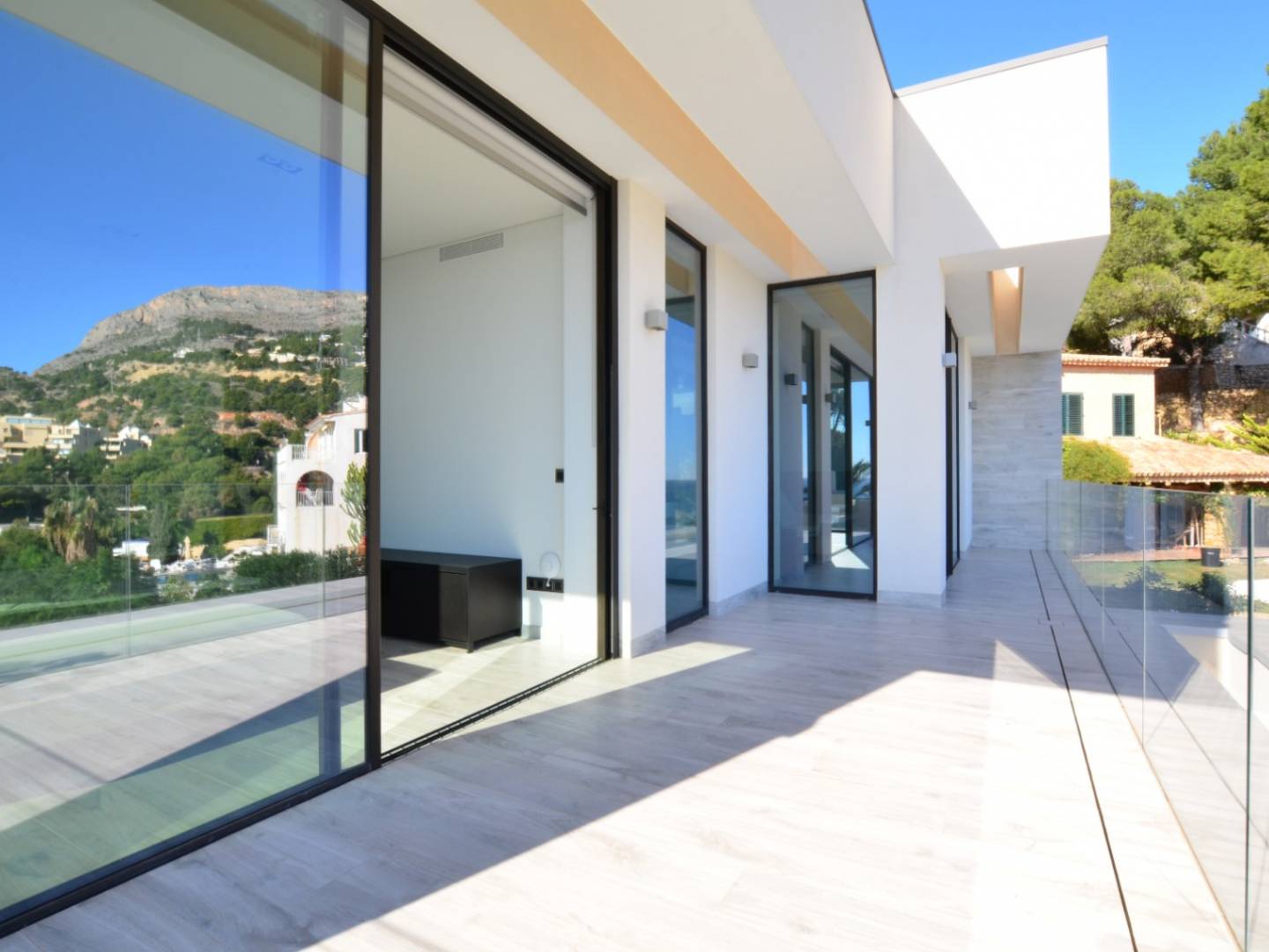 Als we het huis binnenkomen op de derde verdieping, vinden we een grote hal en drie slaapkamers. De hoofdslaapkamer biedt een kleedkamer , een badkamer en een groot hoekterras met panoramisch uitzicht op zee . De tweede slaapkamer heeft een inbouwkast , een badkamer en een eigen terras met uitzicht op zee, terwijl de derde slaapkamer een inbouwkast en een badkamer heeft. Als u de trap afdaalt, komt u op het volgende niveau, waar zich een woonkamer met open haard , een eetkamer, een open keuken met eiland, een gastenbadkamer en een wasruimte bevinden. Al deze kamers hebben toegang tot een terras met zwembad en buitendouche .