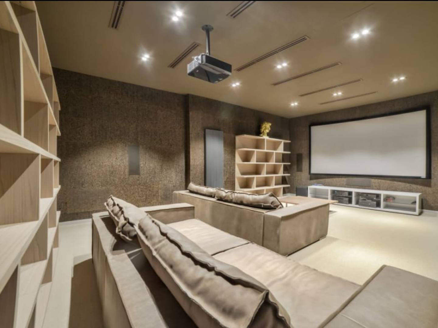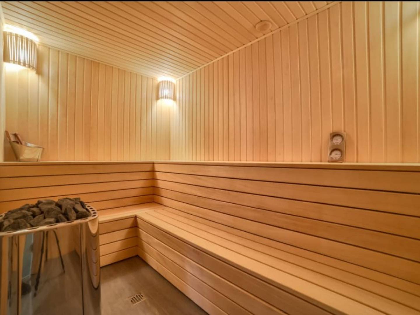 Op de begane grond bevindt zich een wellness-retraite: een grote woon-eetkamer, een keuken, een binnenzwembad, een whirlpool, een fitnessruimte, een schoonheidssalon met kapper, een Finse en Turkse sauna, een dubbele douche en een wijnkelder . Ook een serviceappartement en een gastenkamer met grote slaapkamers, speelkamer, bioscoop, kantoor en wasruimte.