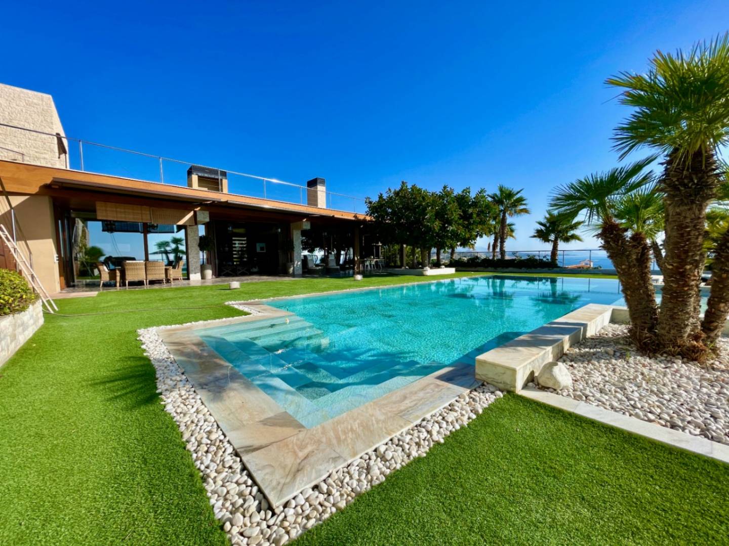 Geniet van adembenemende zonsopgangen en zonsondergangen vanuit elke hoek van de twee verdiepingen van deze villa. Dompel jezelf onder in de elegantie van een witmarmeren zwembad , het epicentrum van deze oase, omgeven door zes ruime slaapkamers , elk met een eigen badkamer . Ontdek het comfort van verschillende lounges , een barbecueplek aan zee en een uitzonderlijke wijnkelder , perfect voor onvergetelijke momenten met familie en vrienden.