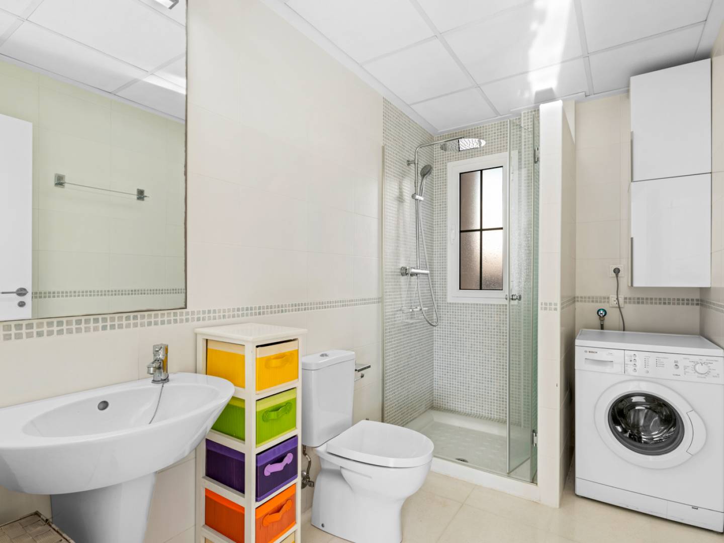 Das Innere des Hauses ist in einem neutralen und angenehmen Stil mit hochwertigen Fliesen gehalten und bietet eine gemütliche und elegante Atmosphäre. Das Haus verfügt über zwei Schlafzimmer, eines mit eigenem Bad und Ankleidezimmer, die Komfort und Privatsphäre bieten. Das Haus war ursprünglich für drei Schlafzimmer konzipiert, eines davon wurde jedoch als Esszimmer in das Wohnzimmer integriert. Bei Bedarf kann es durch eine Wand wieder abgetrennt werden, um das dritte Schlafzimmer wiederherzustellen.