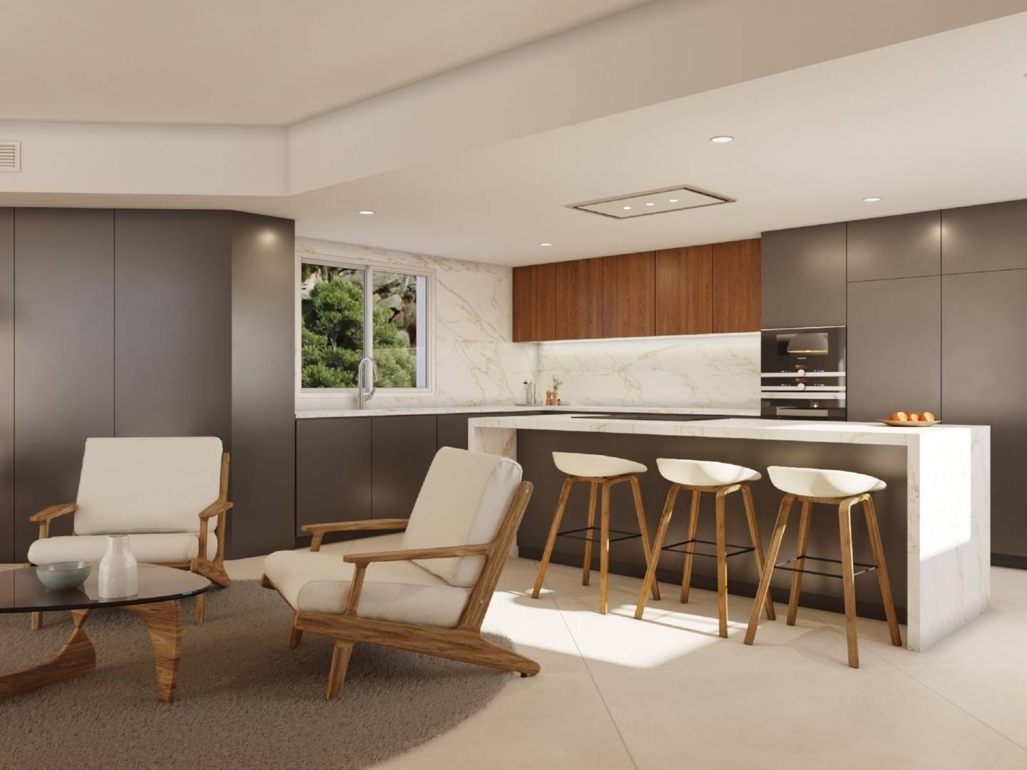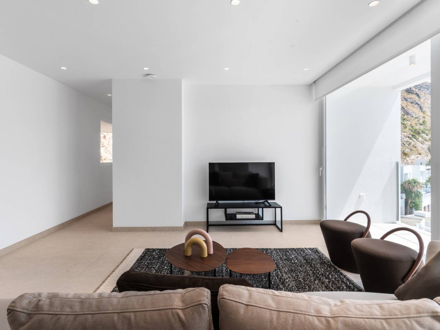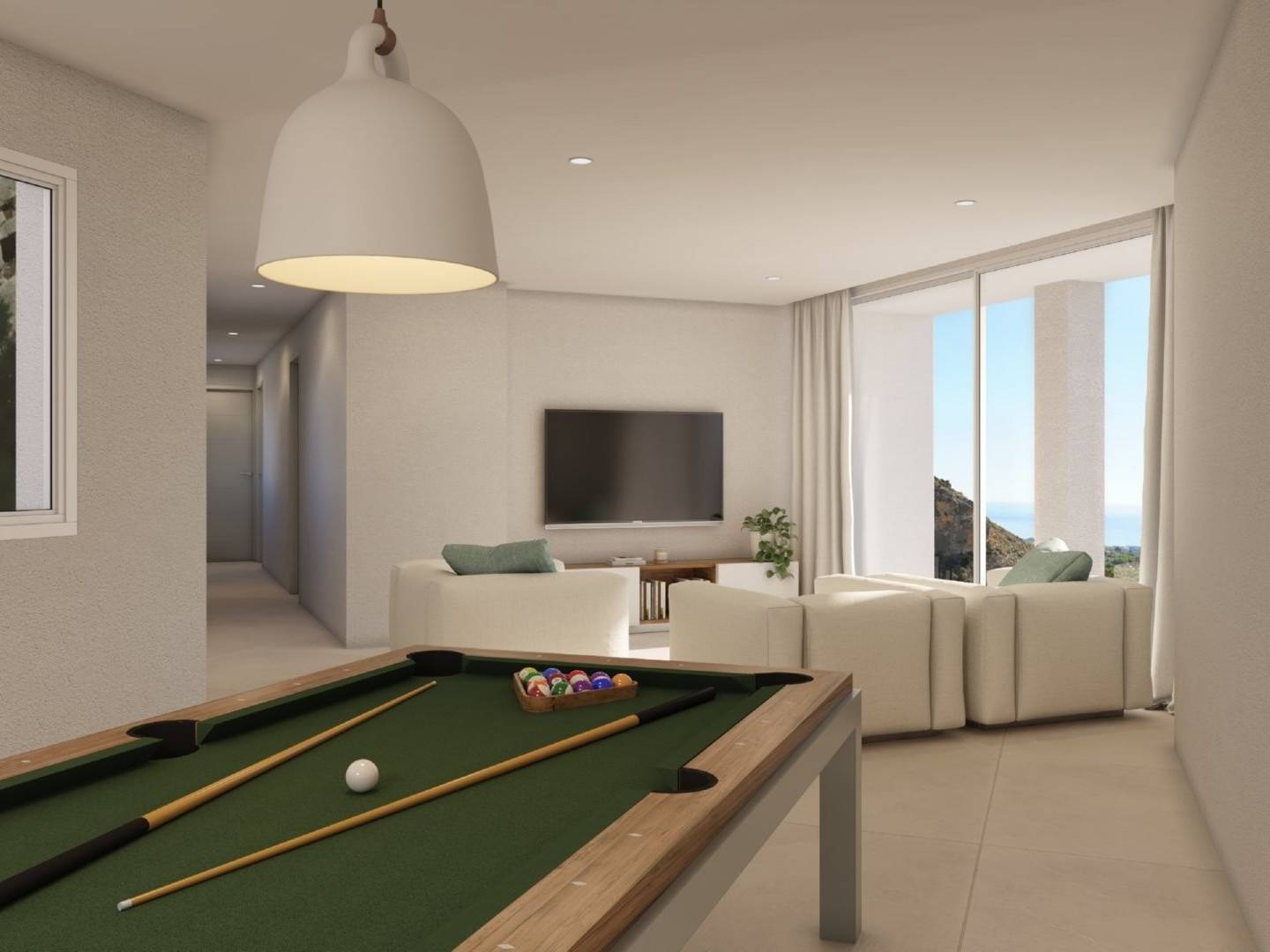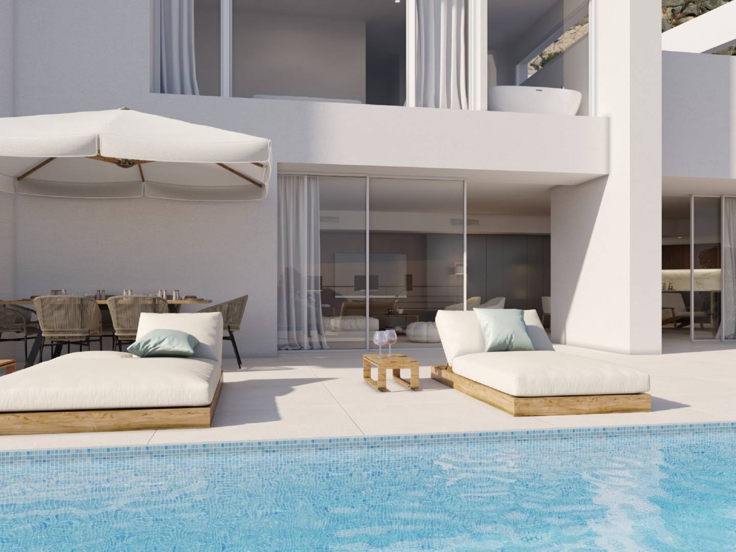 Een licht wooncomplex met ruime interieurs, unieke architectuur en een natuurlijke omgeving met panoramisch uitzicht op de Middellandse Zee en de skyline van Benidorm.