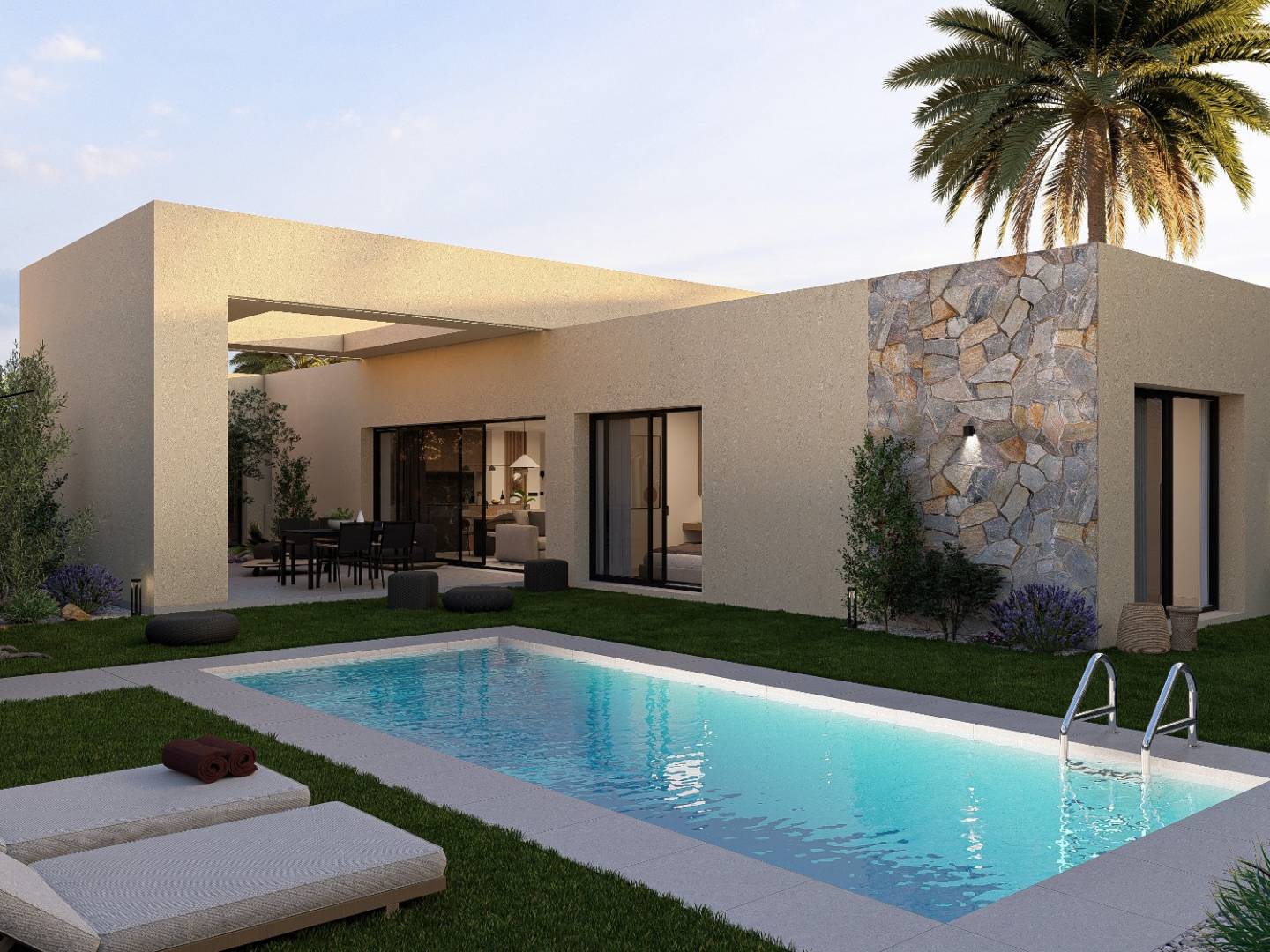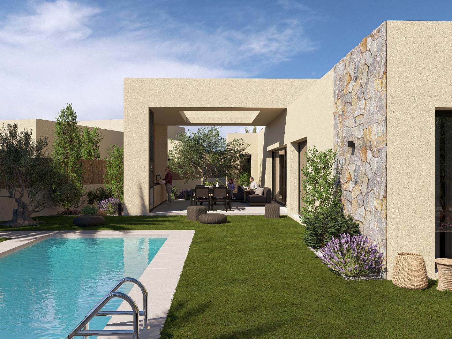 Geniet van uw eigen privézwembad, ideaal om te ontspannen en te genieten van het mooie weer in de privacy van uw eigen huis. Elke villa beschikt bovendien over een eigen tuin met grind- en grasgedeeltes, die zijn ontworpen om een natuurlijke en gastvrije sfeer te creëren. Met het druppelirrigatiesysteem blijft uw tuin altijd in perfecte staat, met minimale inspanning.