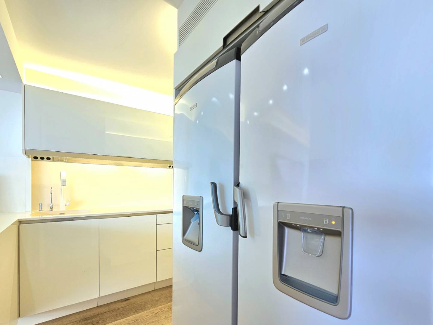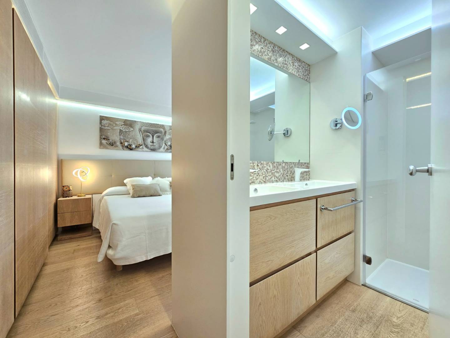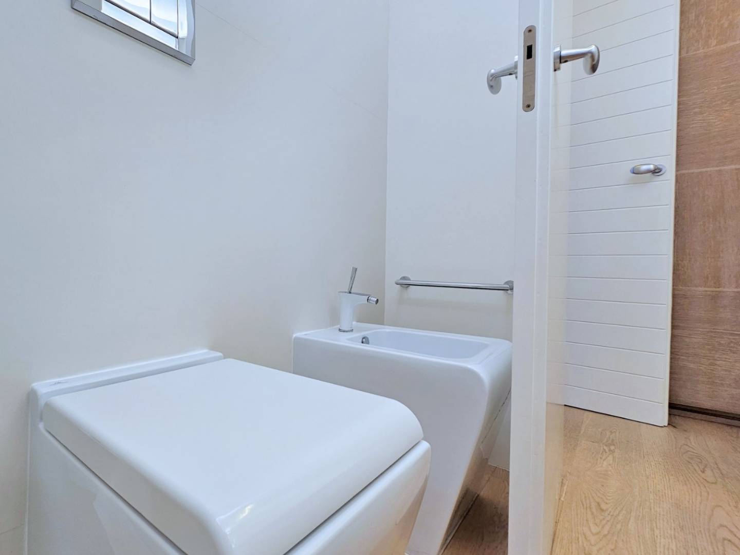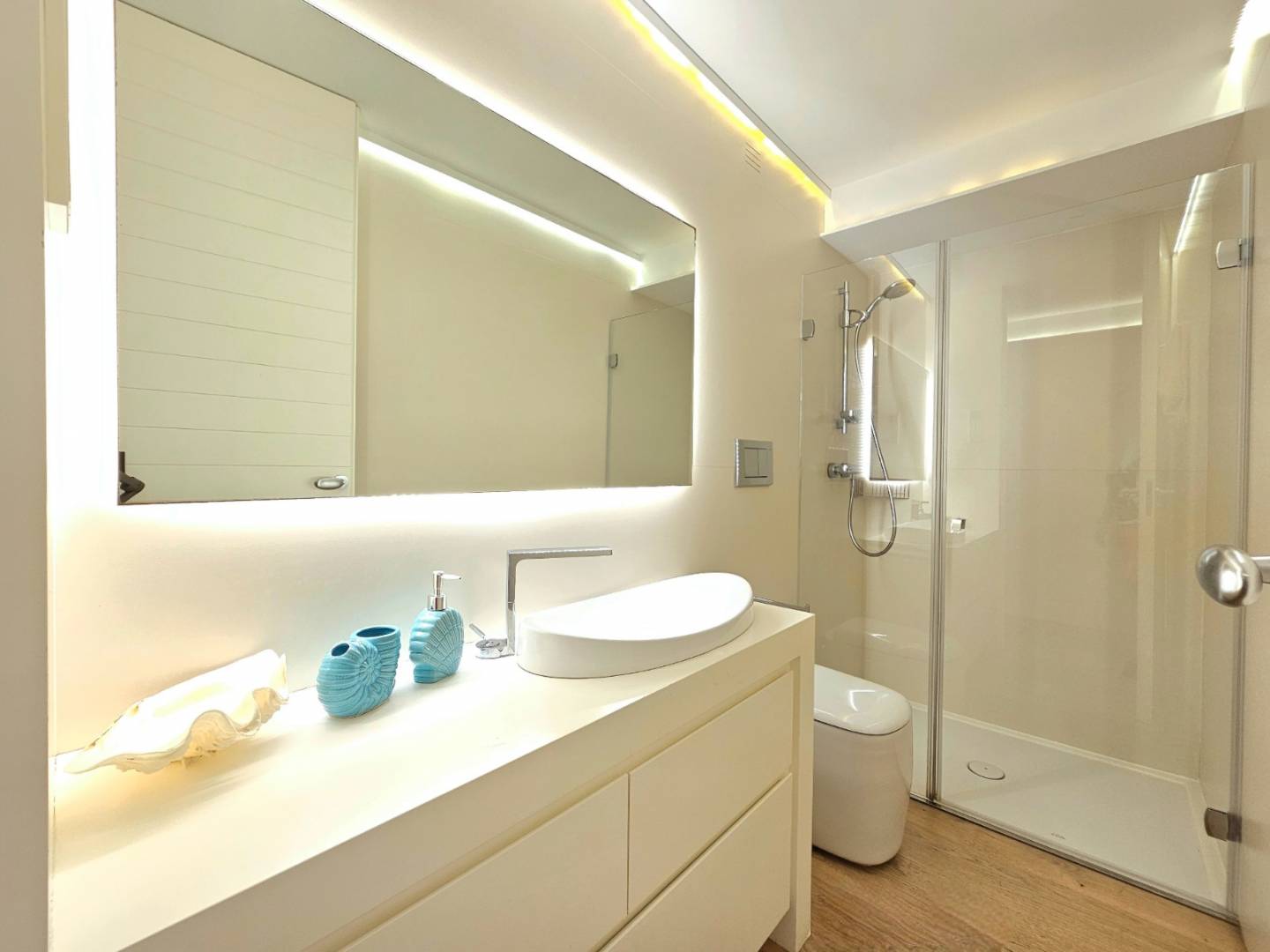 Het appartement is uitgerust met de hoogste kwaliteitsnormen: natuurlijke eiken parketvloeren, Santos-keuken met Siemens-apparatuur, badkamers met porseleinen tegels en Hansgrohe-armaturen, en een compleet domoticasysteem om verlichting, zonwering, airconditioning en beveiliging overal te bedienen.