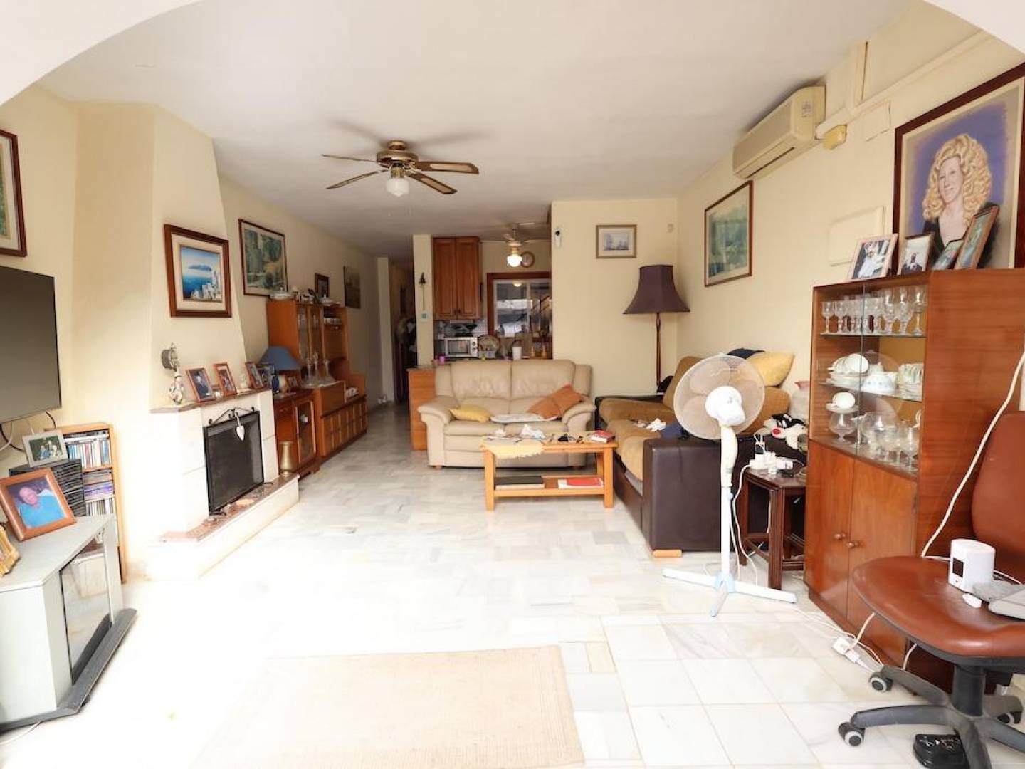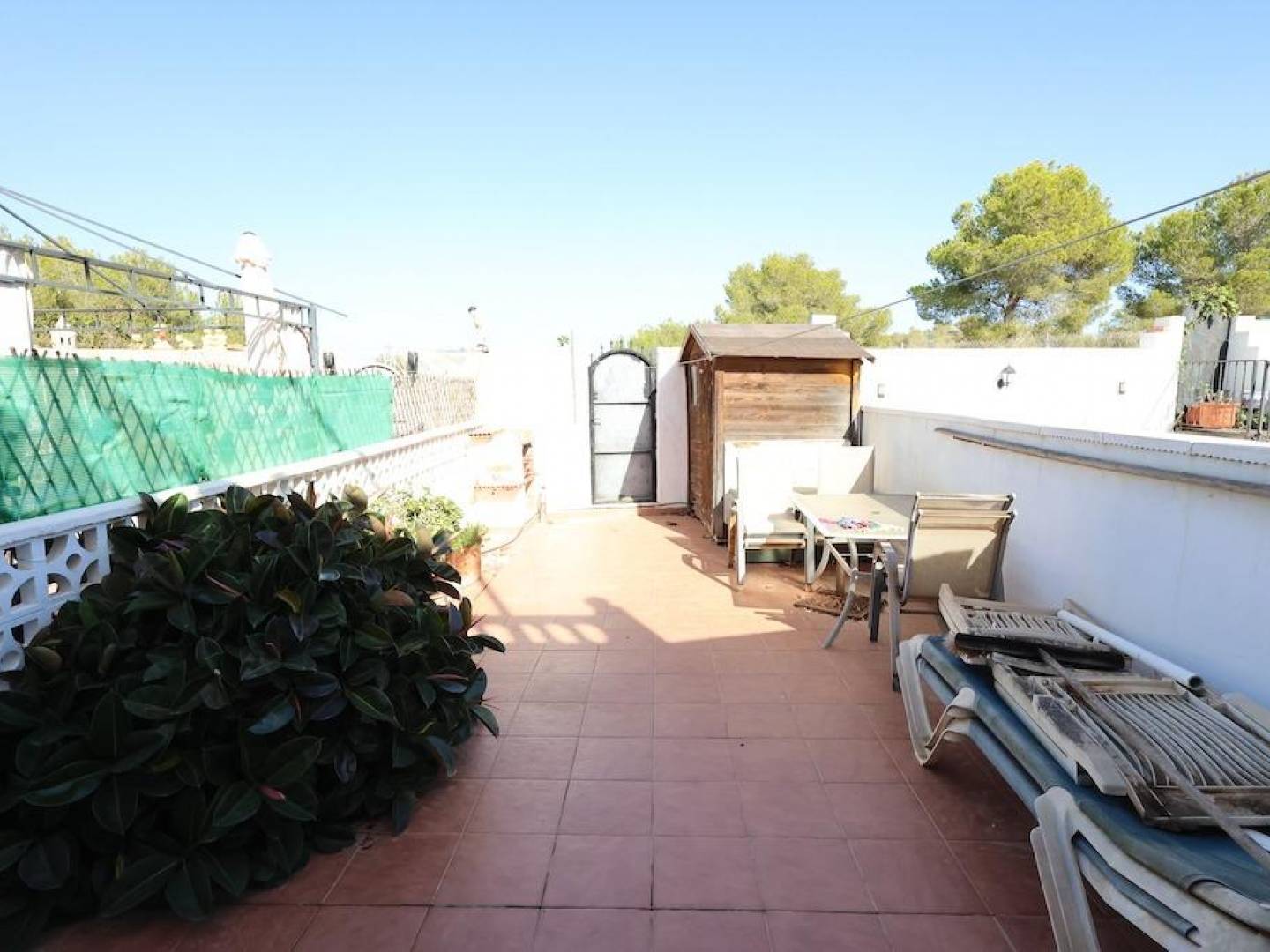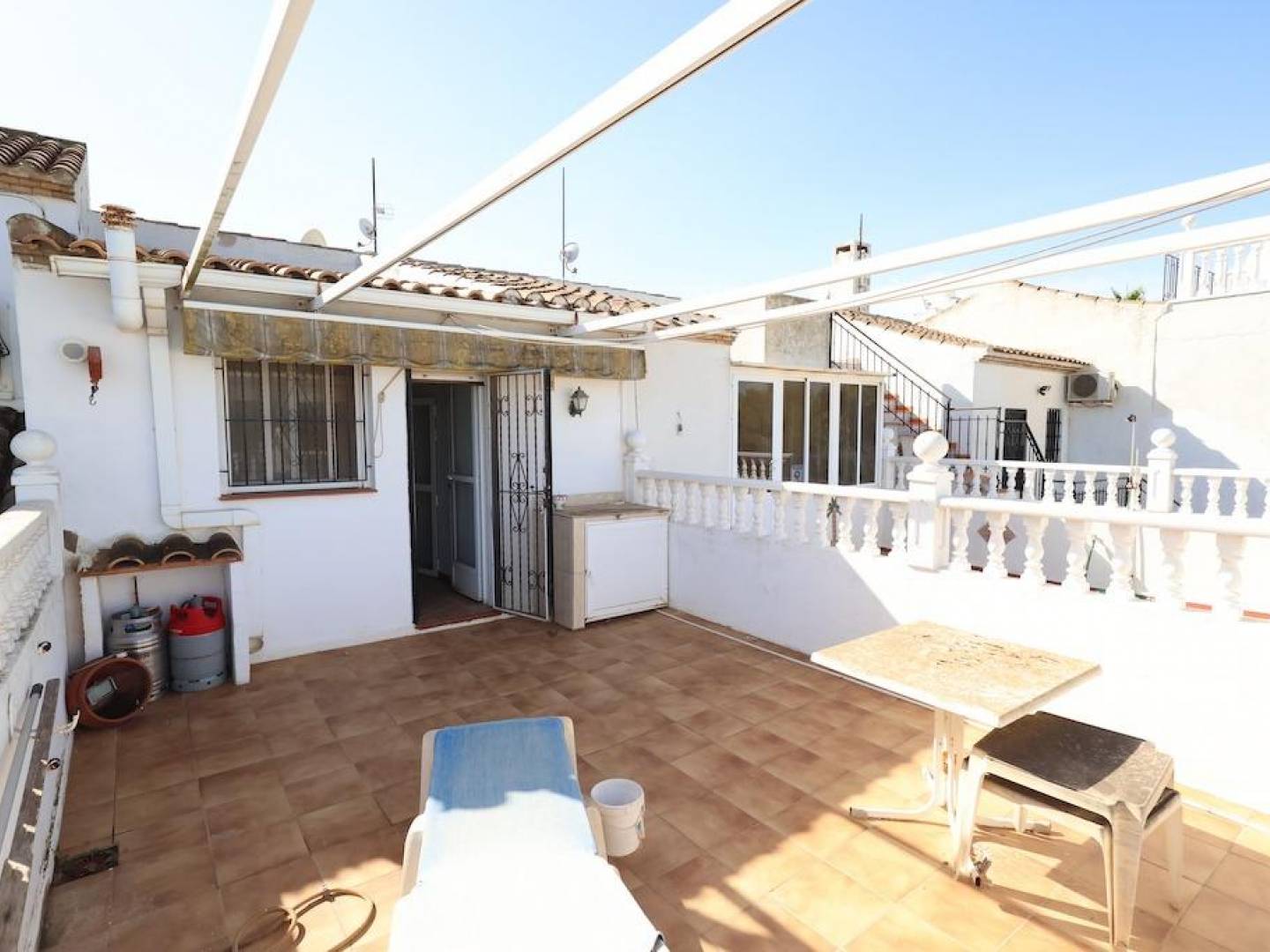 Lomas del Golf, Villamartin Halfvrijstaande woning van 114 m2 op het zuiden en een perceel met de mogelijkheid om een eigen zwembad te bouwen, met 3 slaapkamers, waarvan één op de begane grond, grote woonkamer, open keuken, 2 badkamers, op de bovenverdieping is er een terras en een groot solarium met pergola en uitzicht op zee, de urbanisatie heeft verschillende gemeenschappelijke zwembaden, het huis wordt gemeubileerd en met airconditioning verkocht.
