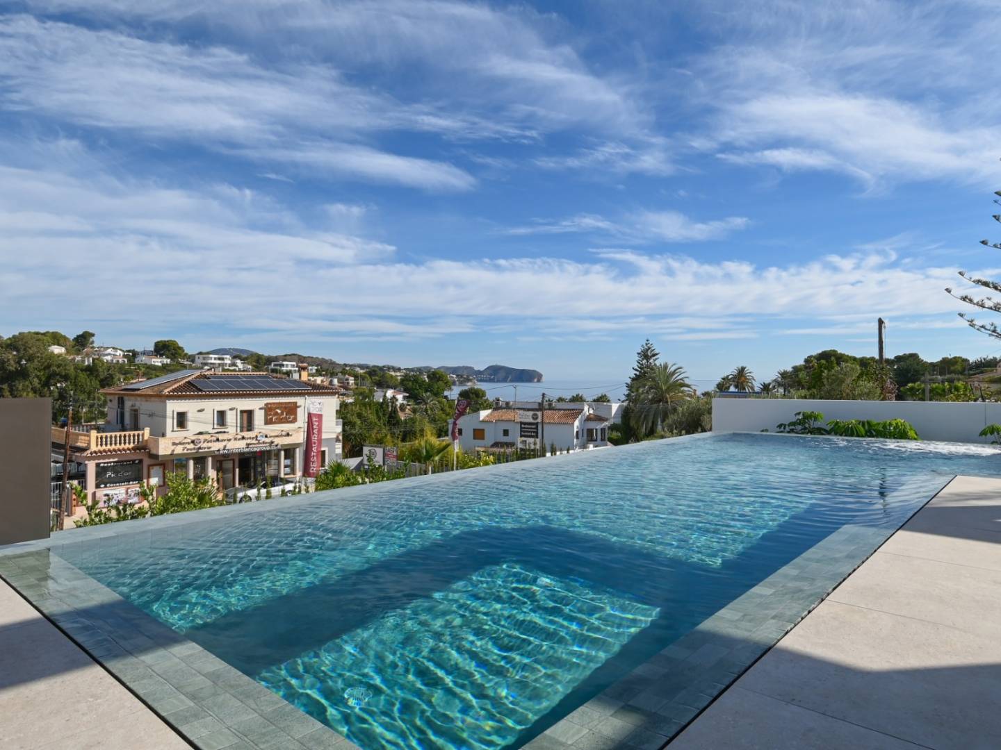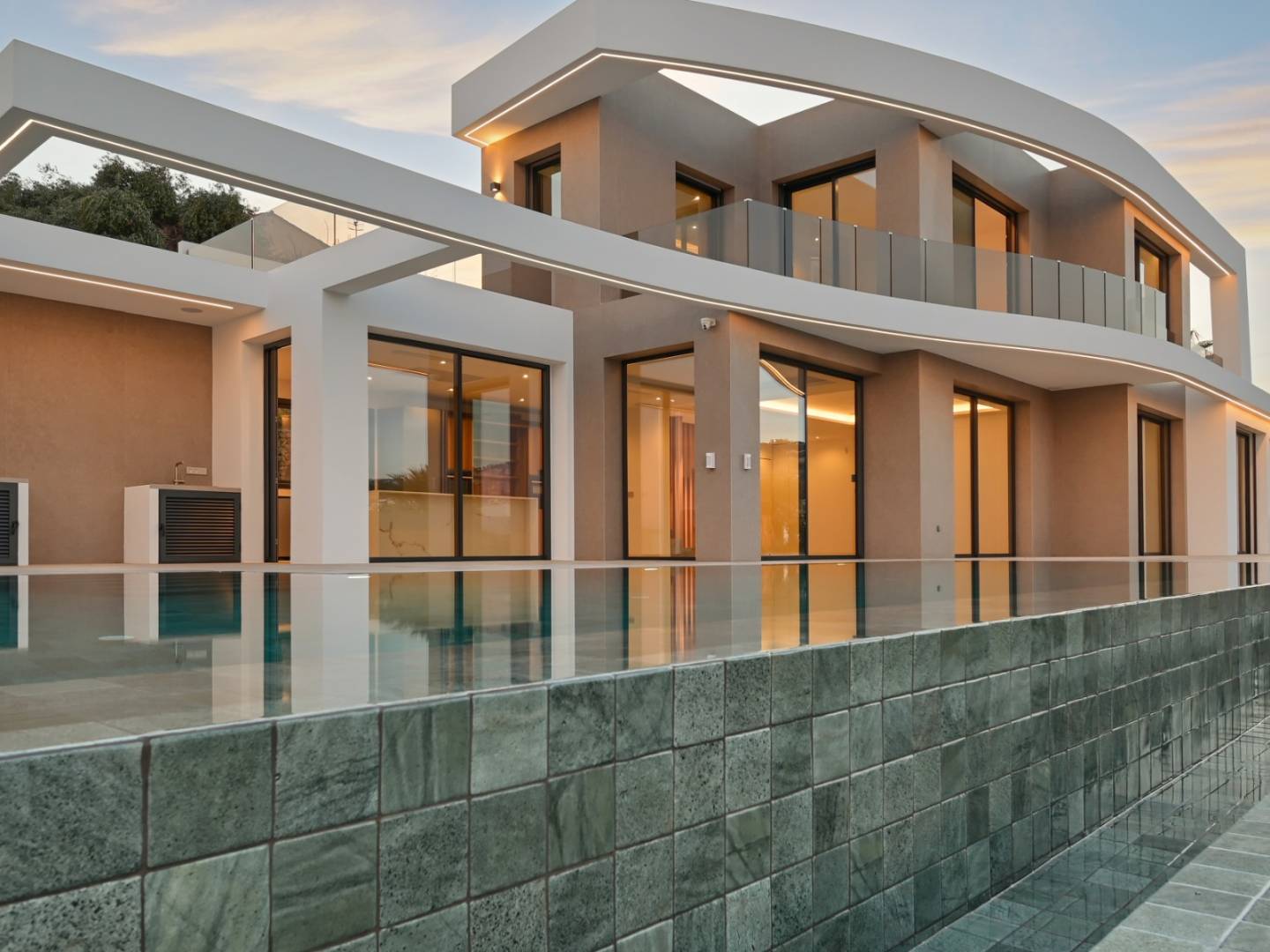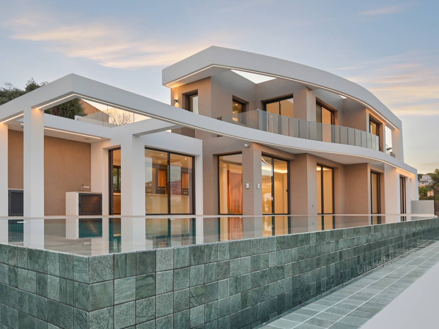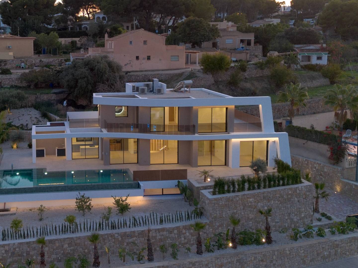 De villa heeft een oppervlakte van 621 m², verdeeld over drie zorgvuldig ontworpen verdiepingen. Op de begane grond, verbonden met het terras en het overloopzwembad, bevinden zich twee slaapkamers, waarvan één met een eigen badkamer, een gastentoilet, een volledig uitgeruste keuken en een ruime woon-eetkamer met directe toegang tot de barbecueplek. Boven zijn er twee tweepersoonsslaapkamers met eigen badkamers, beide met toegang tot open terrassen waar u kunt genieten van het uitzicht op zee. In de kelder bevinden zich exclusieve ruimtes waaronder een fitnessruimte, een thuisbioscoop, een speelkamer, een sauna, een binnenzwembad, een wasruimte en een extra toilet.
