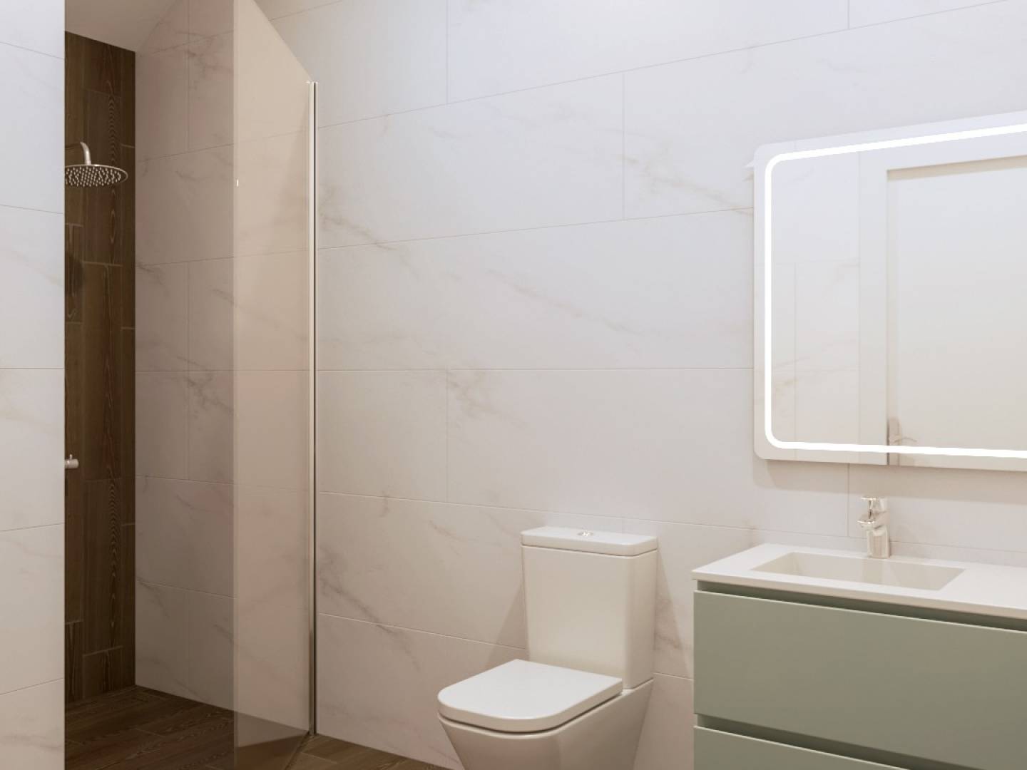 Er zijn nog twee tweepersoonsslaapkamers op de bovenverdieping. Eén heeft een en-suite badkamer, inbouwkasten en toegang tot een privéterras, terwijl de tweede een kleedkamer heeft en toegang tot een ruim panoramisch terras. Er is ook een extra familiebadkamer. Buiten zijn de villa's voorzien van kunstgras, elektrische poorten bij de ingang en een elegant privézwembad om het hele jaar door van de zon te genieten.