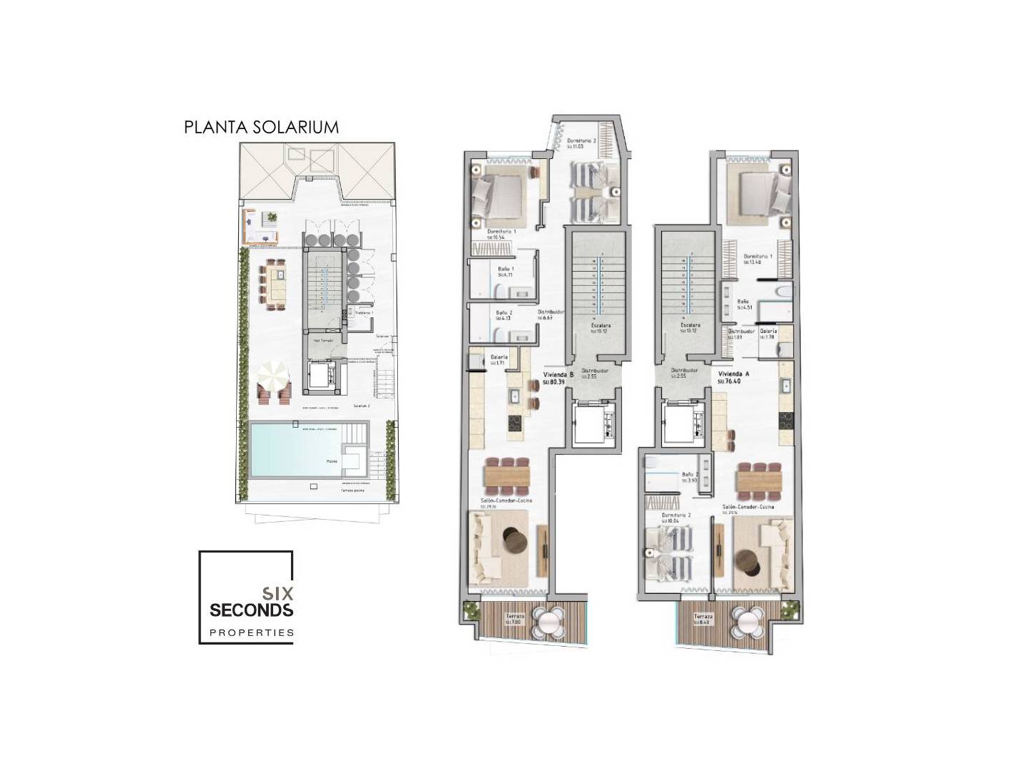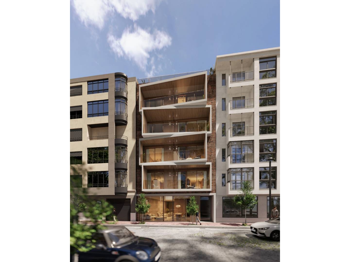Het vier verdiepingen tellende gebouw heeft slechts twee appartementen per verdieping, elk met minimaal 80 m² woonoppervlak, twee slaapkamers en twee badkamers . Op de begane grond bevindt zich een commerciële ruimte , terwijl het dakterras een gemeenschappelijk zwembad met een prachtig uitzicht biedt.