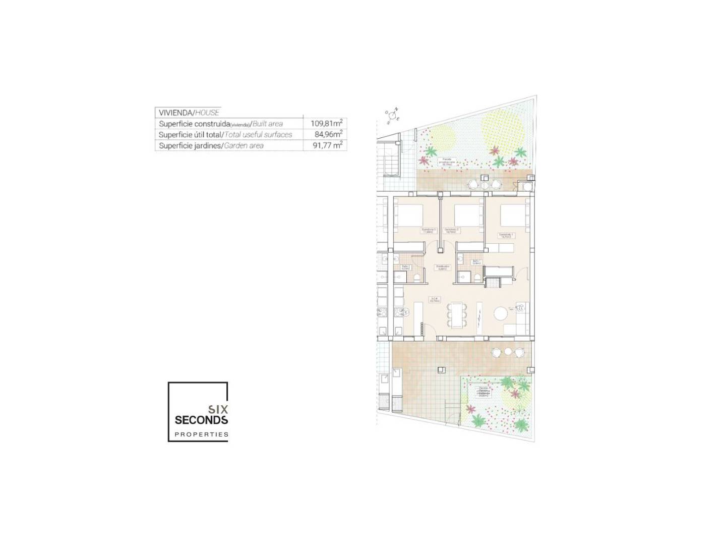 De woningen zijn beschikbaar op de begane grond met een voor- en achterterras/tuin en op de bovenste verdieping met een terras en eigen solarium . De woningen op de eerste verdieping hebben fotovoltaïsche panelen op het dak om energie te besparen.