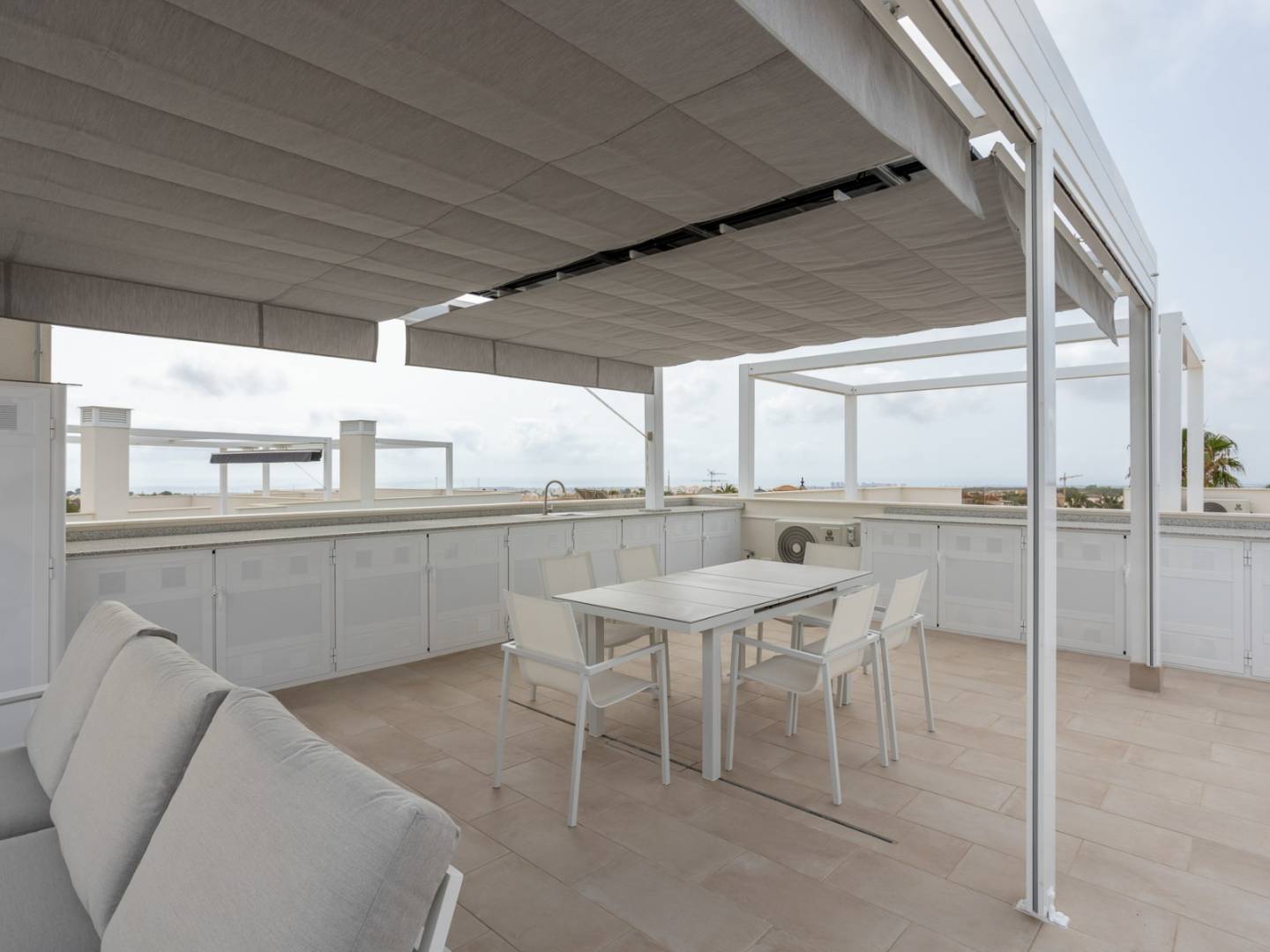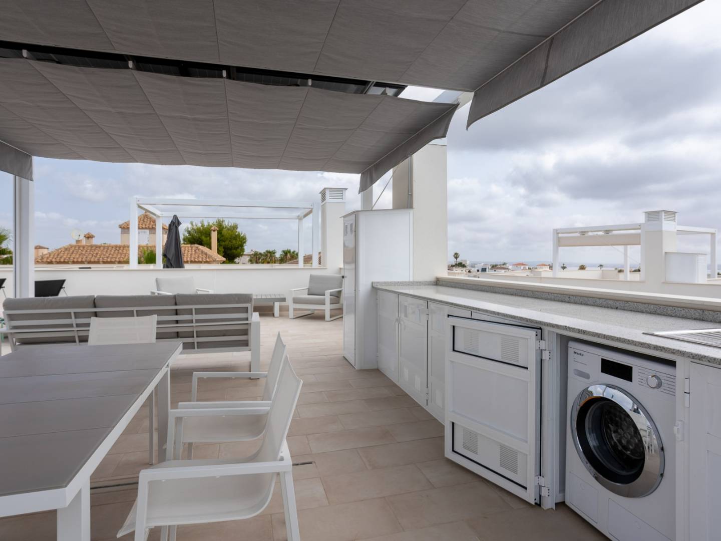 Dit uitstekende appartement met 2 slaapkamers en 2 badkamers in San Miguel de Salinas - Blue Lagoon biedt een comfortabele leefruimte van 80m2. Het penthouse ligt op de 1e verdieping en beschikt over een zeer mooie gemeenschappelijk zwembad en een ondergrondse privéparkeerplaats met een grote afsluitbare berging. Het appartement heeft een open keuken, dewelke perfect is voor ontvangst van uw gasten en is volledig ingericht met huishoudelijke apparaten. Het pand beschikt over een prachtig solarium, van waaruit ook de zee te zien is en beschikt over een mooie , grote en complete buitenkeuken, welke zelfs nog extra berging geniet! Uiteraard geniet het pand van een airconditioning, maar ook een alarm en een versterkte deur zorgen voor extra veiligheid. Het balkon, dewelke bereikbaar is vanaf de leefruimte, biedt een heerlijke plek om te genieten van het panoramische uitzicht. Gunstig gelegen op slechts 15 minuten van het strand, 45 minuten van de luchthaven en 5 minuten van zowel voorzieningen als golfbanen, is dit appartement ideaal voor mensen die op zoek zijn naar een rustige levensstijl met goede verbindingen. Het gemeenschappelijk zwembad, de garage en het intercomsysteem dragen bij aan het gemak en comfort van deze woning. Met de extra's van een zonnescherm, horren en een buitenkeuken/BBQ-plek biedt dit appartement een heerlijke woonervaring. Mis de kans niet om dit prachtige pand te bezichtigen!