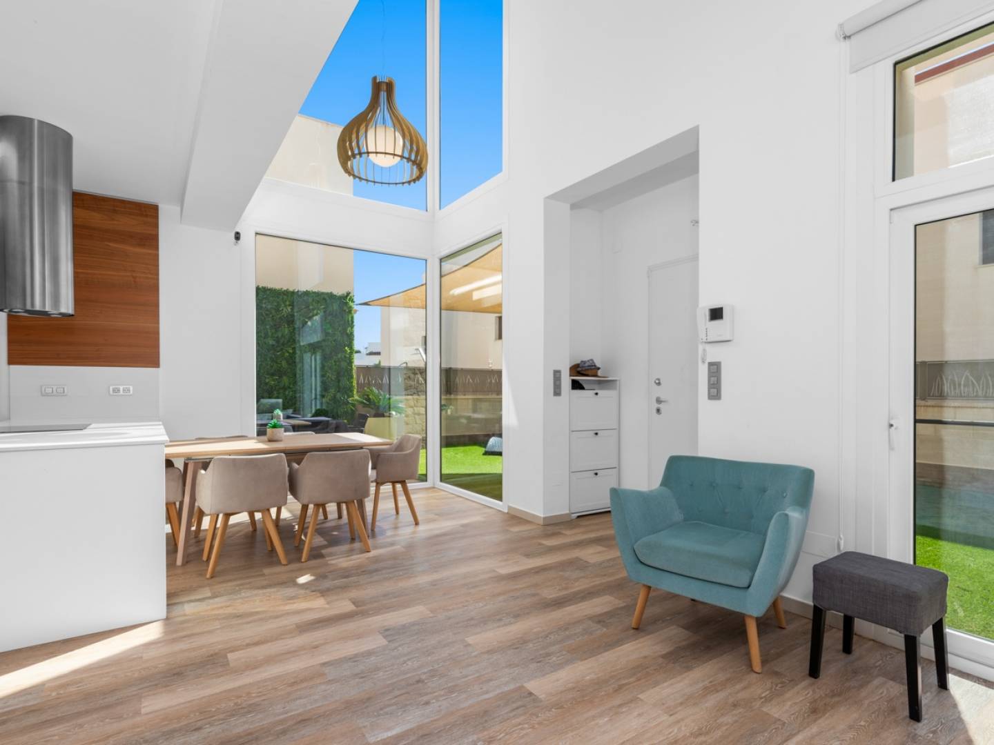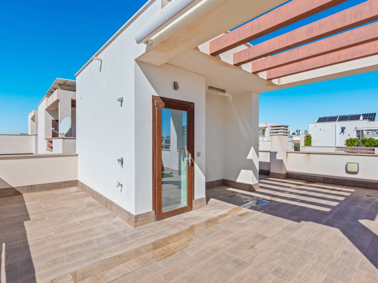 Gelegen in een wooncomplex van 50 onafhankelijke woningen, biedt dit pand een functionele indeling en comfortabele woonruimtes. Gebouwd in 2018, heeft het een totale oppervlakte van 101 m² op een perceel van 182 m², met drie slaapkamers en drie badkamers. De begane grond omvat een woonkamer met een geïntegreerde keuken, een complete badkamer, een slaapkamer en een wasruimte uitgerust met een 8 kg wasmachine en droger. De eerste verdieping heeft twee extra slaapkamers, waarvan één met een en-suite badkamer en toegang tot een privéterras. De bovenste verdieping heeft een solarium met ruimte voor een buitenkeuken en een jacuzzi-installatie. Het buitengedeelte omvat een privé zoutwaterzwembad met een automatische afdekking, een kunstgrastuin en een aangewezen parkeerplaats op het perceel. Het huis is uitgerust met een aerothermisch verwarmings- en koelsysteem, twee automatische luifels en een zonnezeil voor schaduw. Extra functies omvatten ingebouwde keukenapparatuur, een Bosch Wi-Fi volautomatische koffiemachine, automatische jaloezieën, horren op ramen en deuren, glazen douchecabines, een binnen- en buitenbeveiligingssysteem en een kluis. Het pand is gelegen in een rustige omgeving met goede toegang tot nabijgelegen stedelijke centra. Voor meer informatie of om een bezichtiging te plannen, neem dan contact met ons op.