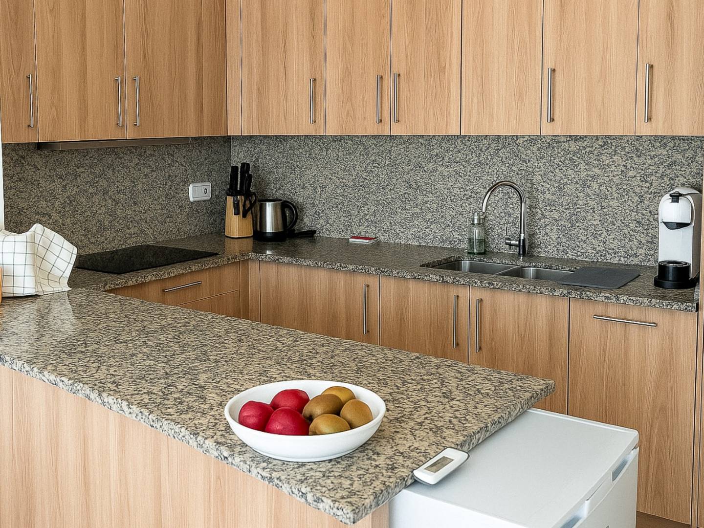Het hoofdhuis beschikt over een ruime woon- / eetkamer met aansluitend een volledig uitgeruste open keuken met vaatwasser , oven , Siemens inductiekookplaat en grote koelkast . Vanuit de keuken heeft u direct toegang tot een groot terras van 150 m² – ideaal om te genieten van het mediterrane klimaat en de omliggende natuur.