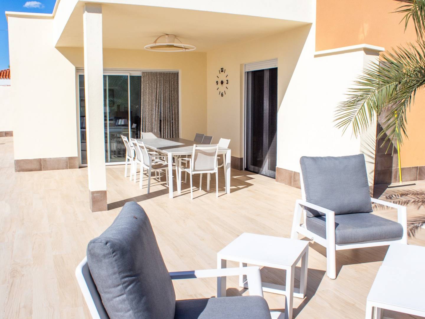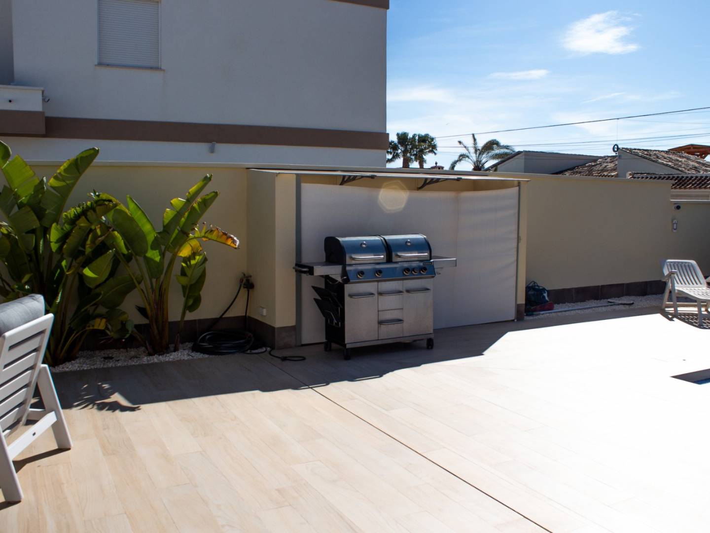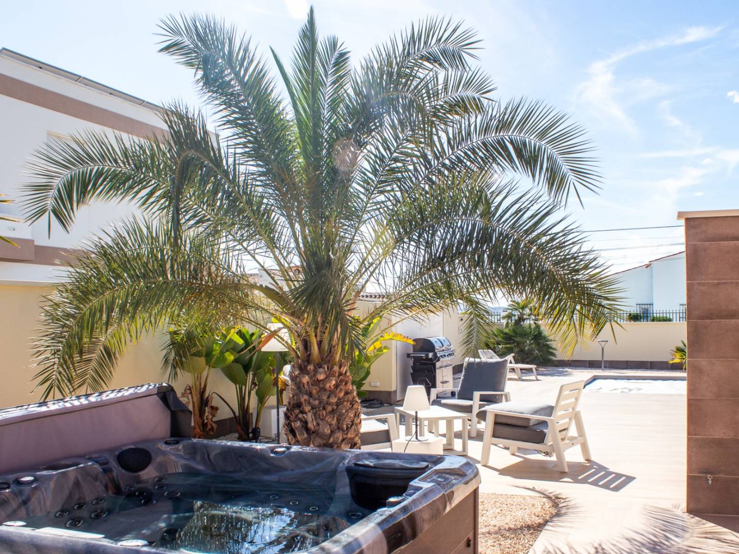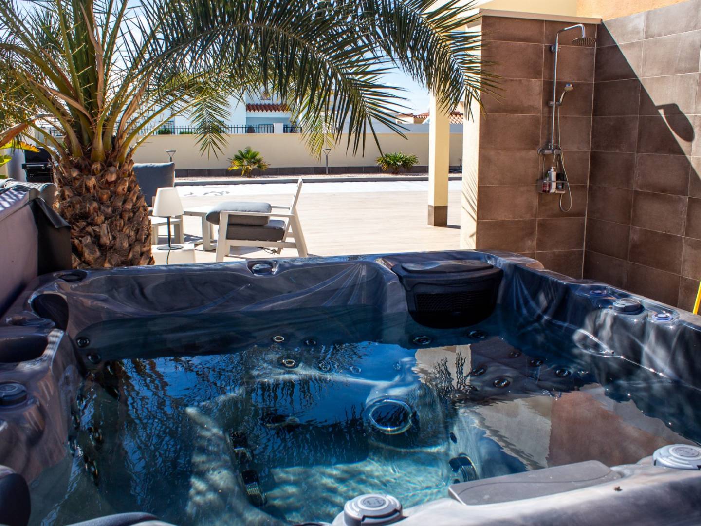 De woning beschikt over twee grote terrassen , een privézwembad van 10 x 4,5 meter , een hot tub en een buitendouche met warm water . Er is ook een overdekte carport aanwezig, die uitstekende zonbescherming biedt voor uw voertuig.