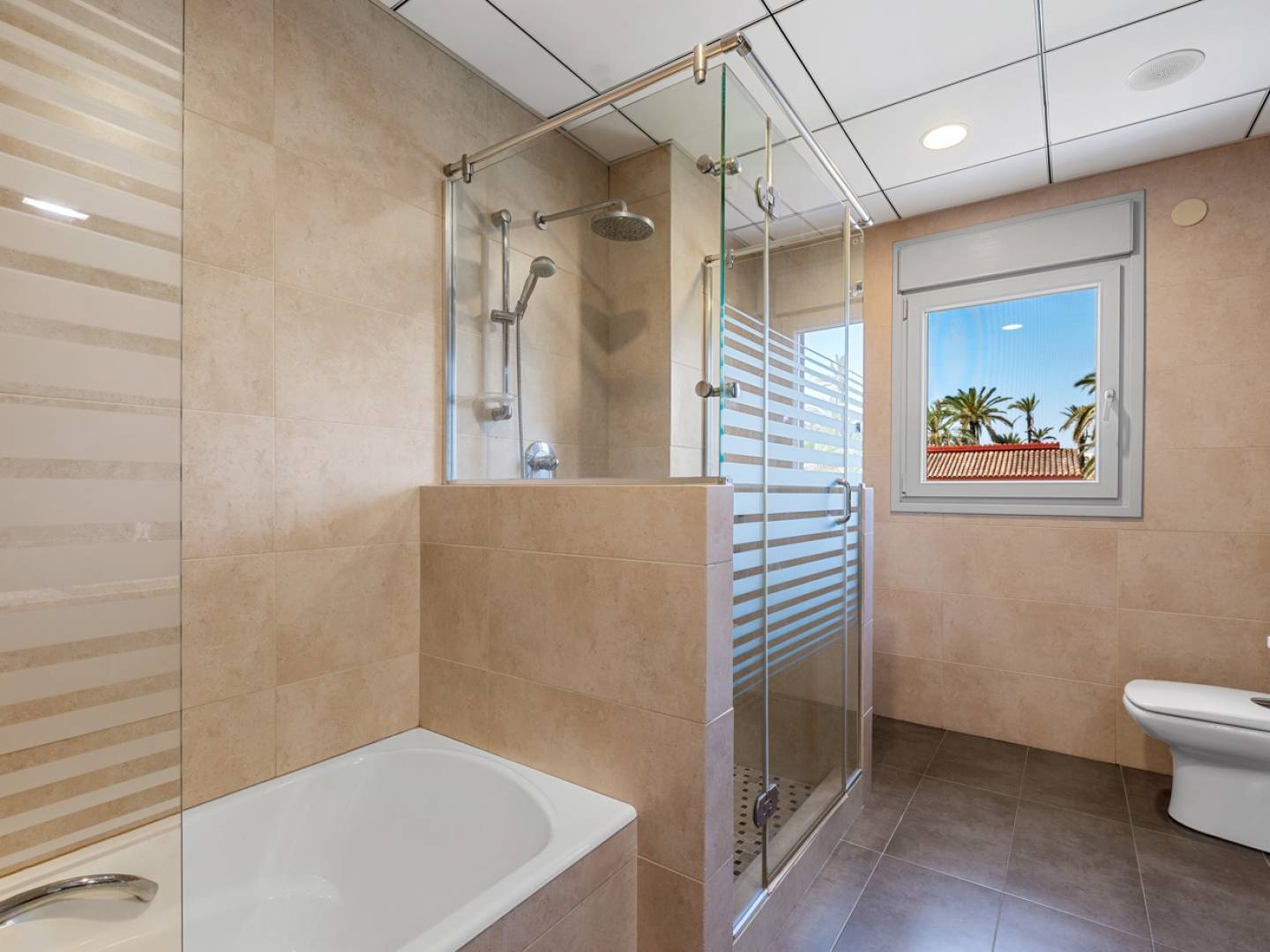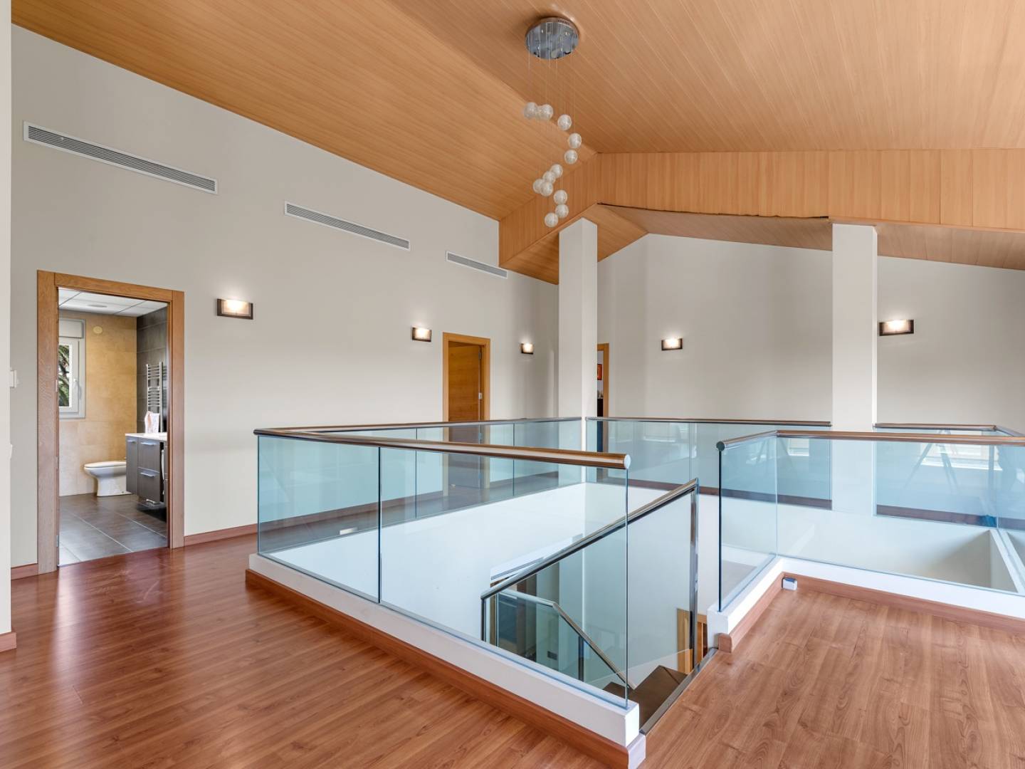 Op de begane grond vindt u een hal die toegang biedt tot een lichte woonkamer, een design-eetkeuken, een gezinswoonkamer die kan worden omgebouwd tot slaapkamer, een kantoor, een wasruimte, een berging en een complete badkamer. Boven vindt u de master suite met kleedkamer en en-suite badkamer. Verder vindt u er nog twee slaapkamers, een extra complete badkamer en een eigen balkon met vrij uitzicht.