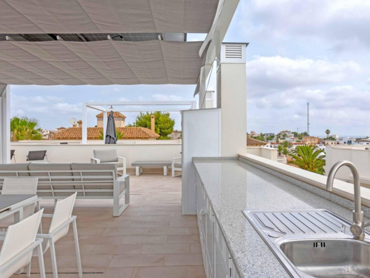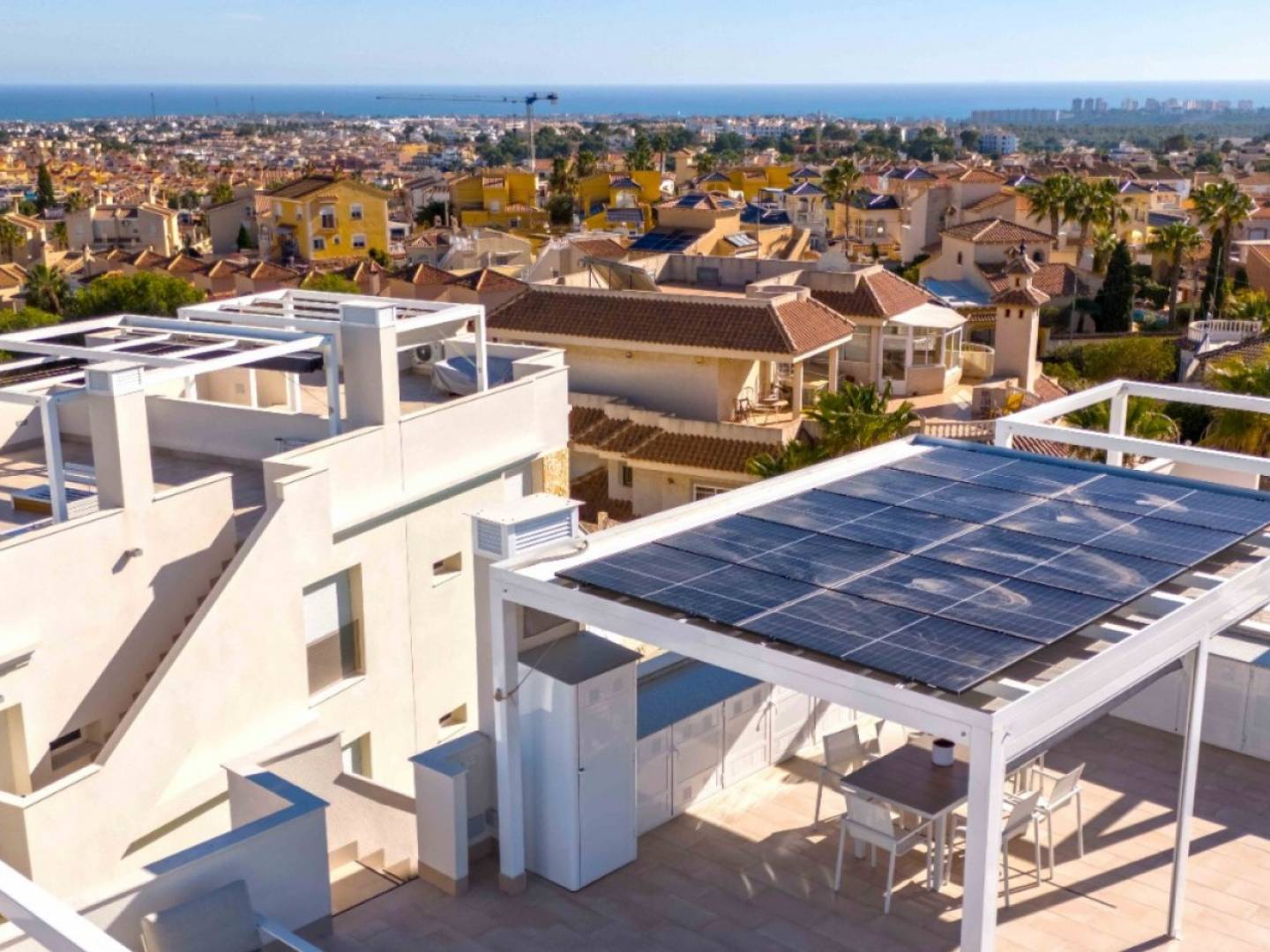 Ontdek Verhoogd Wonen in het Blue Lagoon-gebied Welkom bij dit exclusieve wooncomplex bestaande uit twee stijlvolle gebouwen met elk zes boutique-units. Gelegen in een oase van rust, combineert dit prachtige penthouse met 2 slaapkamers en 2 badkamers moderne luxe, adembenemende uitzichten en uitmuntende efficiëntie. Modern Design en Ongeëvenaard Uitzicht Stap binnen in een ruimte waar welzijn, efficiëntie en licht centraal staan. Dit penthouse van 79 m² heeft een open indeling met dubbelglasramen die elke hoek overspoelen met natuurlijk licht. Het hoogtepunt is het 87 m² grote privé-dakterras met uitzicht op de zee, zoutmeren en bergen. Geniet van meer dan 3.000 zonuren per jaar, met majestueuze zonsopgangen en zonsondergangen. Comfort en Duurzaamheid Gecombineerd Luxe en duurzaamheid smelten samen op het dakterras, voorzien van een buitenkeuken, een ruime pergola met horizontale en verticale zonwering, en 4100-watt zonnepanelen voor uw energiebehoeften. Een wasmachine en koelkast-vriezer zijn discreet geïntegreerd op het terras. Wonen in Resortstijl Ontspan bij het elegante gemeenschappelijke zwembad, ontworpen met oog voor uw welzijn en dat van uw familie. Het complex biedt bovendien een privéparkeerplaats en een berging voor extra gemak. Volledig Gemeubileerd en Instapklaar Dit penthouse wordt volledig gemeubileerd en in perfecte staat aangeboden, klaar om uw droomleven te beginnen. Belangrijkste Kenmerken: 165 m² totale oppervlakte (79 m² bruikbare ruimte)2 ruime slaapkamers en 2 badkamersPrivéparkeerplaats inbegrepenPrivébergingIngebouwde kastenAirconditioningGemeenschappelijk zwembad en groene zones De Perfecte Ontsnapping Ontsnap aan de drukte en kom tot rust in deze serene oase. Blue Lagoon roept bent u klaar om te antwoorden? Boek nu uw bezichtiging!