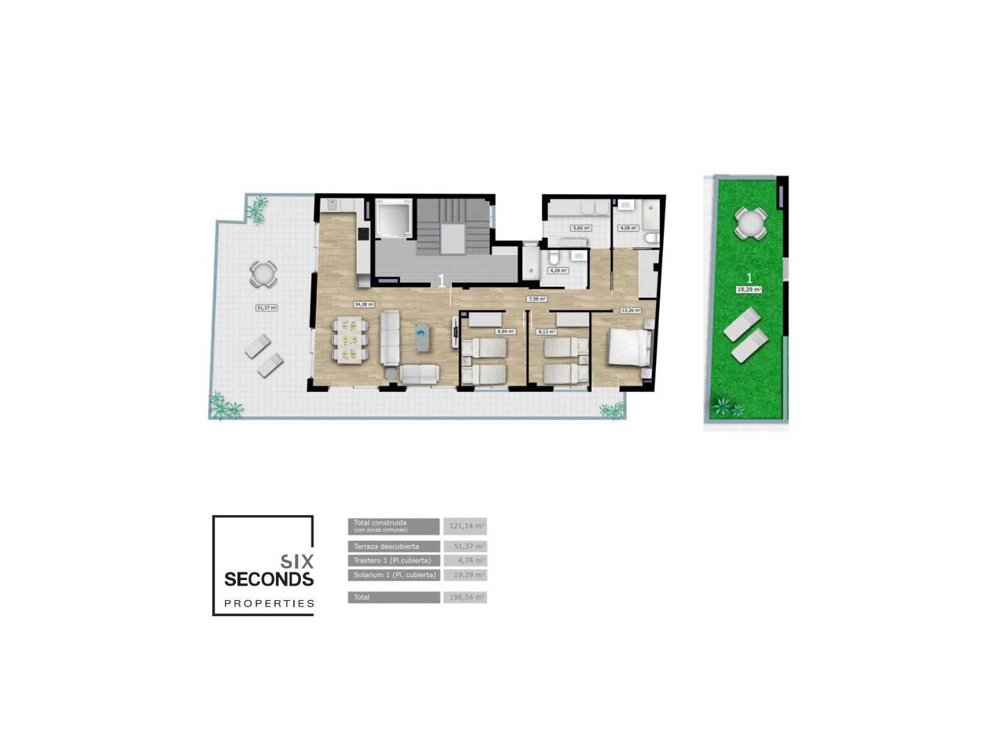 Op de bovenverdieping vindt u een privé-solarium van 19,29 m². Hier kunt u uw eigen oase creëren: een ontspanningsruimte, een barbecueplek of zelfs een optionele hottub.