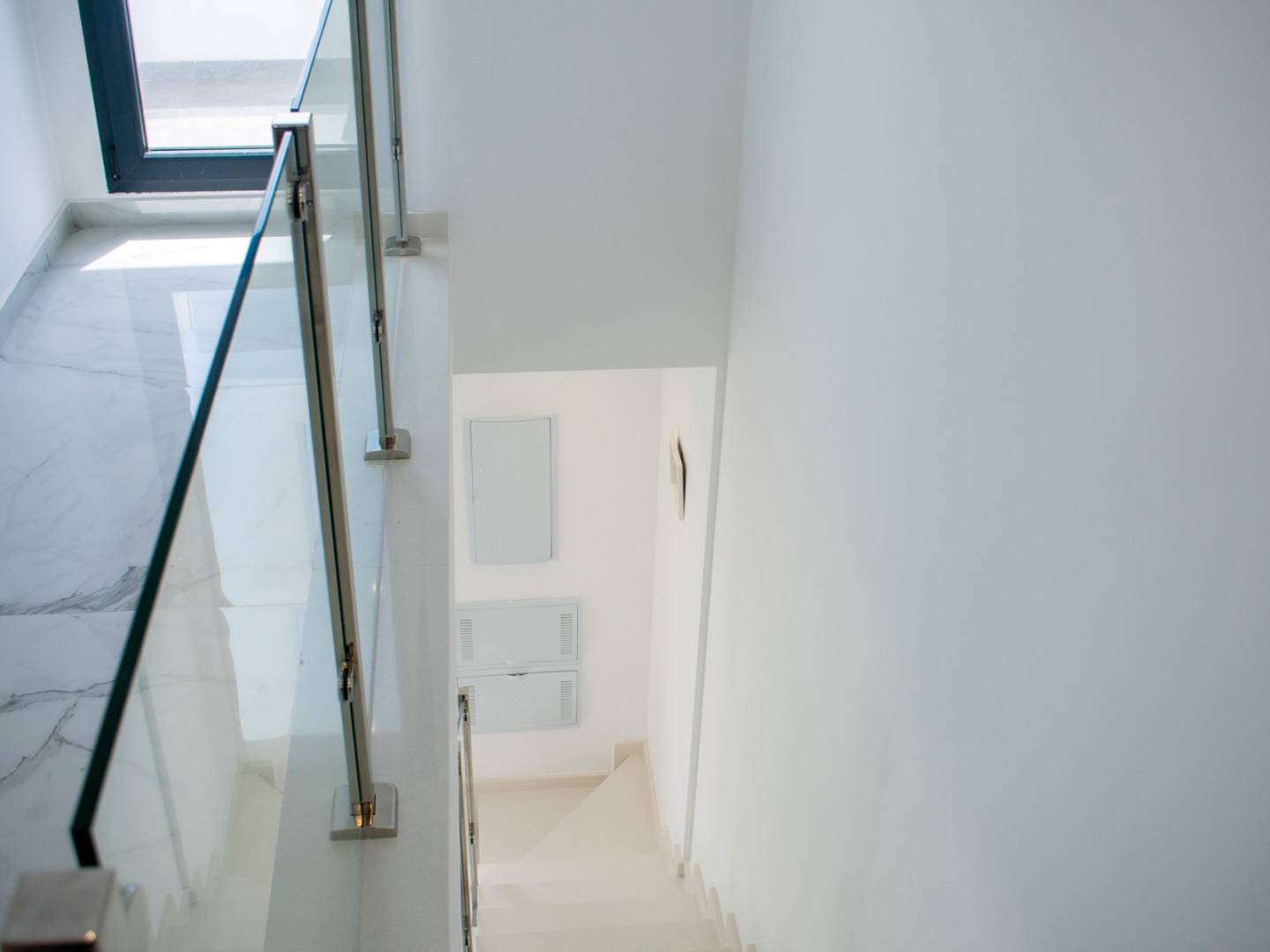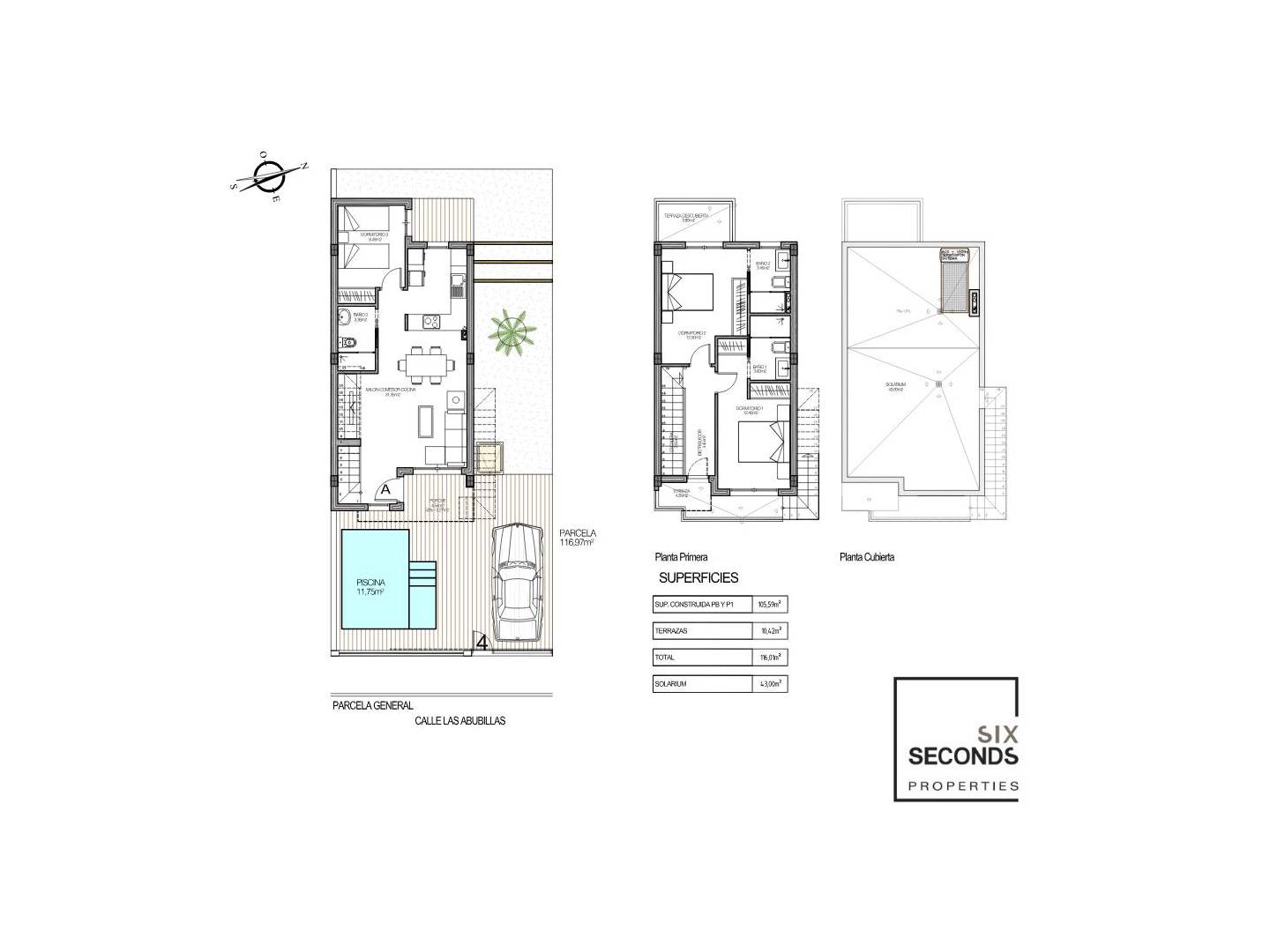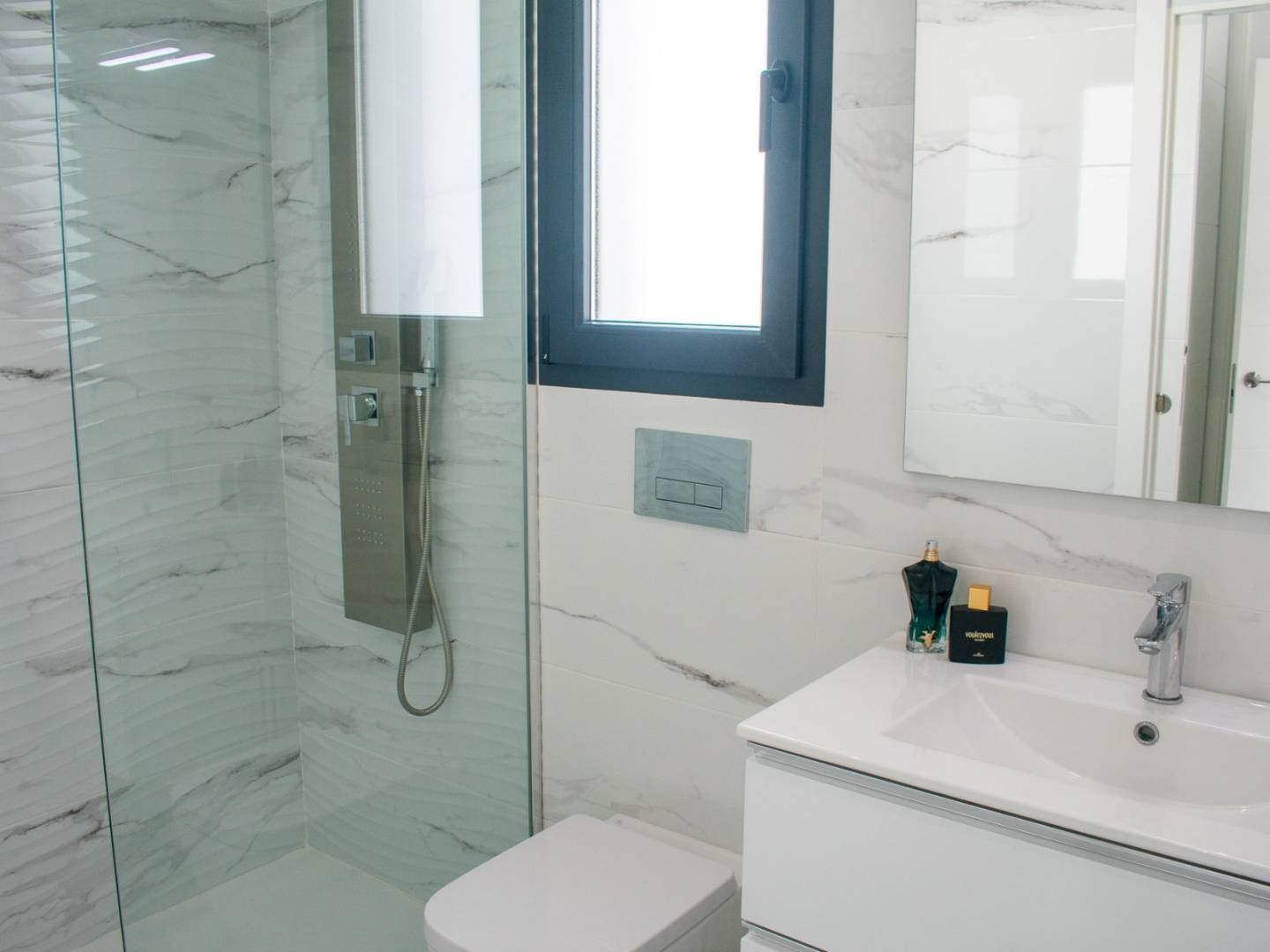 Met een perceeloppervlakte van 116 m² en een bebouwde oppervlakte van 106 m² is de woning verdeeld over twee verdiepingen. Op de begane grond vindt u een lichte woon-eetkamer met open keuken , een tweepersoonsslaapkamer en een complete badkamer , allemaal op één niveau. Boven bevinden zich twee ruime slaapkamers met en-suite badkamers en directe toegang tot een privésolarium met een adembenemend uitzicht op de Roze Lagune van Torrevieja .