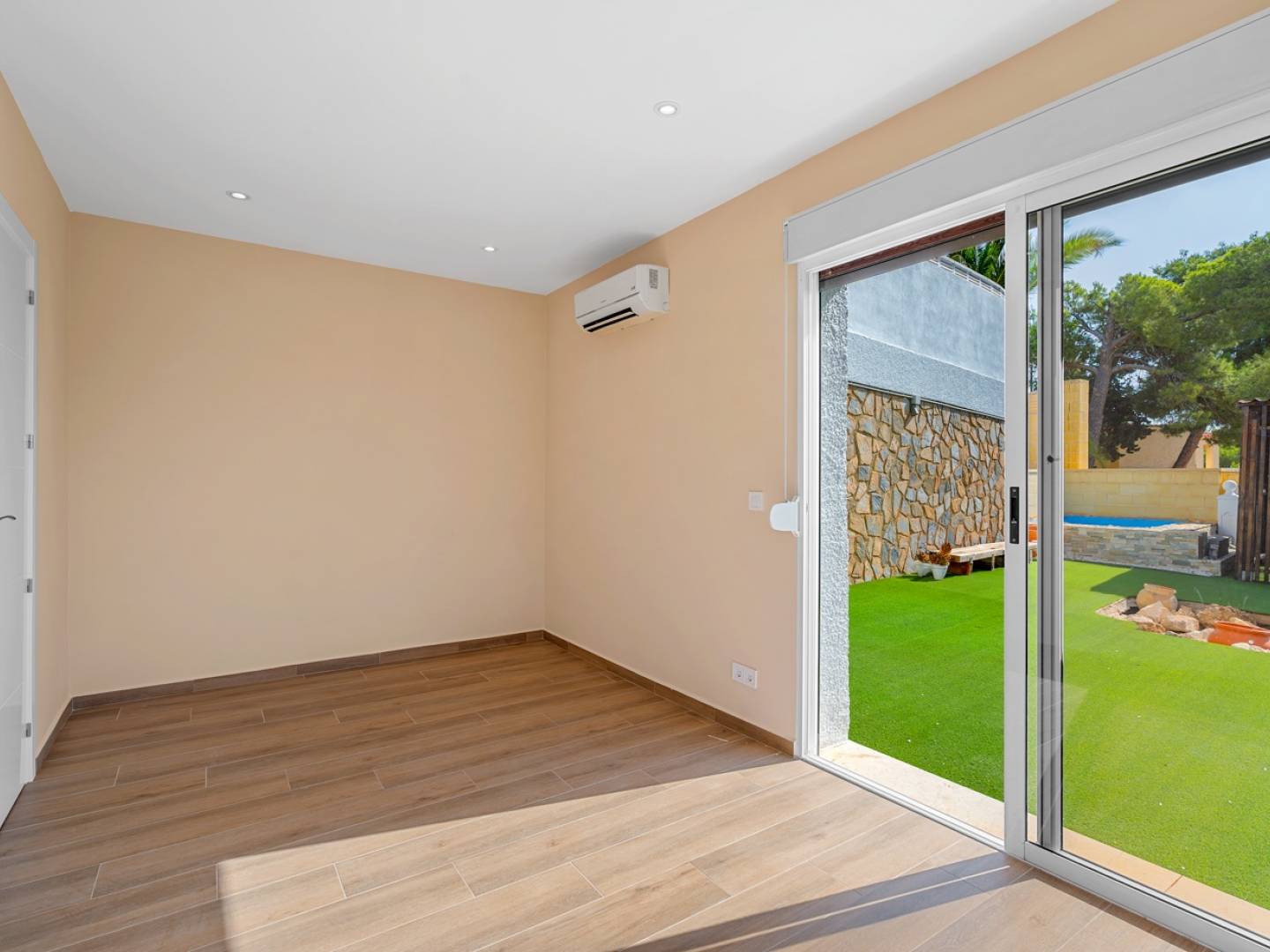 Op de begane grond bevinden zich vier tweepersoonsslaapkamers, waarvan twee met directe toegang tot de tuin, evenals twee badkamers en een ruime ontspanningsruimte. Vanaf hier heeft u toegang tot het privézwembad van 36 m², omgeven door een elegant zonneterras, een overdekte bar, een pizzaoven en een houten veranda. Alles ontworpen om optimaal te profiteren van het bevoorrechte klimaat van de Costa Blanca.