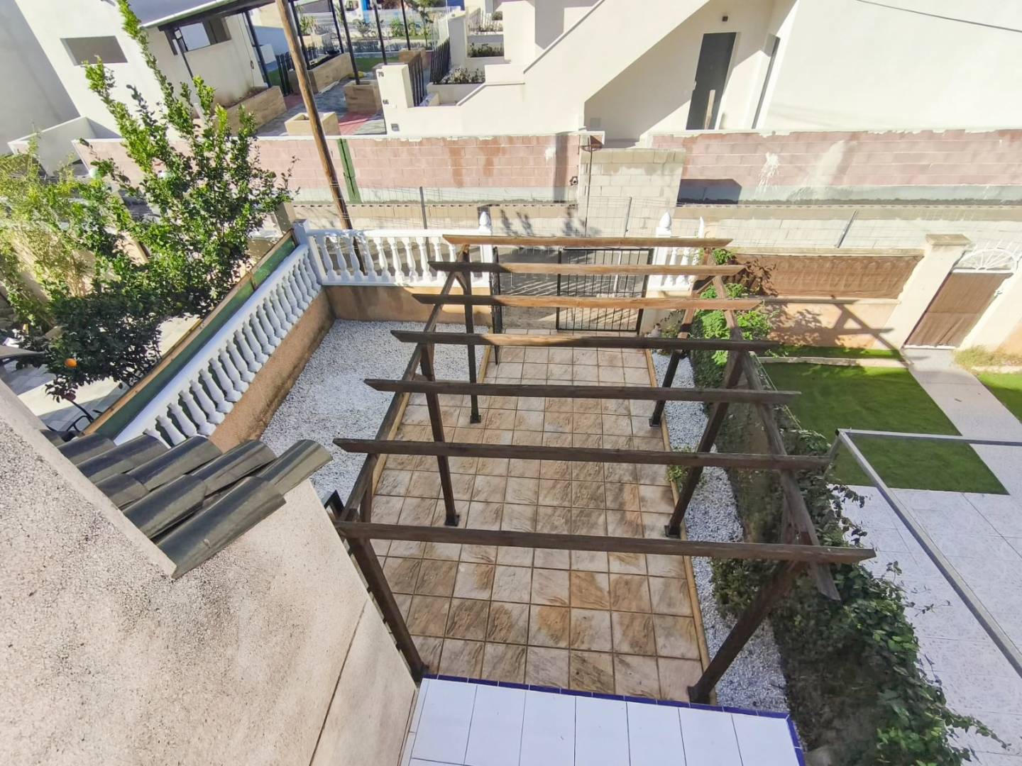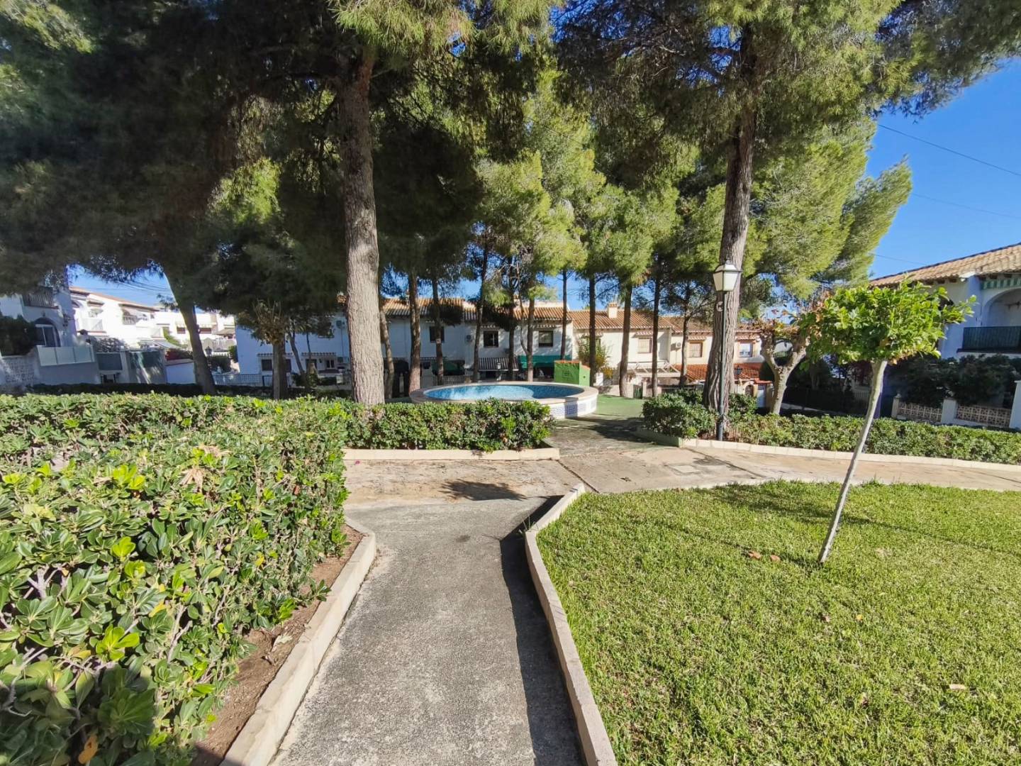 Deze charmante geschakelde bungalow-duplex is gelegen in Torrevieja, in de gevestigde wijk Los Balcones, binnen het residentiële complex Lago Jardín II. De omgeving is rustig en goed onderhouden, op slechts 4 km van de stranden van Torrevieja en dicht bij een breed scala aan voorzieningen zoals supermarkten, restaurants, bars en recreatiemogelijkheden, ideaal voor zowel permanente bewoning als vakantieverblijf. De woning is verdeeld over twee verdiepingen en beschikt over een privé voortuin van ongeveer 30 m². De toegang tot de bungalow verloopt via een autovrije straat, wat zorgt voor extra rust en privacy. Het is niet mogelijk om met de auto tot aan de woning te rijden; parkeren kan in nabijgelegen aangewezen zones, met aanbevolen toegang via de straat Laguna Verde. Op de begane grond bevindt zich een lichte woon-eetkamer, een open keuken met bar en nieuwe keukenkasten, inclusief boven- en onderkasten, zwart marmeren werkblad, roestvrijstalen afzuigkap en elektrische boiler, evenals een slaapkamer en een complete badkamer. De bovenverdieping, bereikbaar via een interne trap, beschikt over twee met elkaar verbonden slaapkamers met toegang tot een ruim balkon-terras met aangenaam uitzicht. De voortuin combineert een betegeld gedeelte met witte grind en is momenteel voorzien van een houten prieel. Het complex beschikt bovendien over een gemeenschappelijk zwembad en groene zones. De bebouwde oppervlakte bedraagt 55 m², met een voortuin van 30 m².