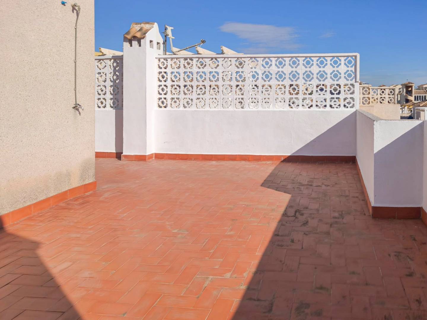 Deze uitstekende bungalow is gelegen in Orihuela Costa, binnen het residentiële complex Serena V, in een omgeving met een breed aanbod aan voorzieningen zoals supermarkten, restaurants, bars en recreatiemogelijkheden, met een levendige sfeer het hele jaar door. De woning is zeer licht en beschikt over twee toegangen tot het privéperceel, één voor voetgangers en één met toegang voor voertuigen. De entreeveranda is volledig afgesloten met metalen kozijnen en biedt een extra, zeer functionele ruimte. Op de begane grond bevinden zich een woon-eetkamer, een aparte keuken met bijkeuken, een complete badkamer en twee slaapkamers, waarvan één met ingebouwde kast. Daarnaast is er een berging aangebouwd aan de woning, met onafhankelijke toegang vanaf het perceel. De bovenverdieping, bereikbaar via een interne trap, beschikt over een badkamer en een slaapkamer met ingebouwde kast, verbonden met een ruim balkon en een groot solariumterras van circa 39 m². Het complex beschikt over een gemeenschappelijk zwembad en goed onderhouden gemeenschappelijke ruimtes. De bebouwde oppervlakte bedraagt 75,98 m², aangevuld met 39,19 m² solarium en een voortuin.