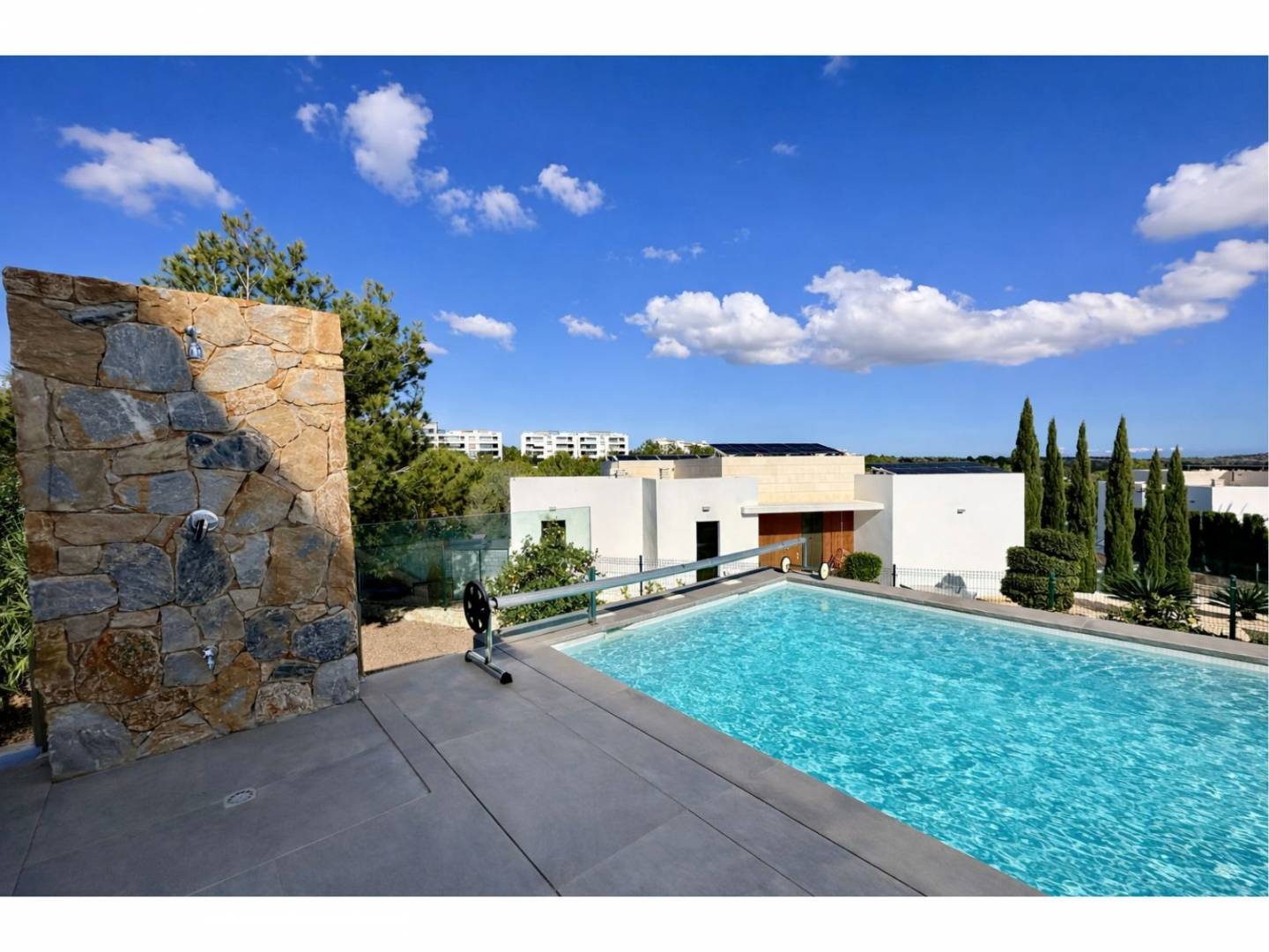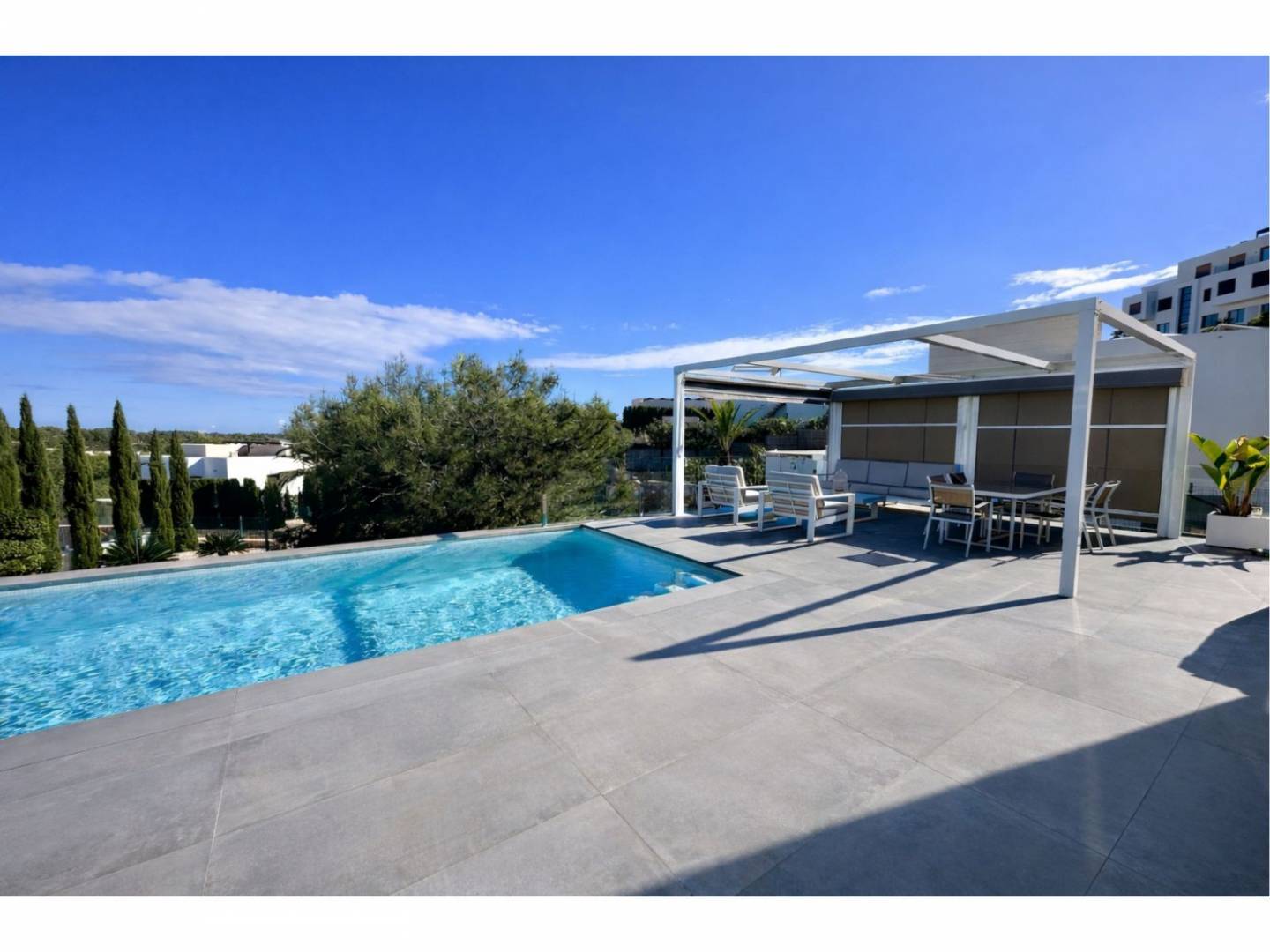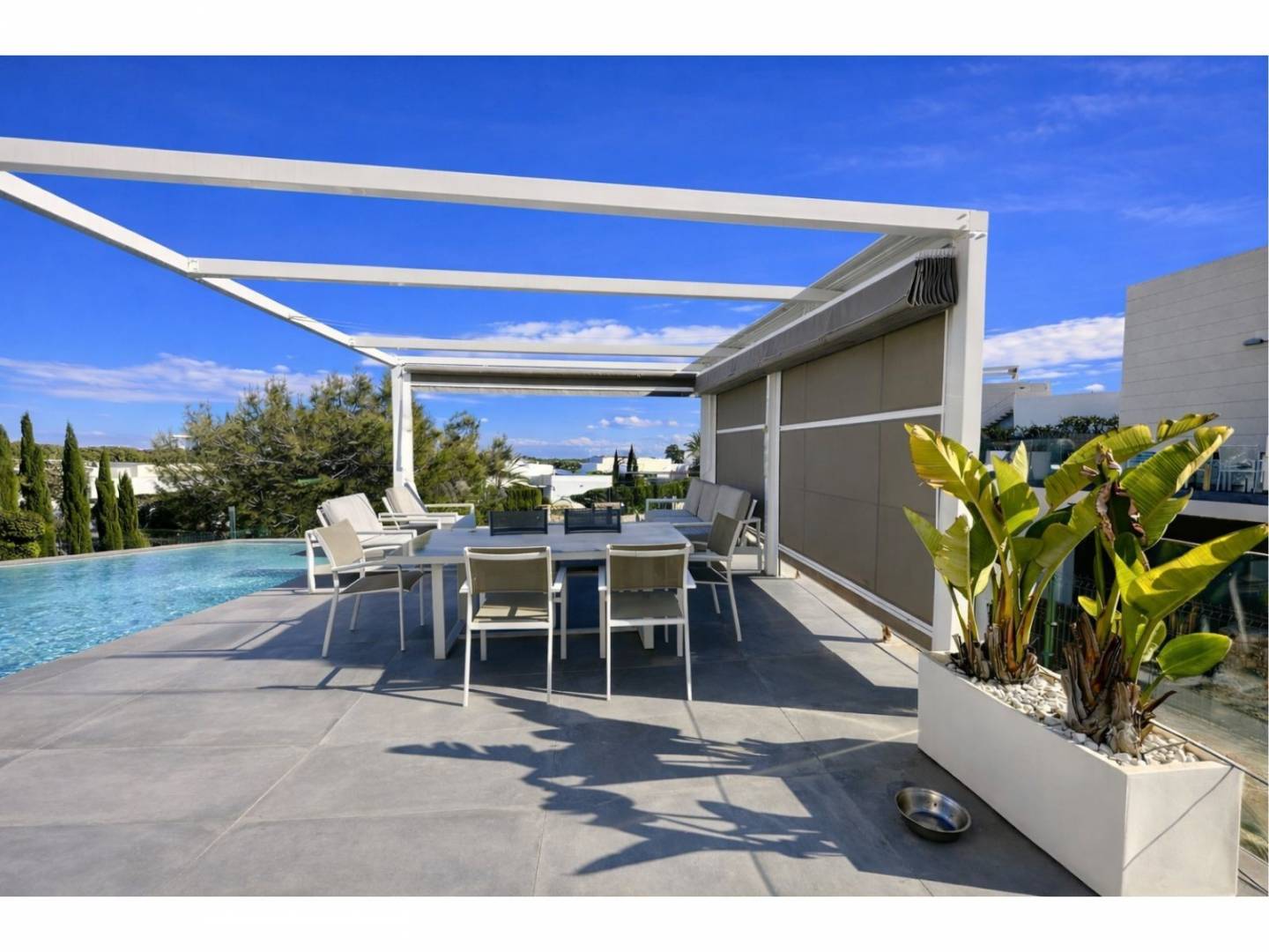 De villa beschikt over hoge plafonds en uitzonderlijk veel natuurlijk licht , wat resulteert in ruime en elegante woonruimtes. Het hart van de villa wordt gevormd door een lichte woonkamer met een volledig uitgeruste open keuken , die via een spectaculaire erker verbonden is met een terras van 87 m² op het zuiden – ideaal om het hele jaar door te genieten van het mediterrane klimaat. Buiten biedt een verwarmd zoutwaterzwembad van 10 meter een rustgevend uitzicht op het dennenbos en zorgt voor een uniek gevoel van welzijn en exclusiviteit.