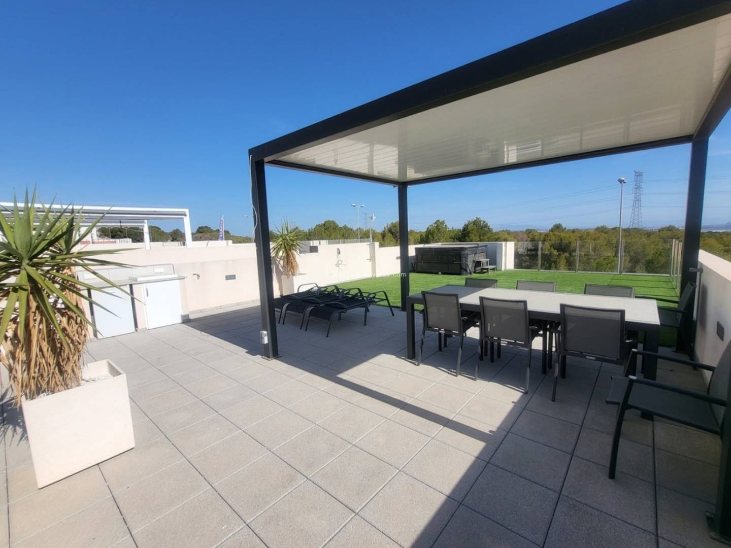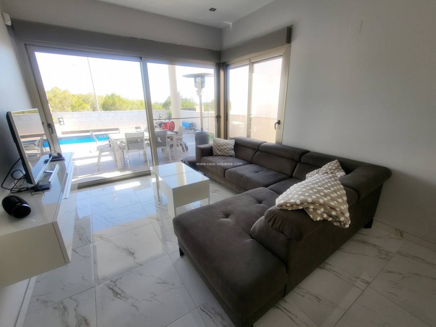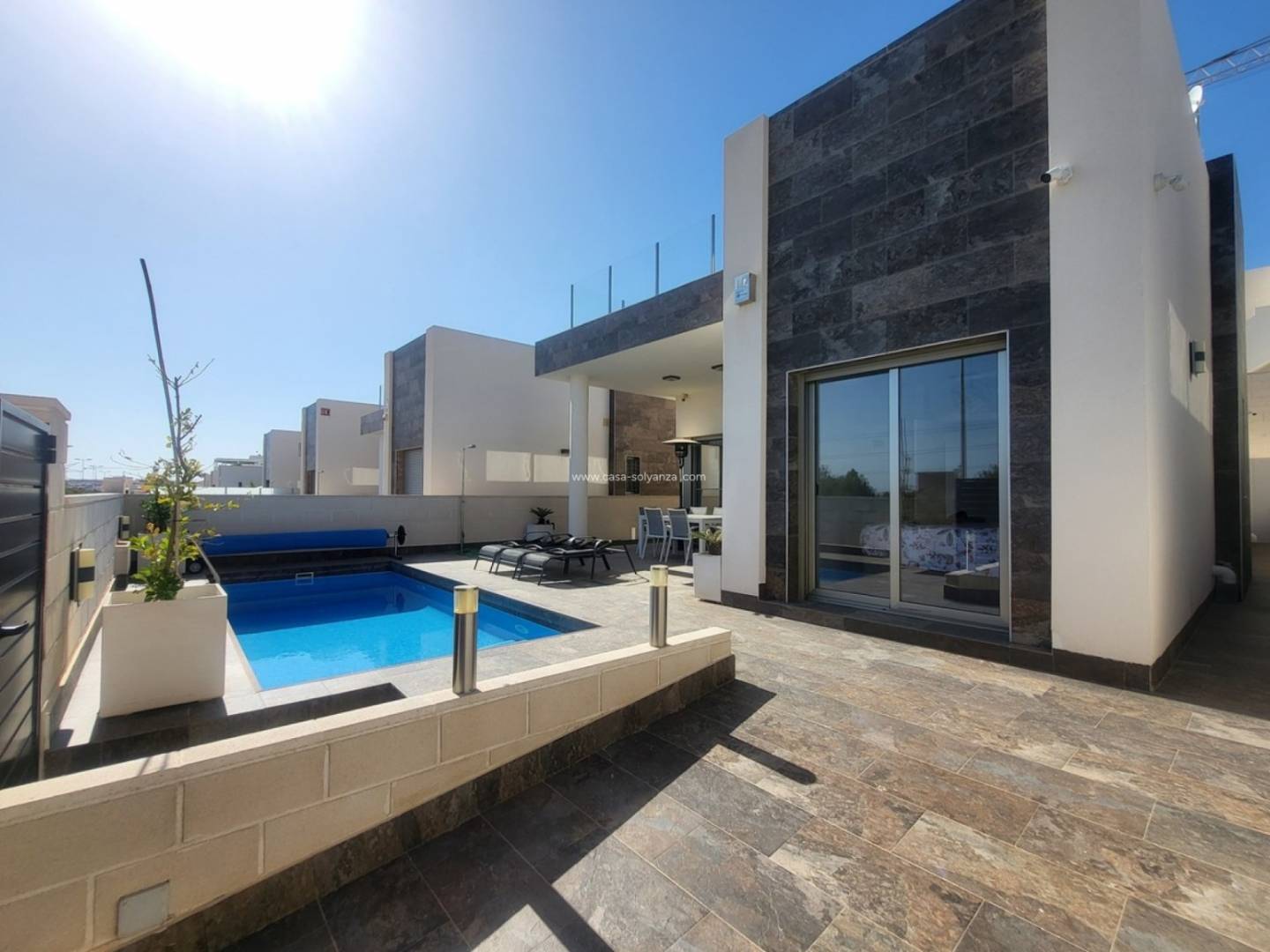 Ontdek deze prachtige, gelijkvloerse designvilla in een exclusieve woonwijk . De villa biedt een bevoorrechte omgeving die privacy, modern design en ongerepte natuur combineert. De woning beschikt over drie ruime slaapkamers met inbouwkasten en twee badkamers , waarvan één en suite , voor een comfortabele en functionele indeling. De lichte woon- en eetkamer , overspoeld met natuurlijk licht dankzij grote erkers, komt direct uit op de tuin en zorgt voor een harmonieuze overgang tussen binnen en buiten. De volledig uitgeruste open keuken loopt naadloos over in de woonkamer en wordt aangevuld door een aparte bijkeuken met opbergruimte. De villa is voorzien van slimme domotica , wat zorgt voor optimaal comfort, verbeterde beveiliging en een uitstekende energie-efficiëntie . Buiten wachten een privézwembad en een spectaculair solarium van 104 m² op u, compleet met een volledig uitgeruste buitenkeuken, zonnescherm, jacuzzi, wifi en een panoramisch uitzicht op de Salar de Uyuni in Torrevieja – een ware oase om te genieten van de mediterrane levensstijl. Exclusieve kenmerken zijn onder andere een alarmsysteem, bewakingscamera's, een intercom, individueel regelbare airconditioning in elke kamer, een berging buiten en een prachtig aangelegde tuin . De villa ligt vlakbij de golfbaan Villamartín , met gemakkelijke toegang tot supermarkten, restaurants en winkels , en op slechts 10 minuten rijden van de stranden van La Zenia en het winkelcentrum Zenia Boulevard . Het biedt een unieke investeringsmogelijkheid en een uitzonderlijke woonomgeving aan de Costa Blanca .