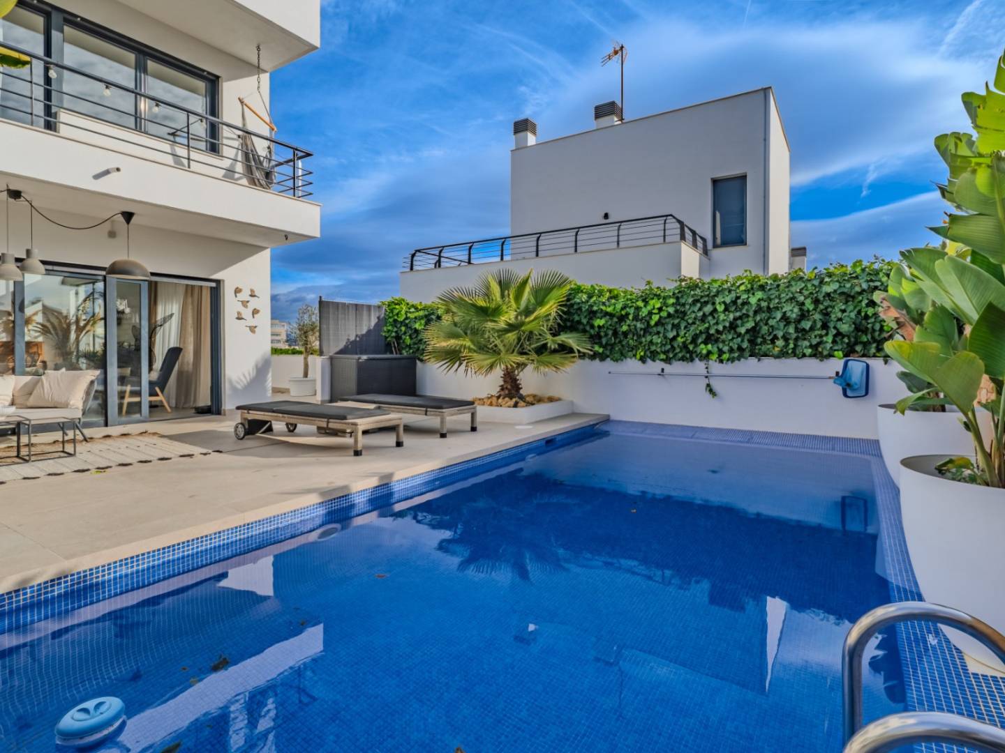 Deze woning met 7 slaapkamers en 5 badkamers biedt uitzonderlijke flexibiliteit en is ideaal voor grote gezinnen, maar ook voor mensen die extra gastenruimte, een kantoor of ontspanningsruimtes nodig hebben. De opvallend lichte interieurs worden aangevuld door terrassen en balkons die de leefruimte naadloos naar buiten uitbreiden en bewoners een ononderbroken uitzicht en een verkoelend zeebriesje bieden.